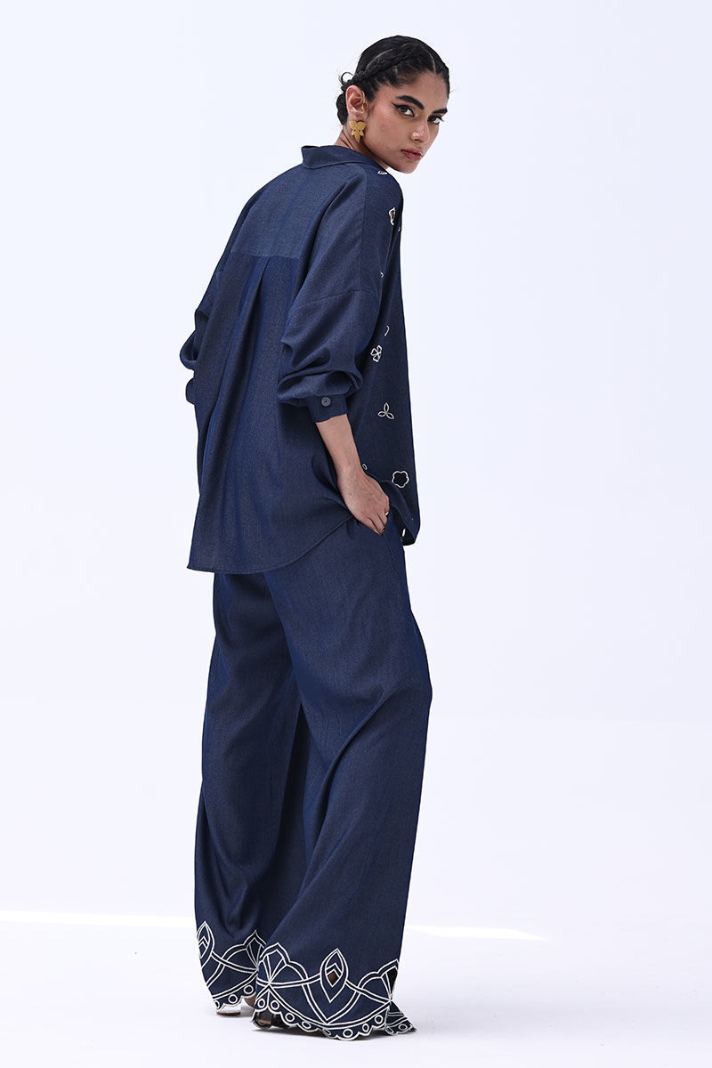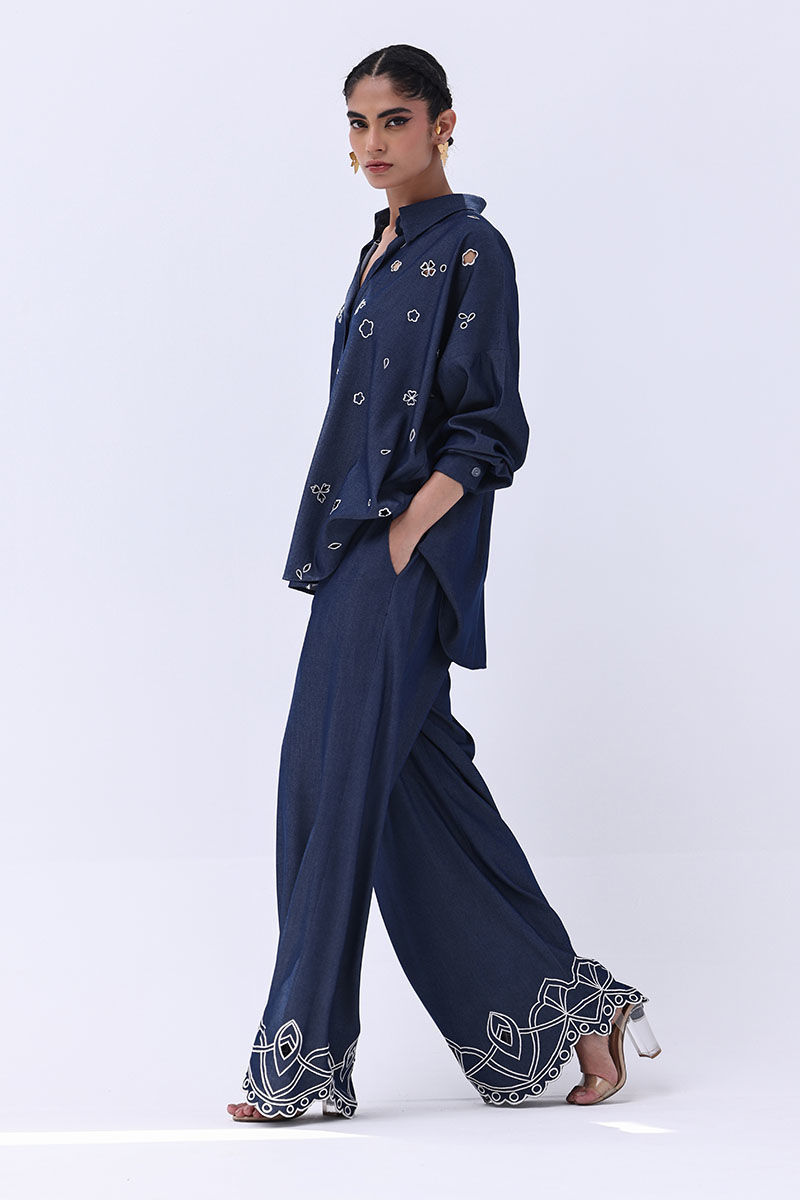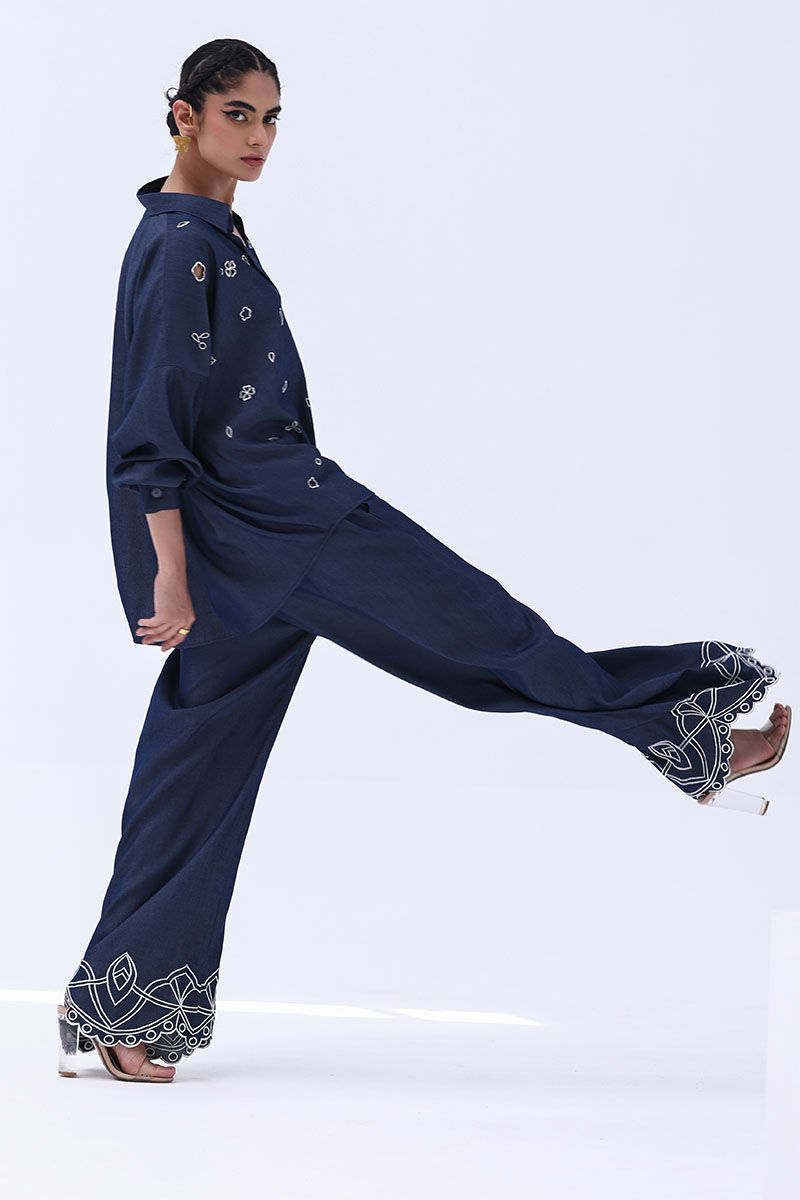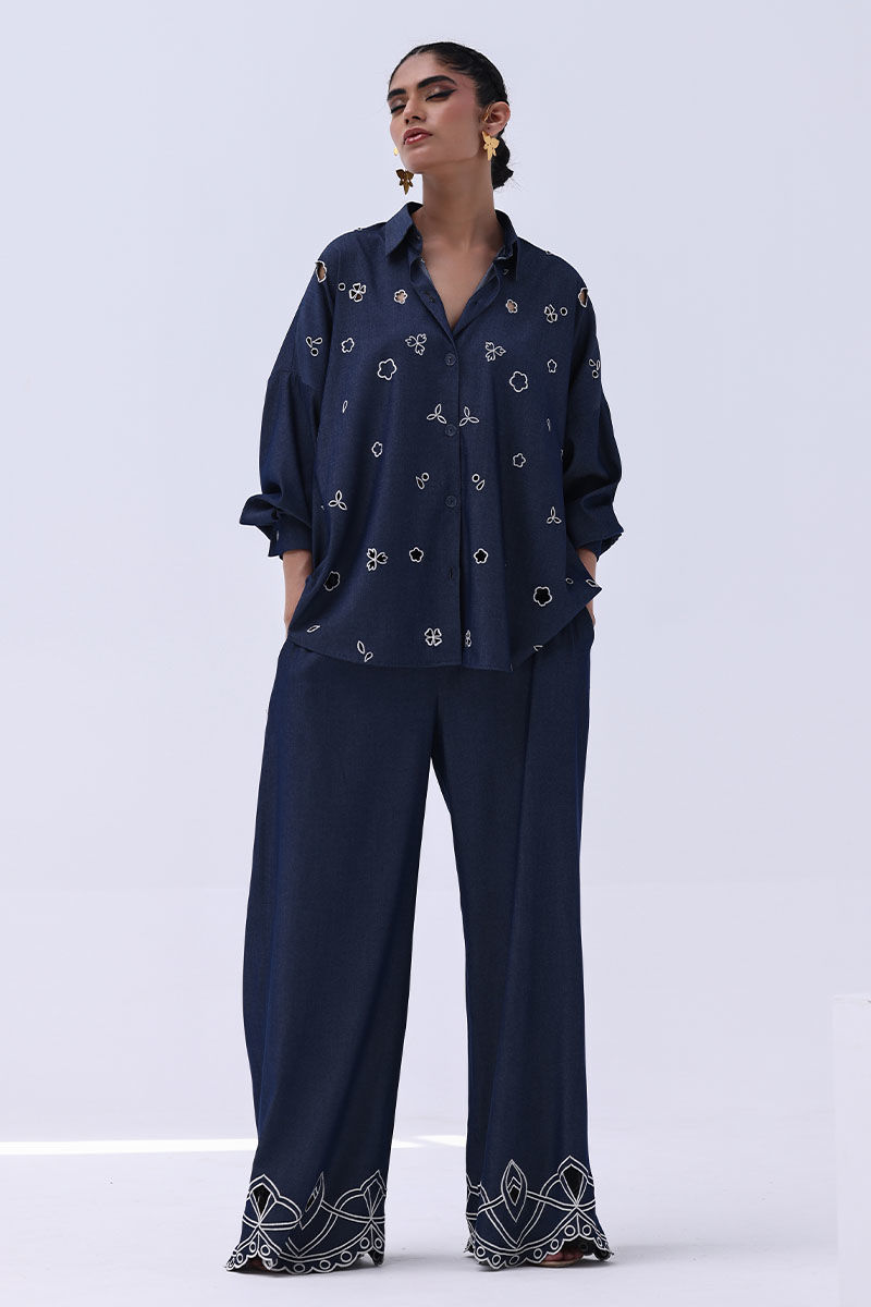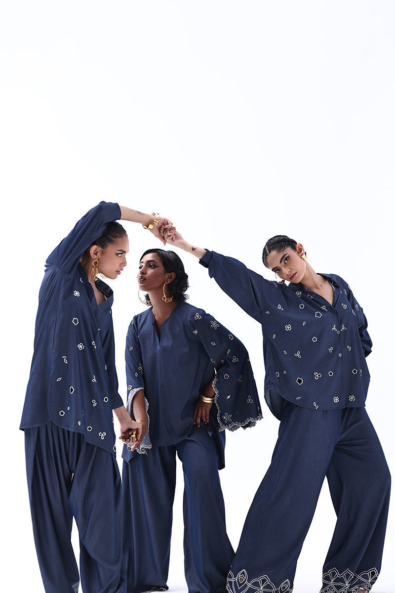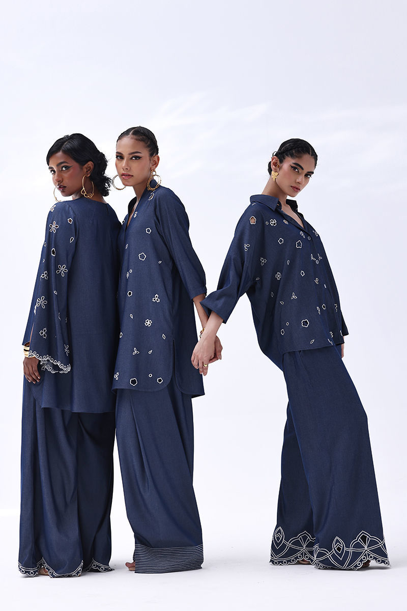 Refined and effortlessly chic, this Dark Blue Tencil Denim co-ord set features a shirt with all-over Resham embroidery and intricate cutwork, offering a richly textured, artisanal look. The coordinated culottes are finished with delicate Resham-embroidered scalloped hems, bringing harmony and elegance to the silhouette. A perfect blend of structure and softness, this top-and-culottes ensemble is ideal for contemporary festive wear or elevated everyday styling.