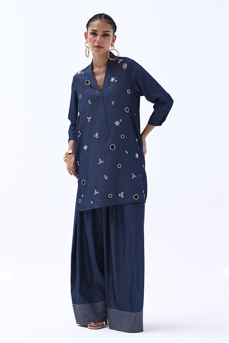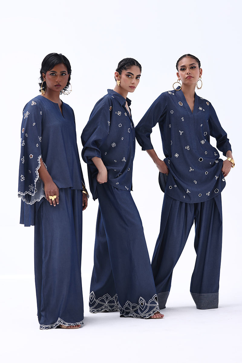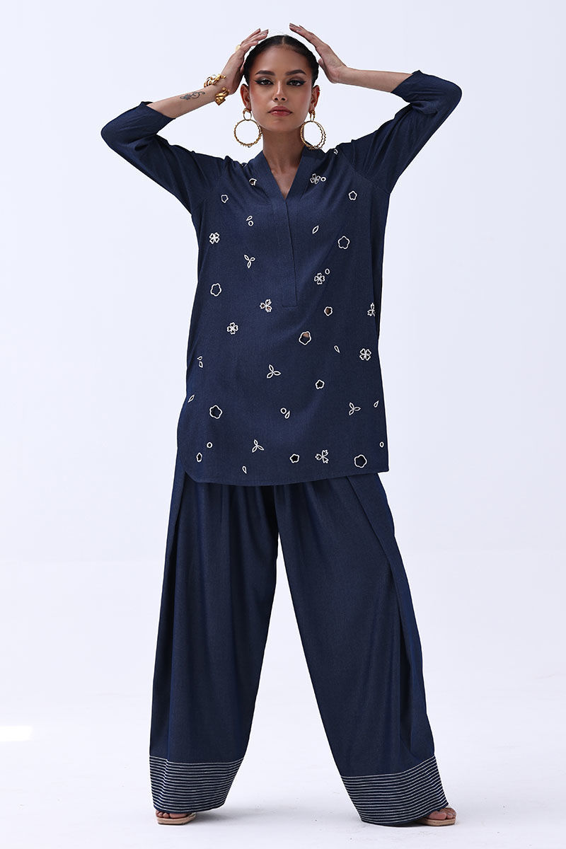 Color: Dark Blue Fabric: Tensil Denim Work Details: Shirt : All Over Resham Embroidery With Cutwork Shalwar: Resham Running Stitches On Bottom