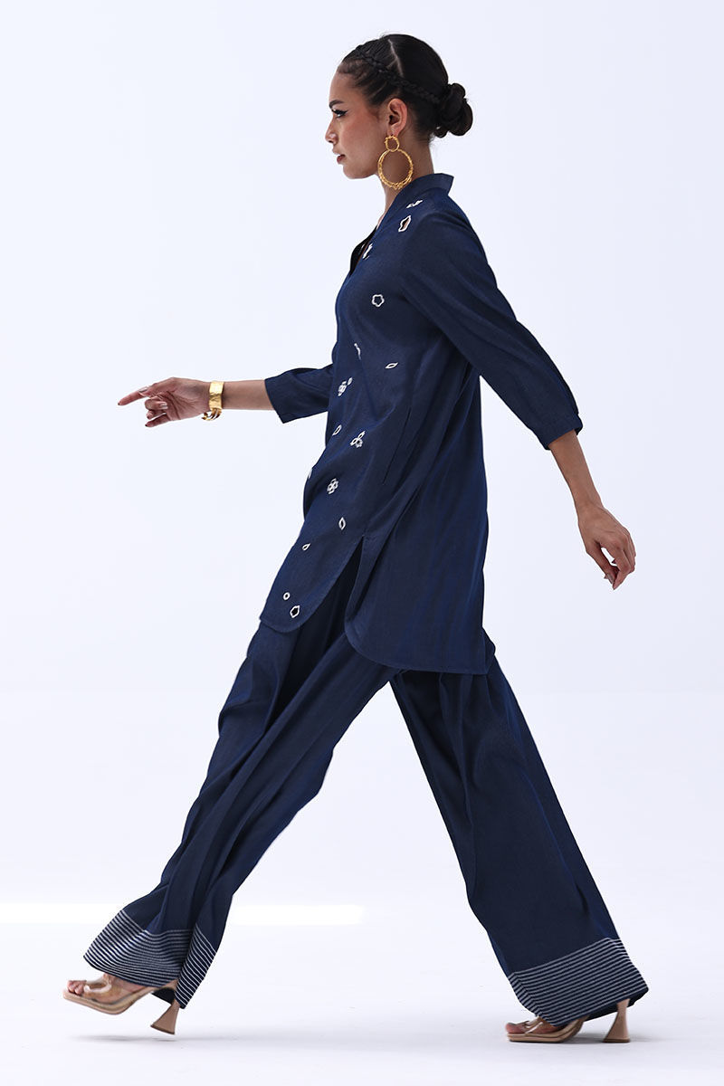 Elevate everyday elegance with this Dark Blue Tencil Denim outfit, featuring a shirt adorned with all-over Resham embroidery and intricate cutwork, offering a perfect blend of artistry and refinement. Paired with a matching shalwar detailed with subtle Resham running stitches at the bottom, this set delivers a graceful, coordinated look that transitions effortlessly from day to evening.