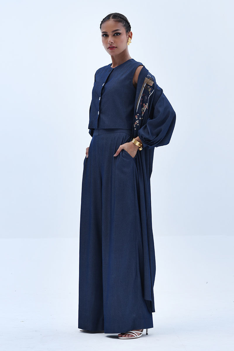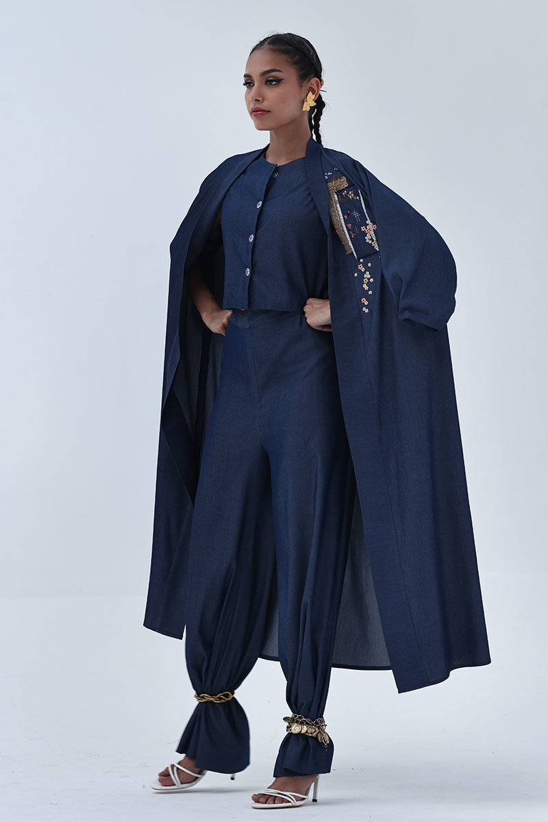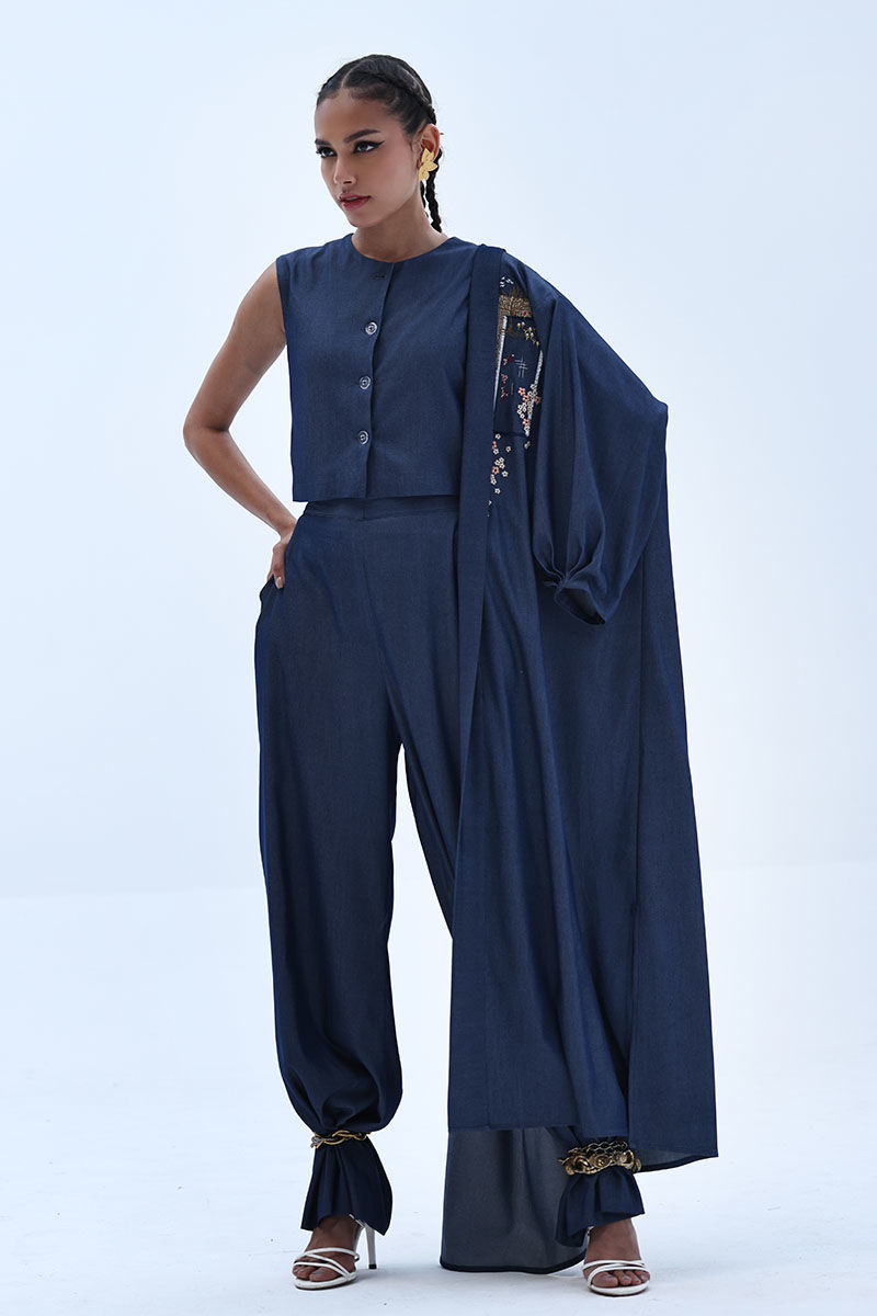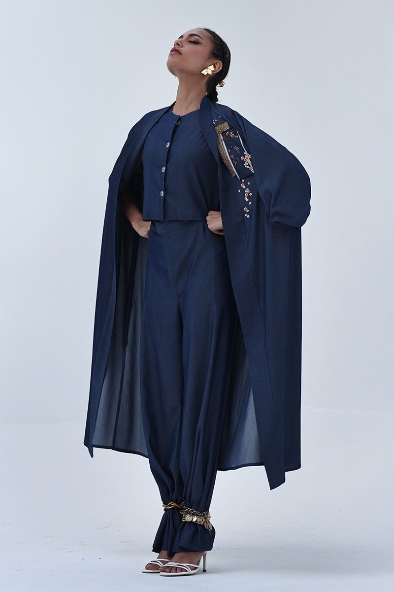 A bold fusion of textures and craftsmanship, this Dark Blue Tencil Denim three-piece set features a statement jacket adorned with a handcrafted bunch made of jute, denim, zari, and colorful Resham embroidery a true work of wearable art. The button-down jacket is paired with a sleek inner and coordinated culottes, offering a layered, contemporary silhouette perfect for modern festive wear or elevated casual styling.