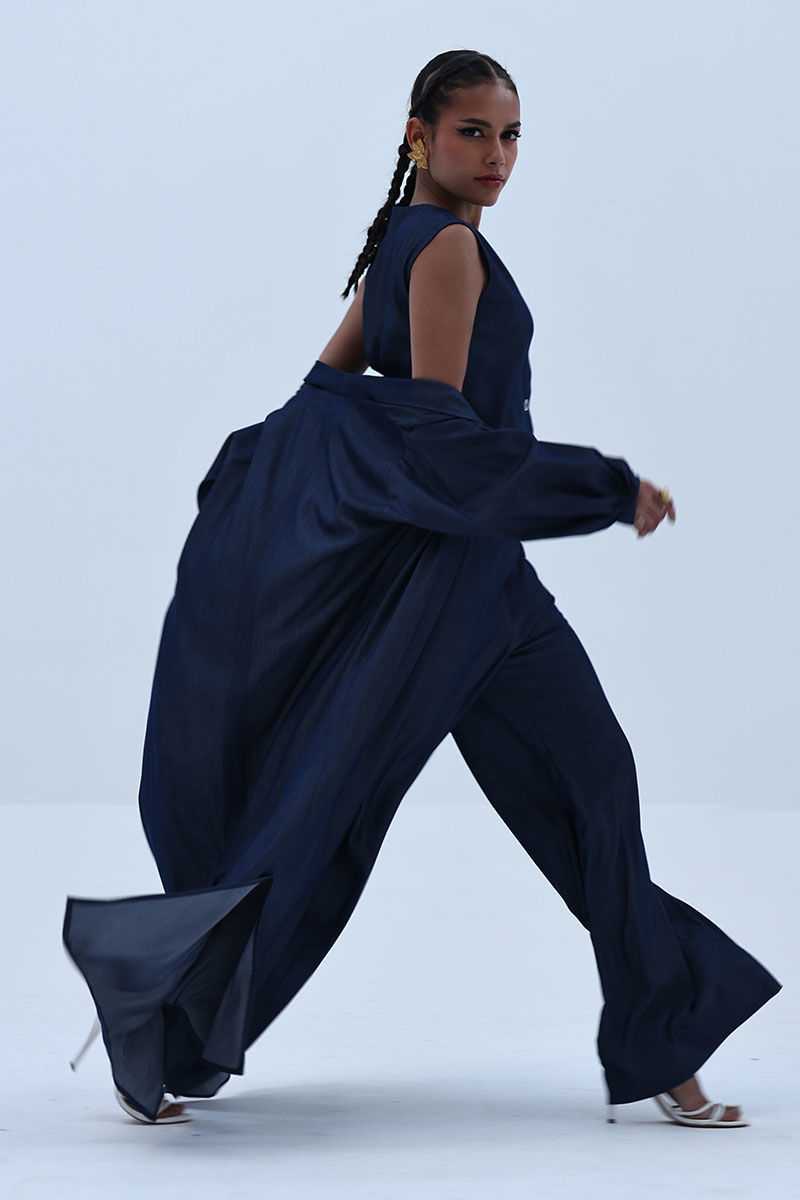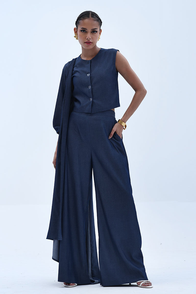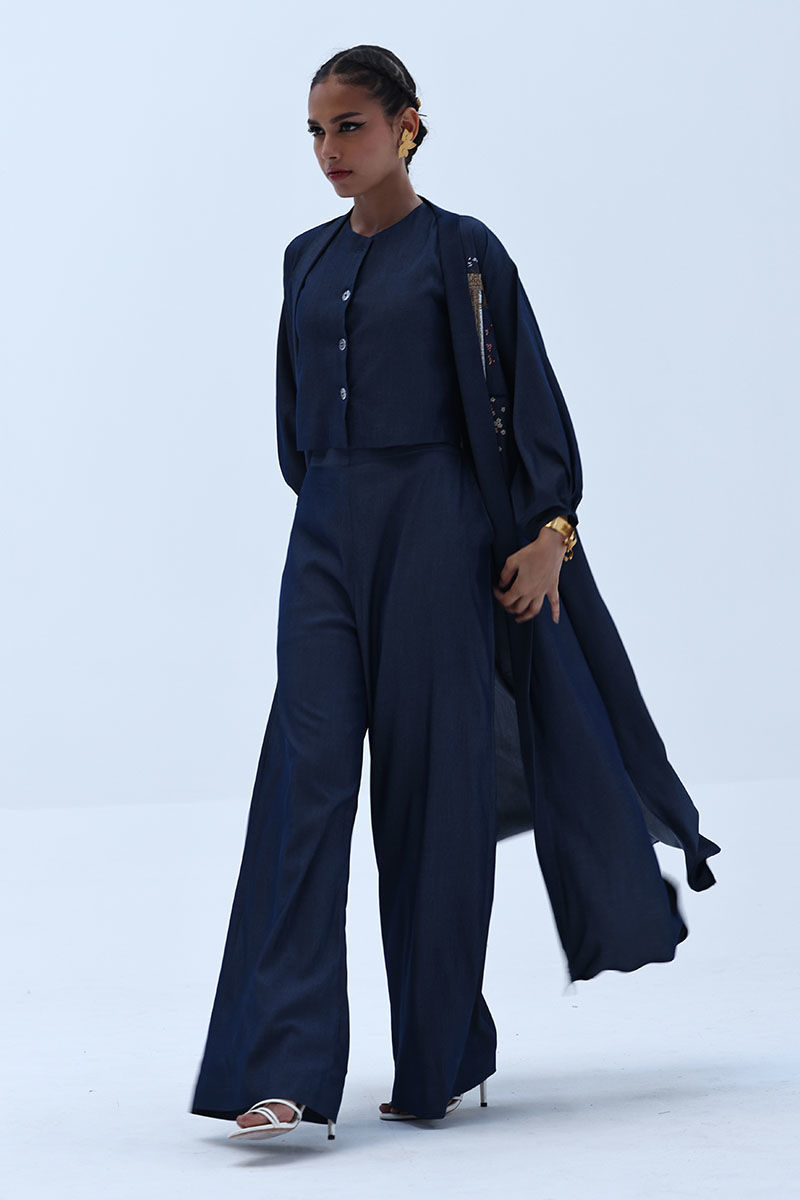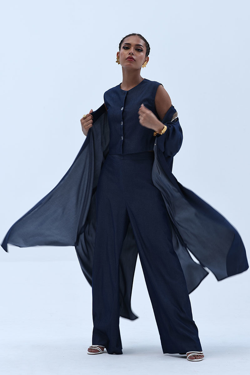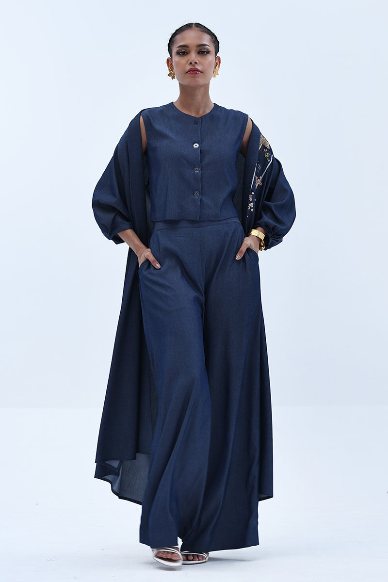 A bold fusion of textures and craftsmanship, this Dark Blue Tencil Denim three-piece set features a statement jacket adorned with a handcrafted bunch made of jute, denim, zari, and colorful Resham embroidery a true work of wearable art. The button-down jacket is paired with a sleek inner and coordinated culottes, offering a layered, contemporary silhouette perfect for modern festive wear or elevated casual styling.