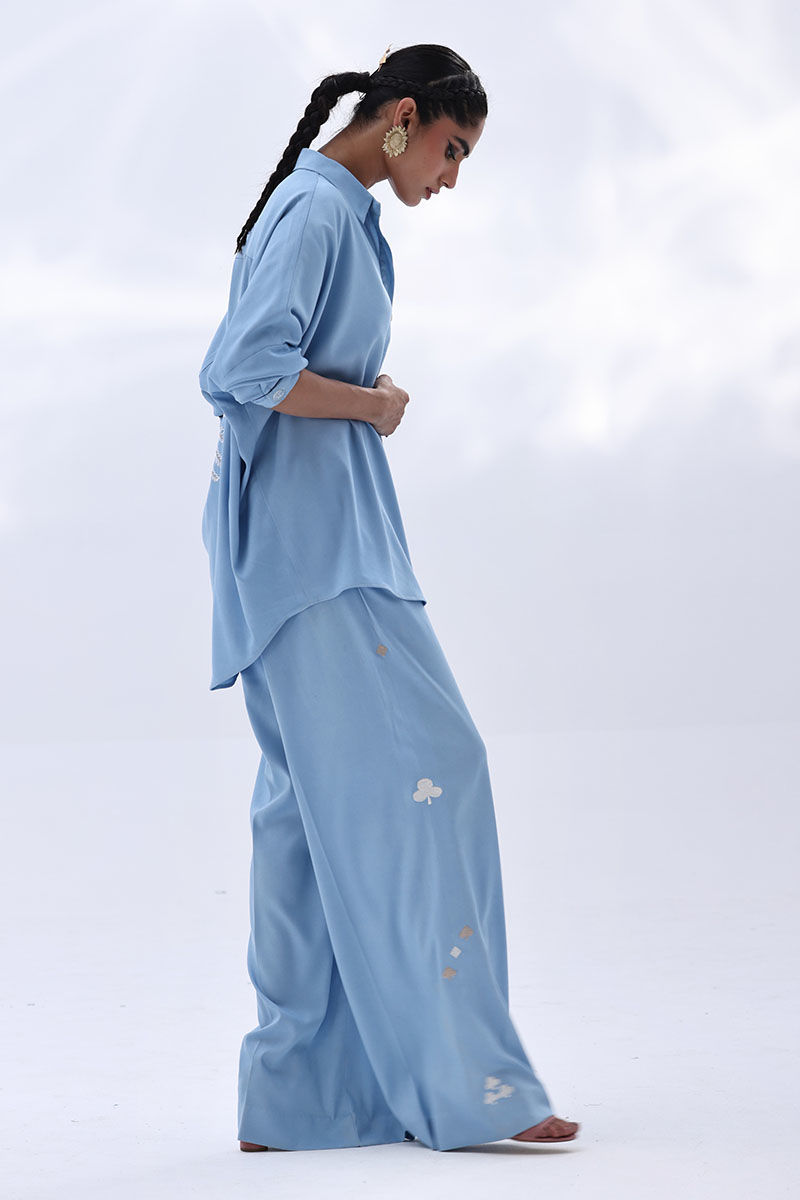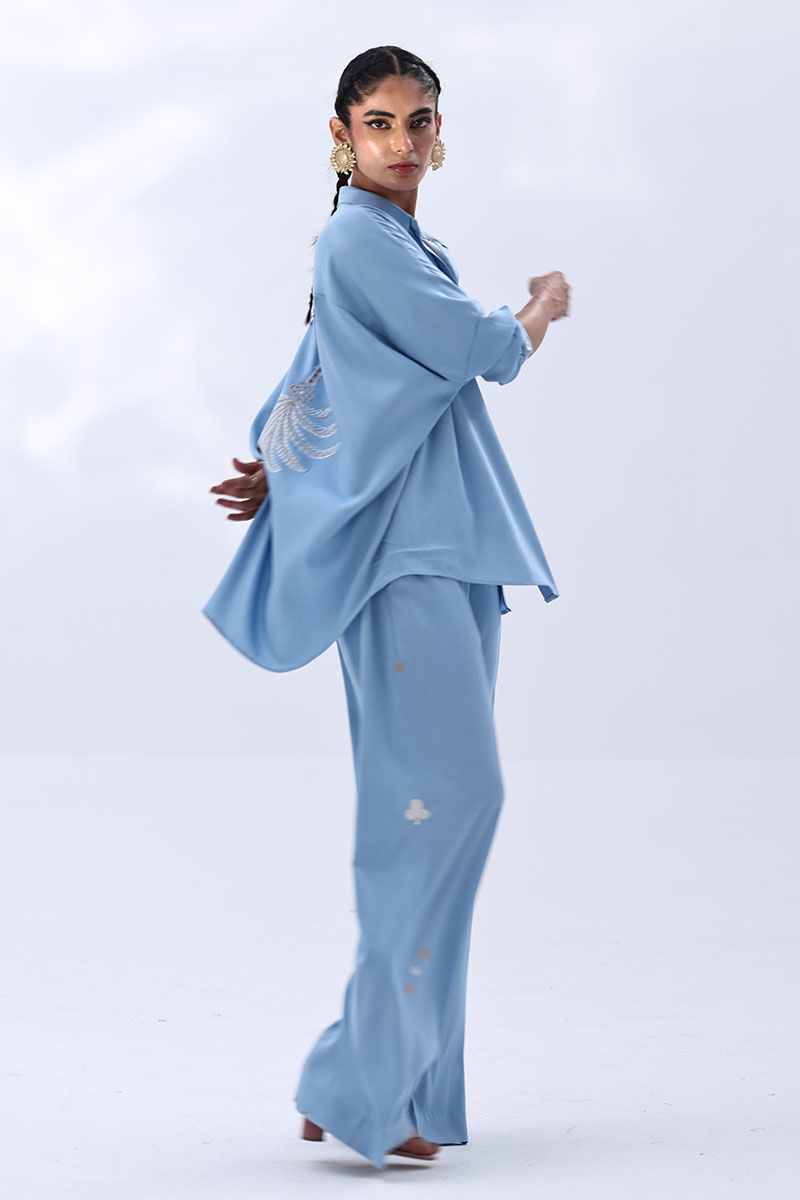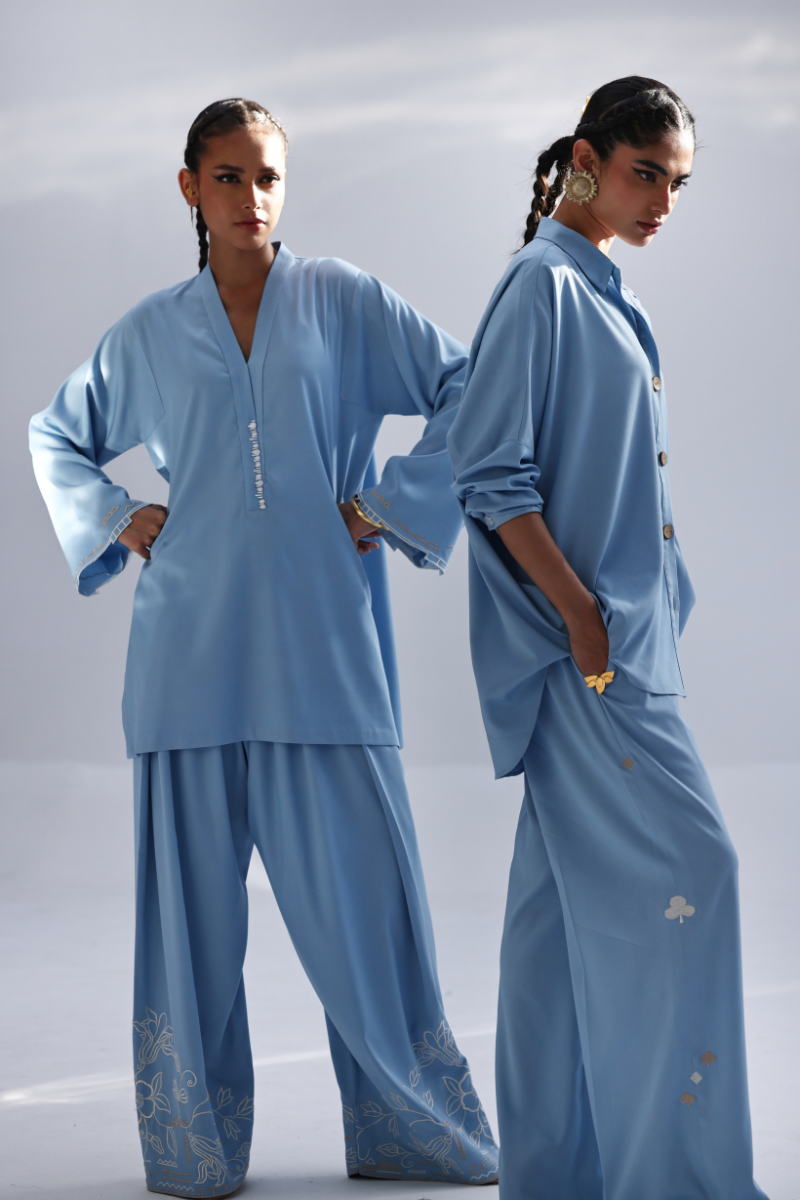 This Dream Blue Tencil Denim co-ord features a relaxed shirt with Resham embroidery and subtle cutwork on the back, offering a refined detail without overpowering the look. It's paired with coordinated culottes, finished with Resham embroidery on both sides, adding a balanced touch of texture. An easygoing yet polished outfit—ideal for everyday wear, lunch meetups, or casual office settings.