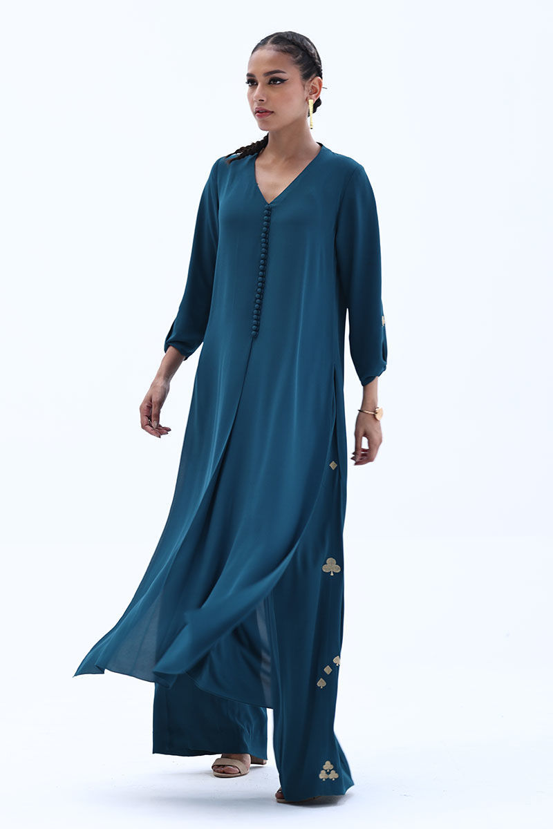 Color: Deep Teal Fabric: Georgette Work Details: Shirt : Resham Embroidery On Sleeves Culottes : Resham Embroidery On Both Sides