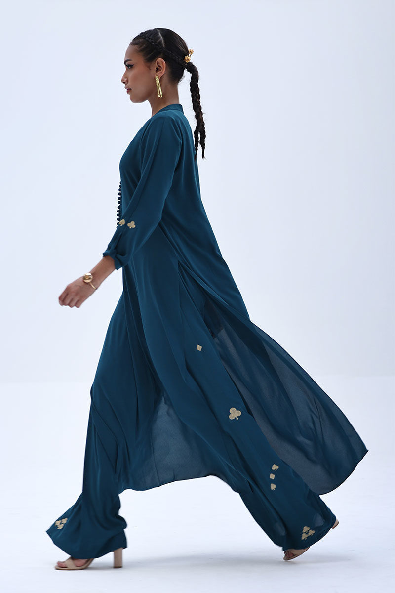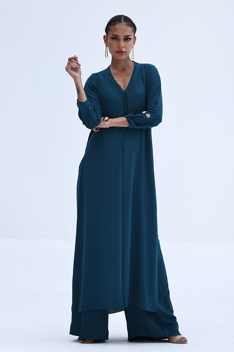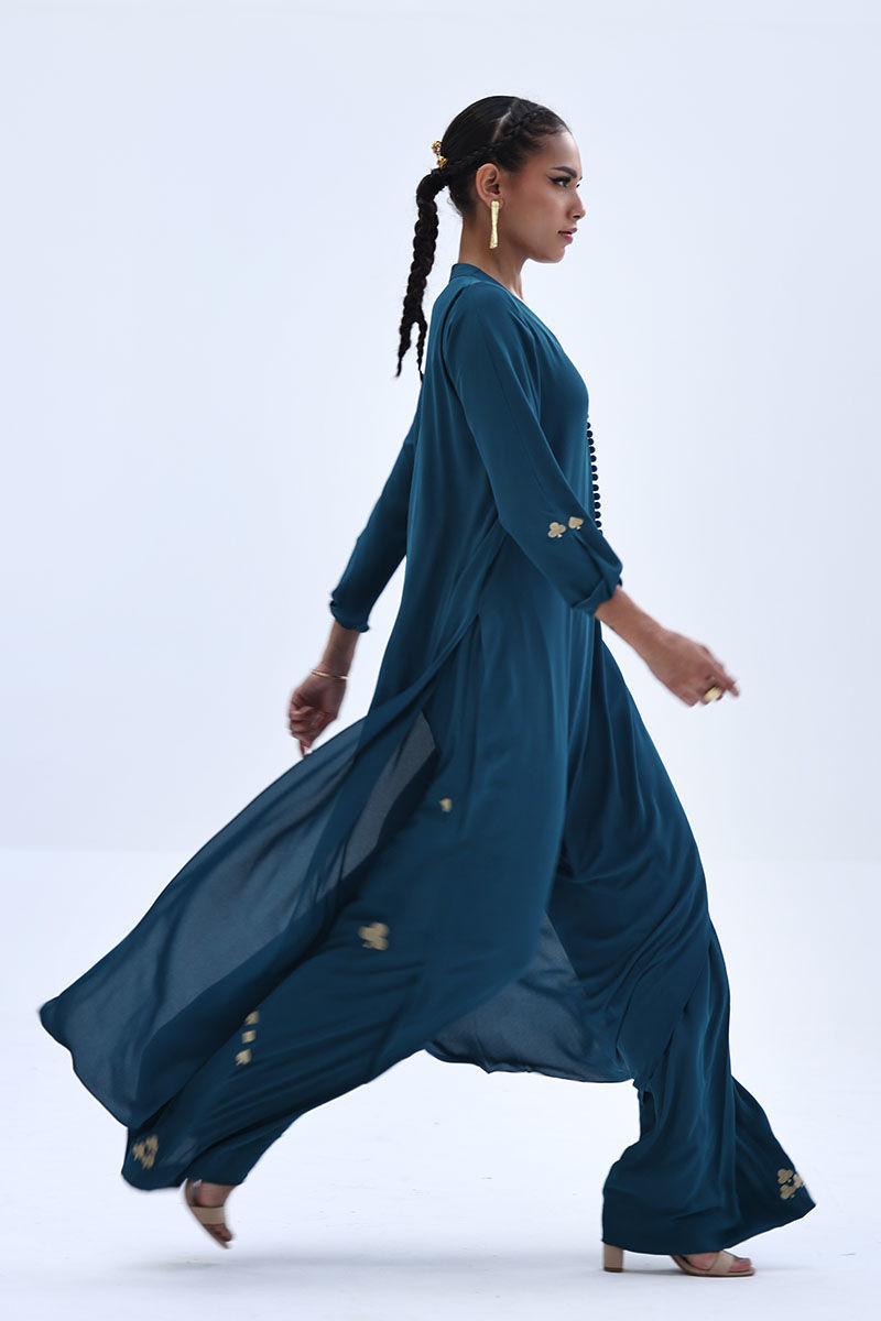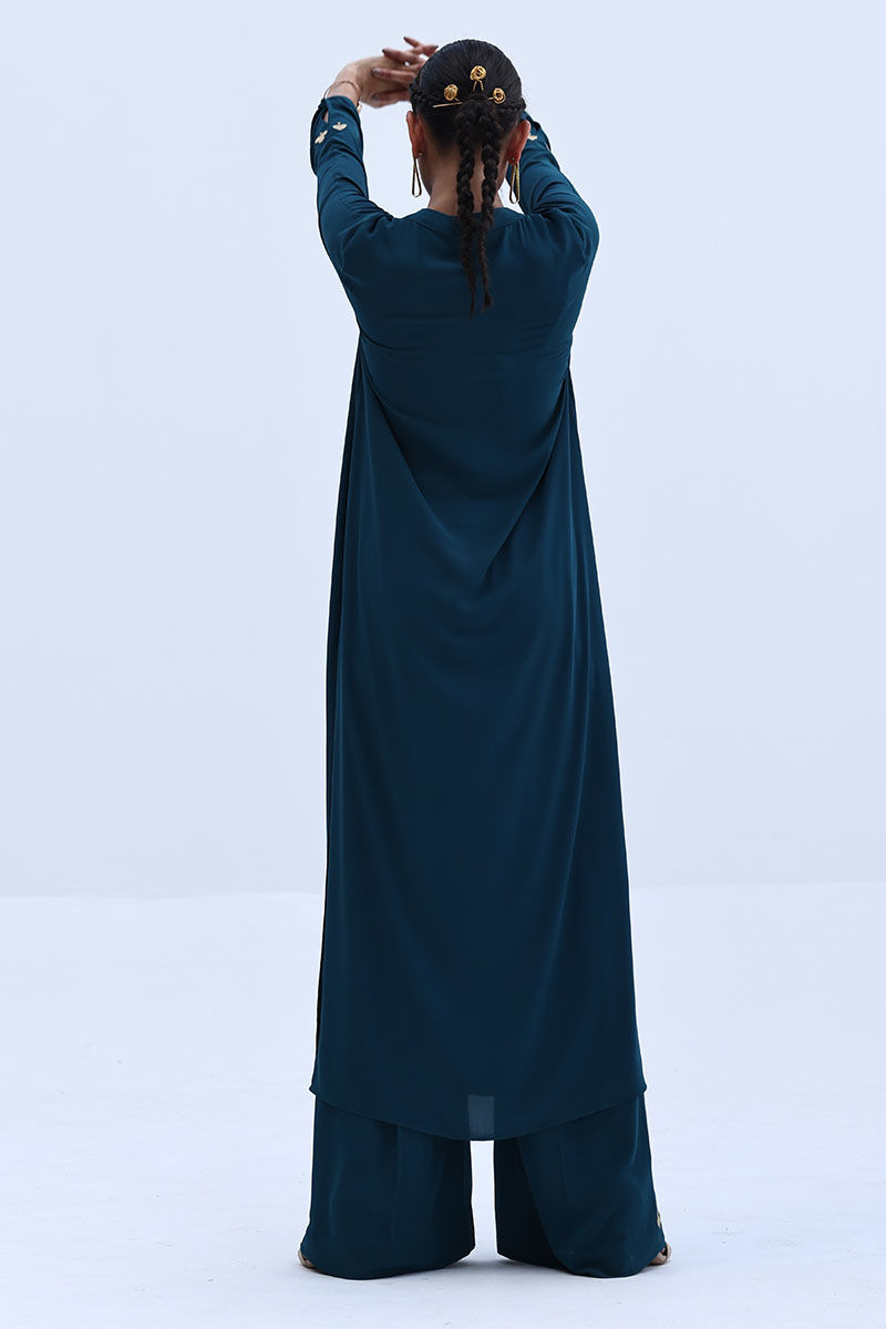 Crafted in airy Deep Teal Georgette, this co-ord set features a relaxed shirt with Resham embroidery on the sleeves, offering a clean yet detailed look. The matching culottes are accented with Resham embroidery along both sides, adding subtle texture and balance. Ideal for everyday elegance and easy, polished styling.