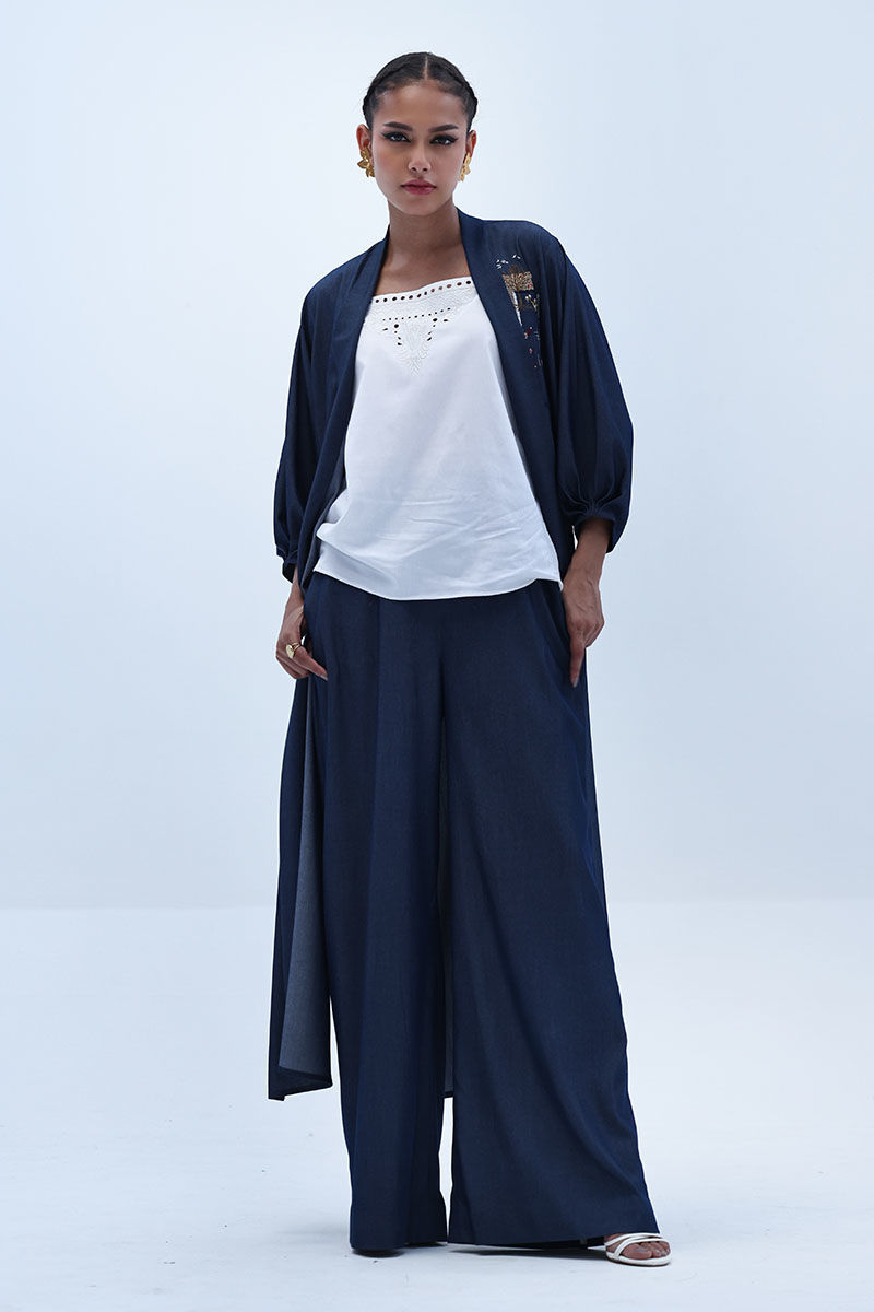 This smart three-piece set includes a Dark Blue Tencil Denim jacket and culottes, paired with a contrasting White Irish inner. The jacket is highlighted by a handcrafted bunch made of jute, denim, zari, and multicolored Resham embroidery, adding rich texture and depth. The inner top features Resham embroidery with cutwork on the neckline, complementing the jacket with subtle detailing. Finished with matching culottes, this set delivers a cohesive and stylish layered look