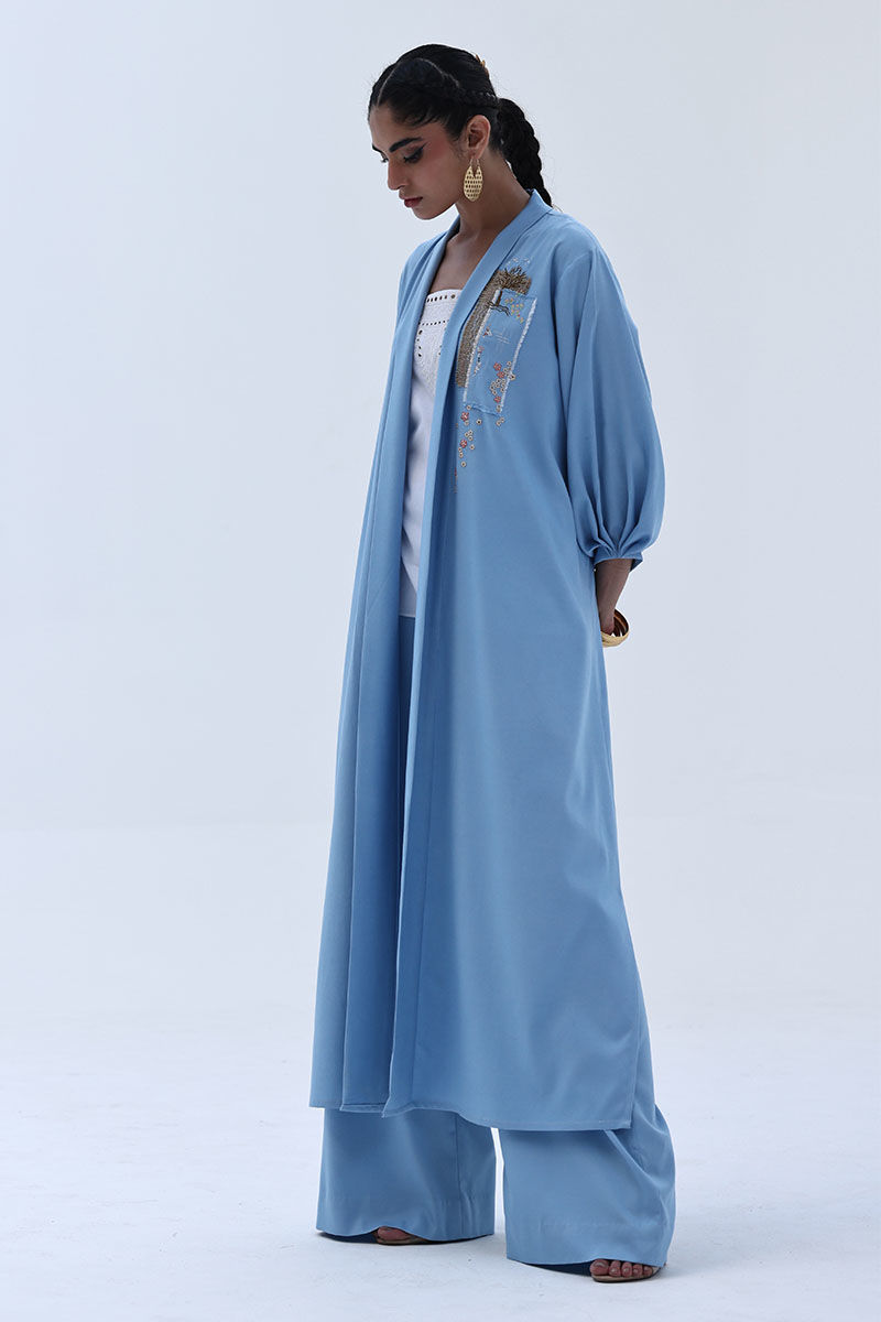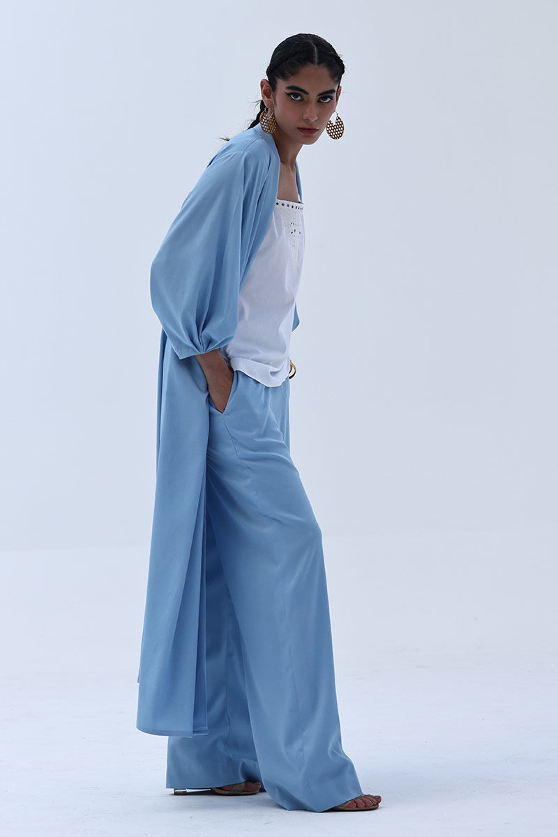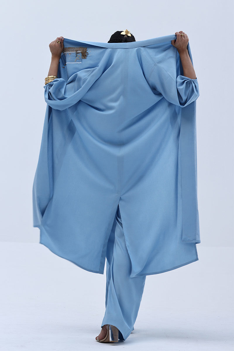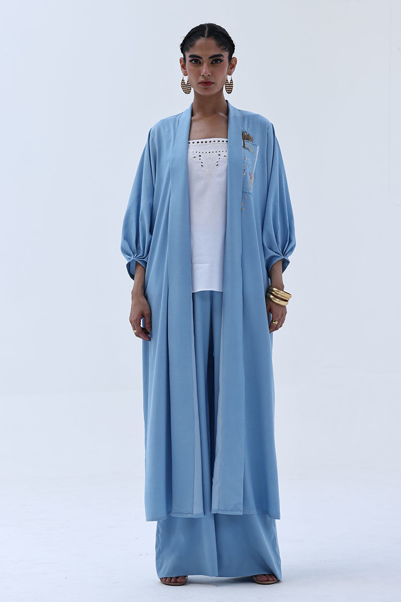 This coordinated set pairs a Dream Blue Tencil Denim jacket and culottes with a crisp White Irish inner, creating a balanced and versatile look. The jacket features a handcrafted bunch made from jute, denim, zari, and colorful Resham embroidery, offering a creative, textured accent. The inner top is detailed with Resham embroidery and delicate cutwork on the neckline, adding a subtle yet refined touch. With its thoughtful detailing and modern silhouette, this set is ideal for smart casual dressing.