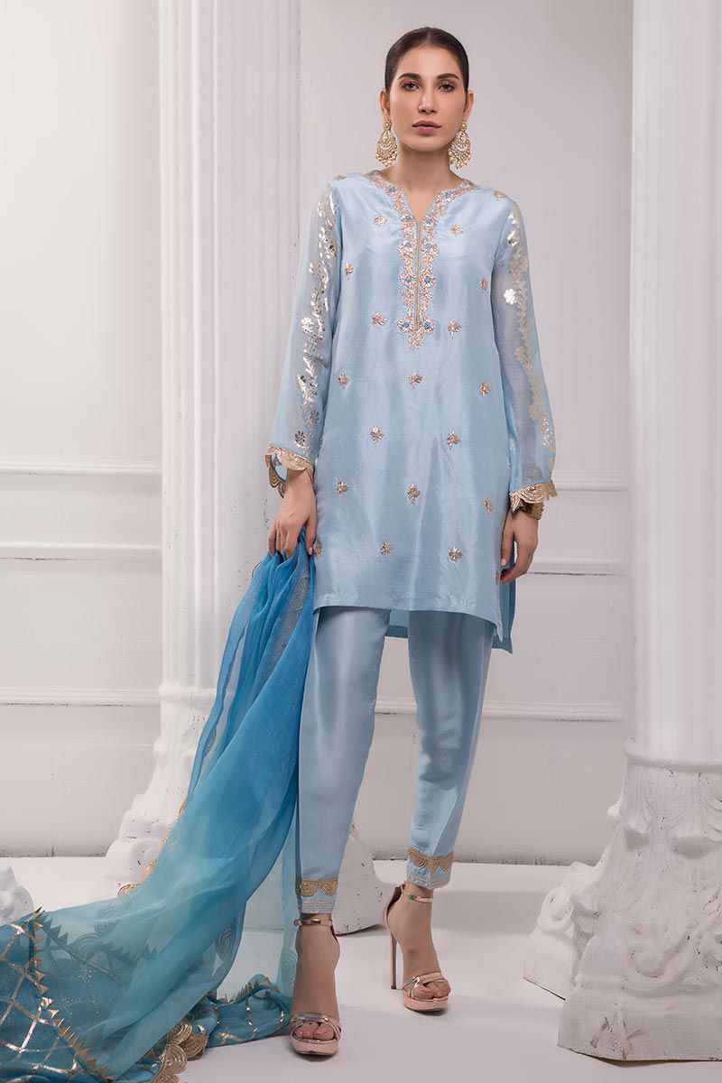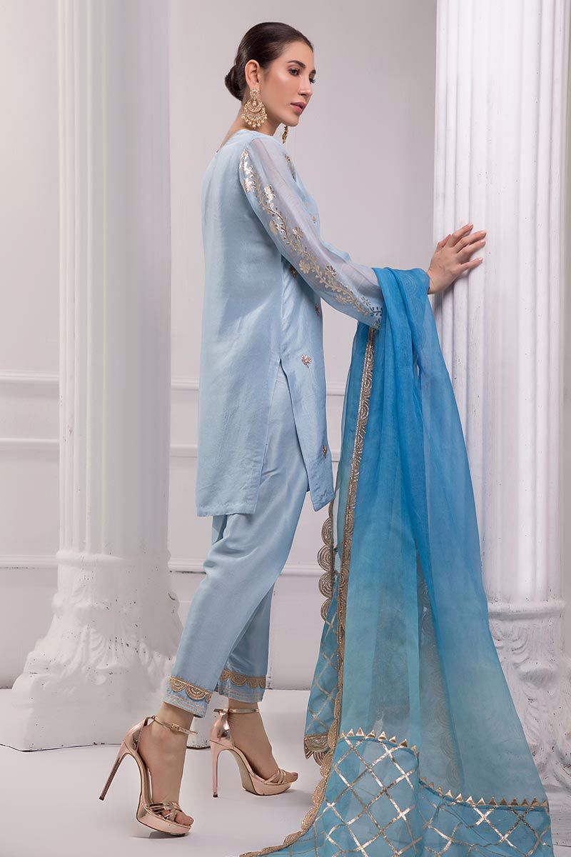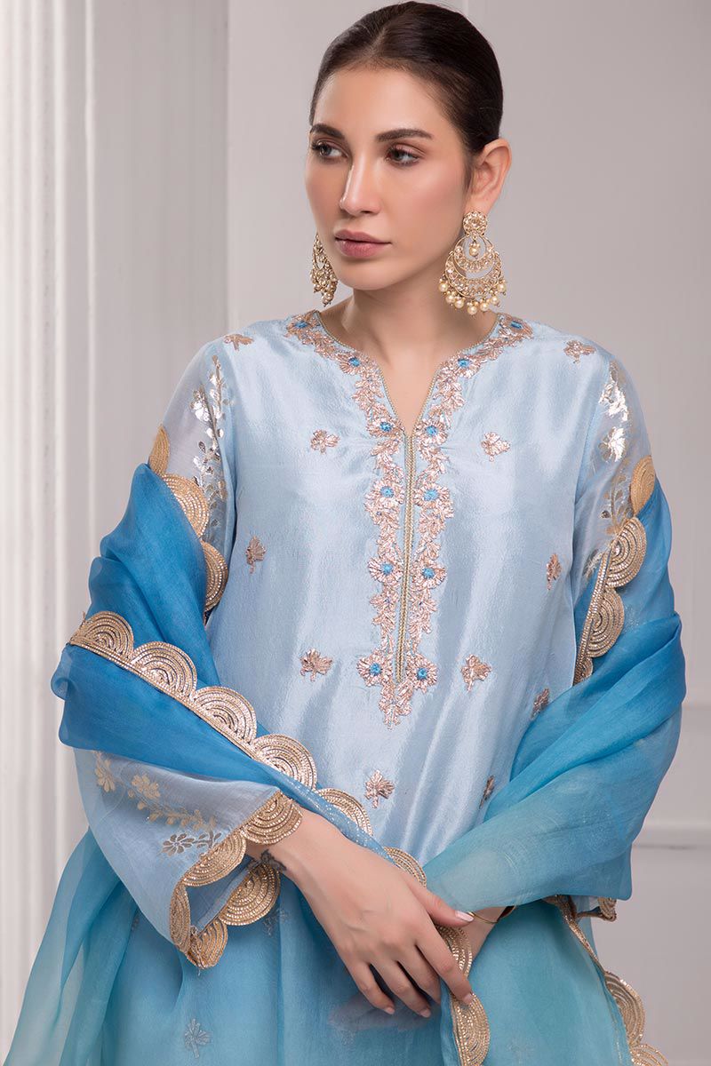 Color: Blue Fabric: Raw silk Work Details: Embellished
