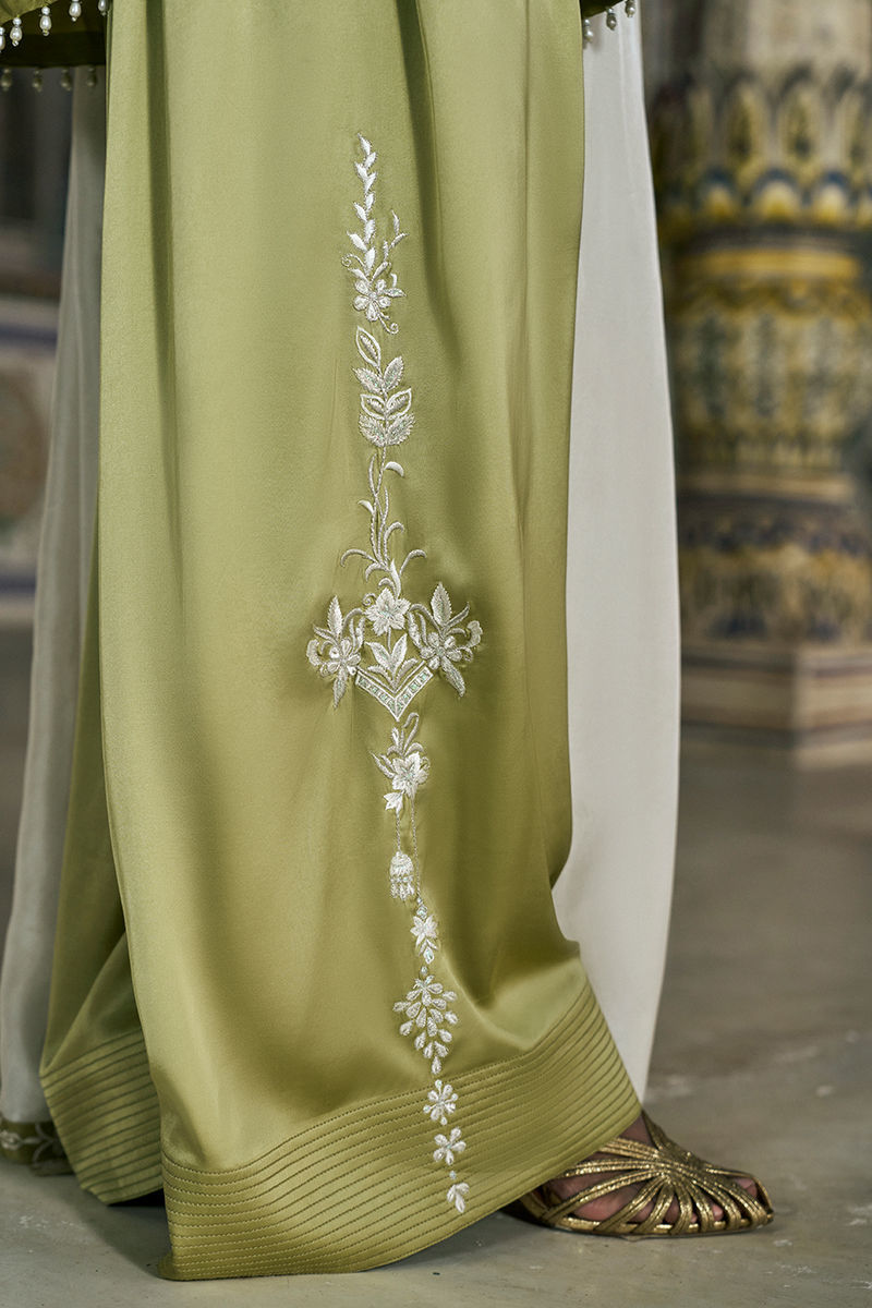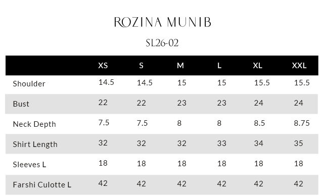 The loose-cut short shirt is crafted from pure raw silk and features intricate ivory resham and lorix & silver zari embroidery, complemented by delicate handmade pati work and cutwork pearl hangings for a refined, artisanal finish. It is paired with cotton charmeuse farshi culottes, adorned with matching ivory resham and lorix zari embroidery, creating a harmonious and elegant silhouette. The ensemble is completed with a medium silk dupatta, detailed with an ivory embroidered border and delicate sugar cane appliqué, adding a soft, sophisticated touch to the look.