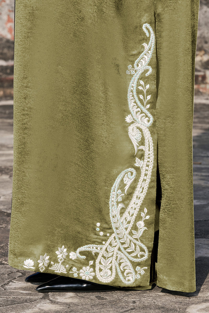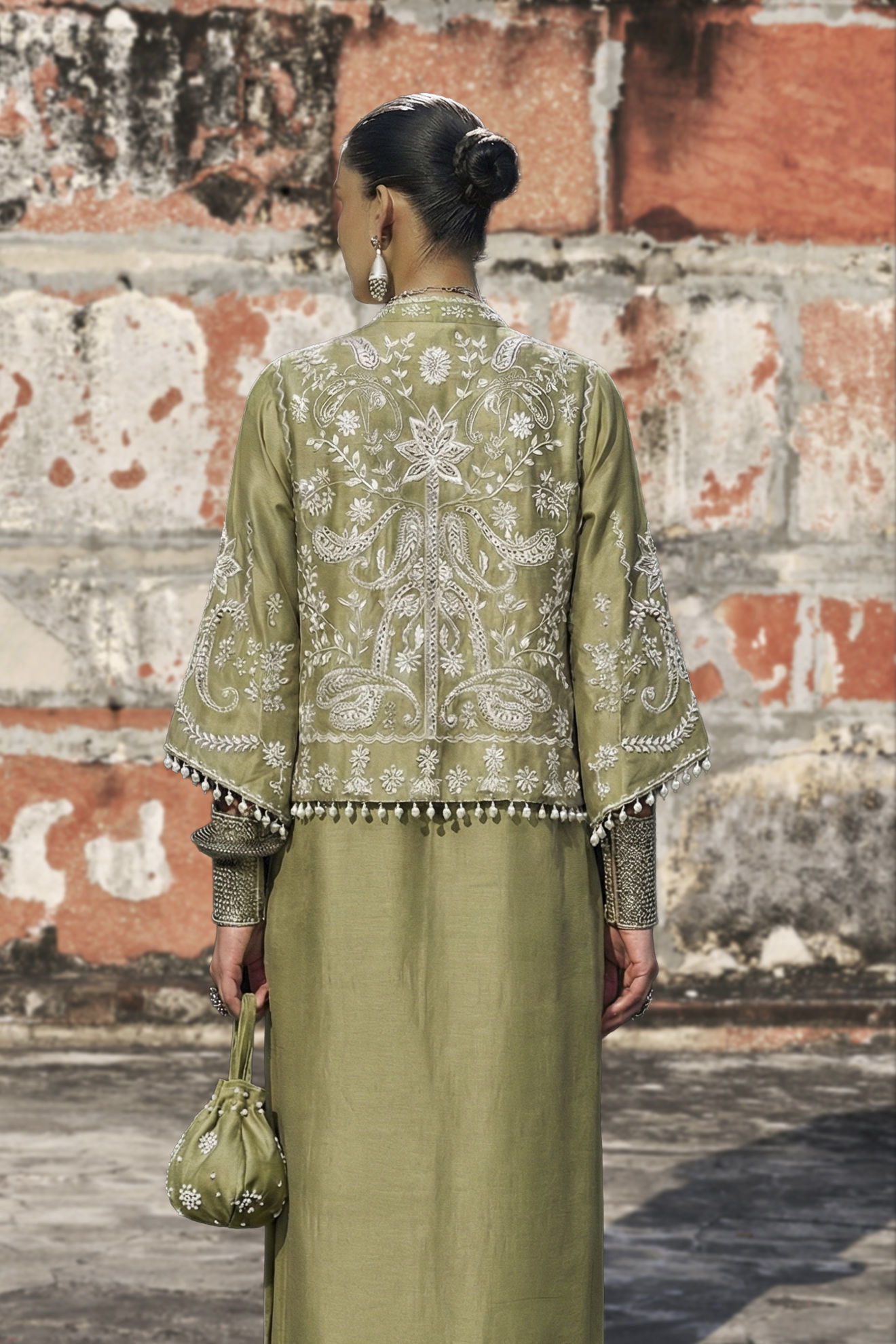 The sugar cane short jacket is crafted with exquisite ivory resham and lorix embroidery, complemented by silver zari work and enhanced with sequins, cutdana, stones, pearls (moti), delicate handmade pati work, and pearl hangings, creating a richly detailed, artisanal finish. It is paired with a pure raw silk matching kaftan, adorned with ivory resham and lorix zari embroidery, resulting in an elegant ensemble that seamlessly blends refined craftsmanship with contemporary sophistication. *The Inner Length Is 61.5”.