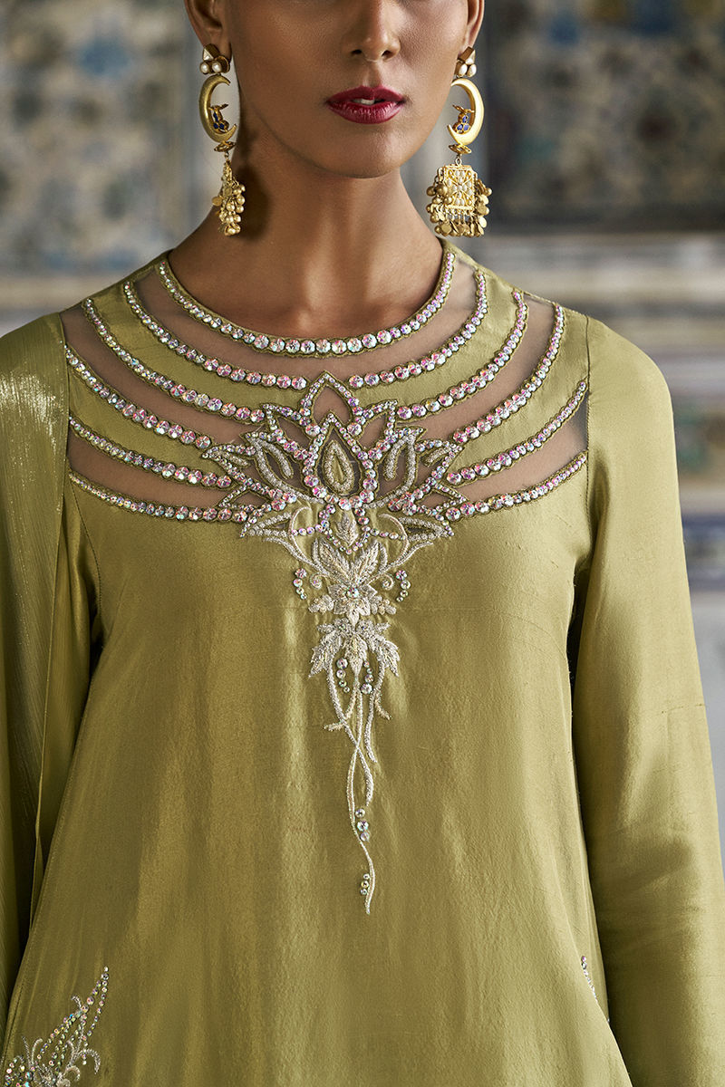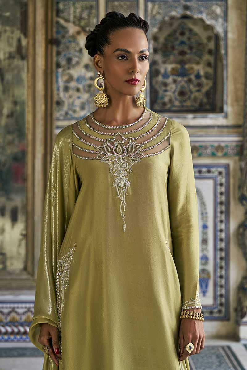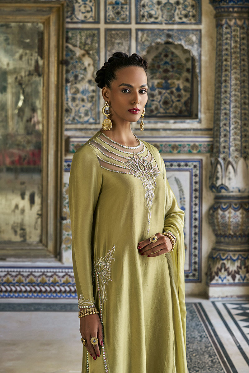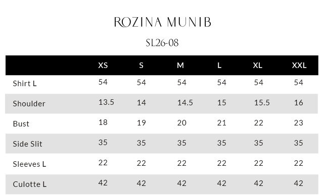 The straight long shirt with high slits is adorned with delicate sugar cane–toned stonework in varied sizes and shapes, intricately paired with silver and golden zari embroidery layered over subtle skin net detailing. The design reflects refined craftsmanship with a modern edge. It is paired with fluid cotton charmeuse culottes for effortless elegance and completed with a shiny chiffon dupatta, beautifully detailed with silver, golden zari, and lorix embroidery for a luminous, graceful finish.