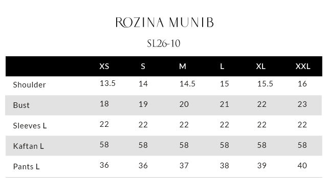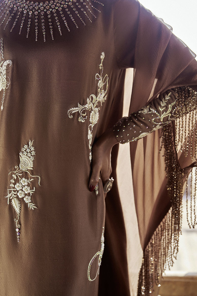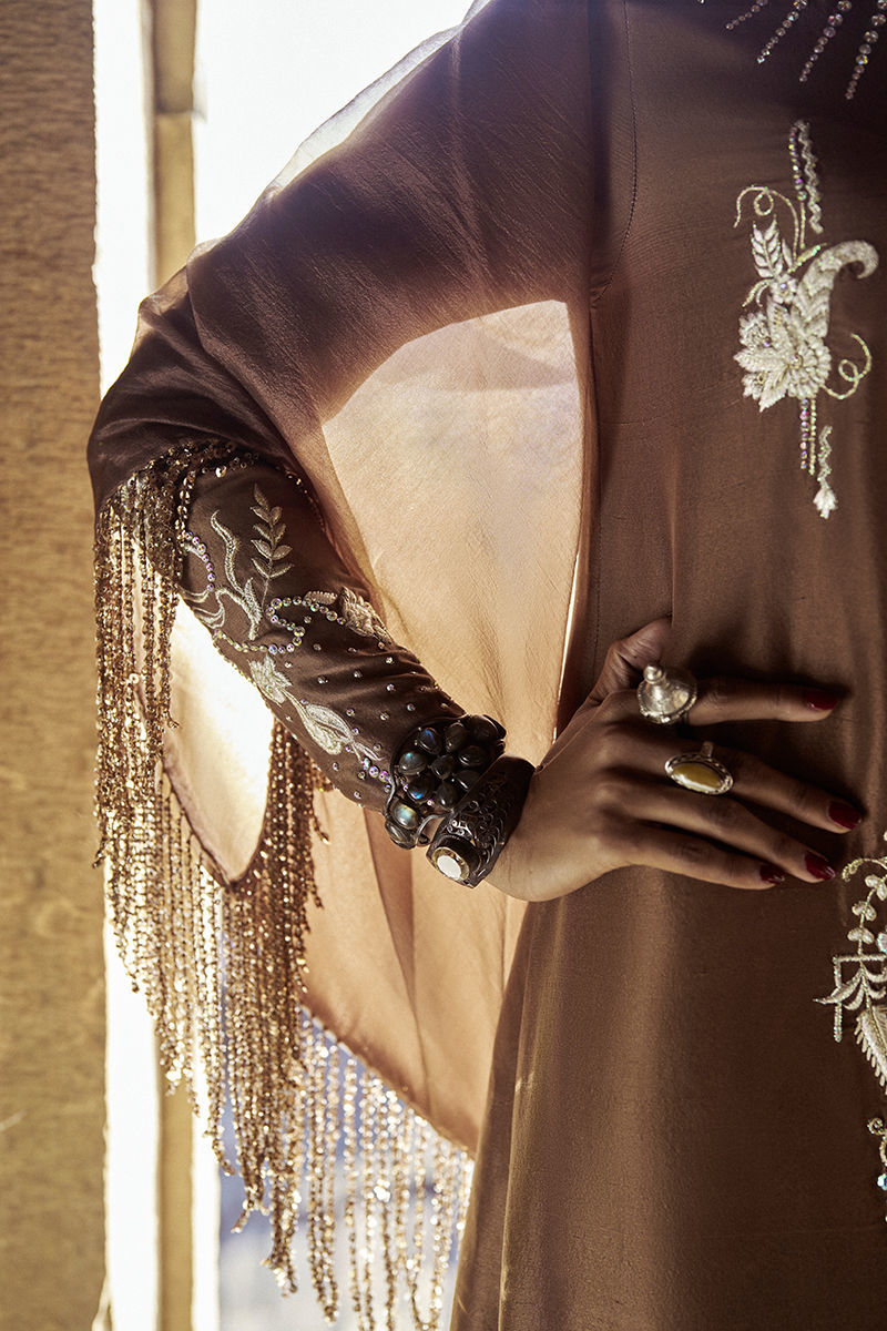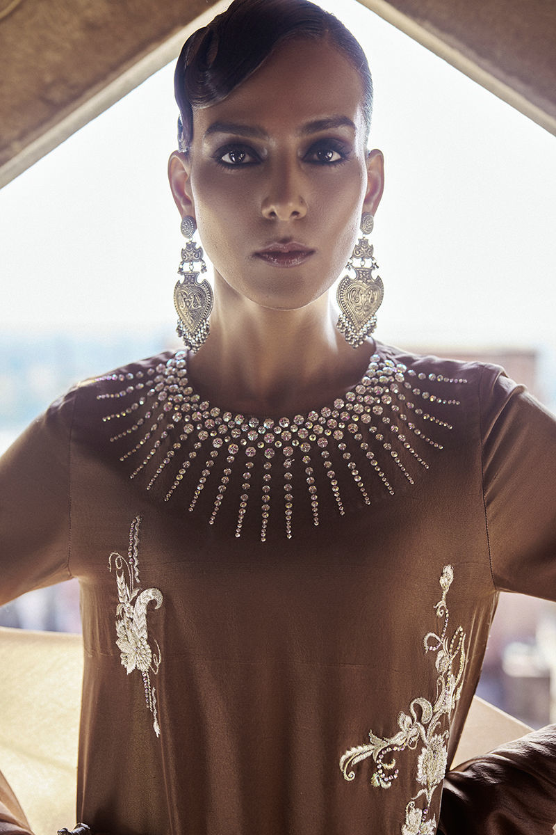 The tobacco-hued kaftan with pockets is adorned with intricate stonework in varied sizes and shapes, beautifully complemented by silver and golden zari, lorix, and resham embroidery for a rich, artisanal finish. Designed for both elegance and ease, the kaftan offers effortless movement with a contemporary silhouette. It is paired with pants available in pure raw silk or cotton charmeuse, allowing versatile styling options, and completed with a diamond silk shrug that adds a refined, elevated layer to the ensemble.