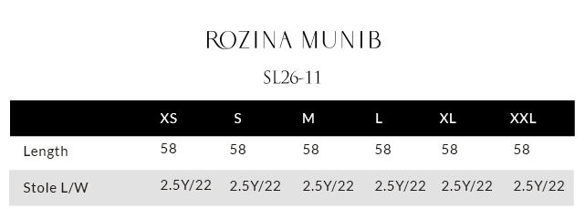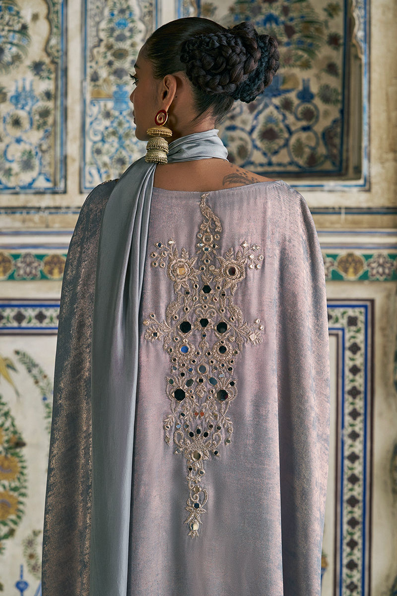The zinc-toned kaftan is crafted from luxurious sachi silk and features intricate zari and lorix embroidery, highlighted with delicate mirror work for a subtle, luminous effect. Designed with an effortless, flowing silhouette, it is paired with a medium silk stole finished with handmade tassel details, adding an artisanal and elegant touch to the ensemble.