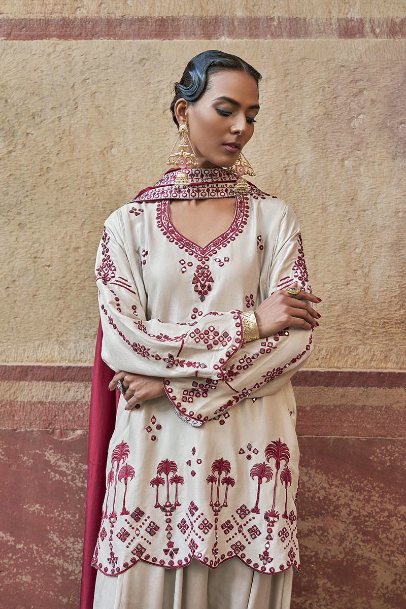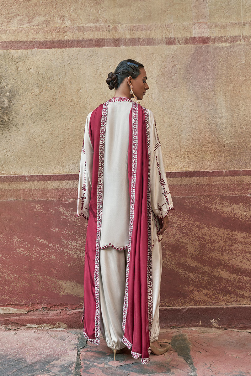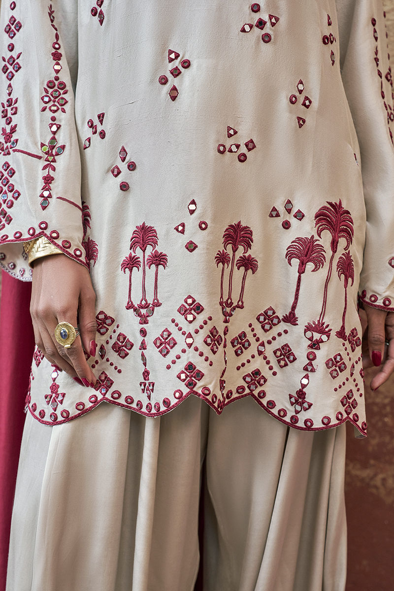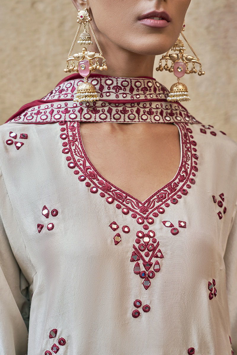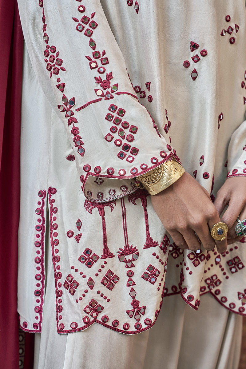 The loose-cut long shirt in birch is crafted from pure raw silk and features functional pockets, adorned with intricate maroon resham embroidery and delicate mirror work for a refined, artisanal finish. It is paired with birch Cotton Charmeuse Balloon Pants for effortless elegance and fluid movement. The ensemble is completed with a medium silk maroon dupatta, detailed with maroon resham and silver zari embroidery along the border, finished with appliqué accents for a sophisticated and elevated look.