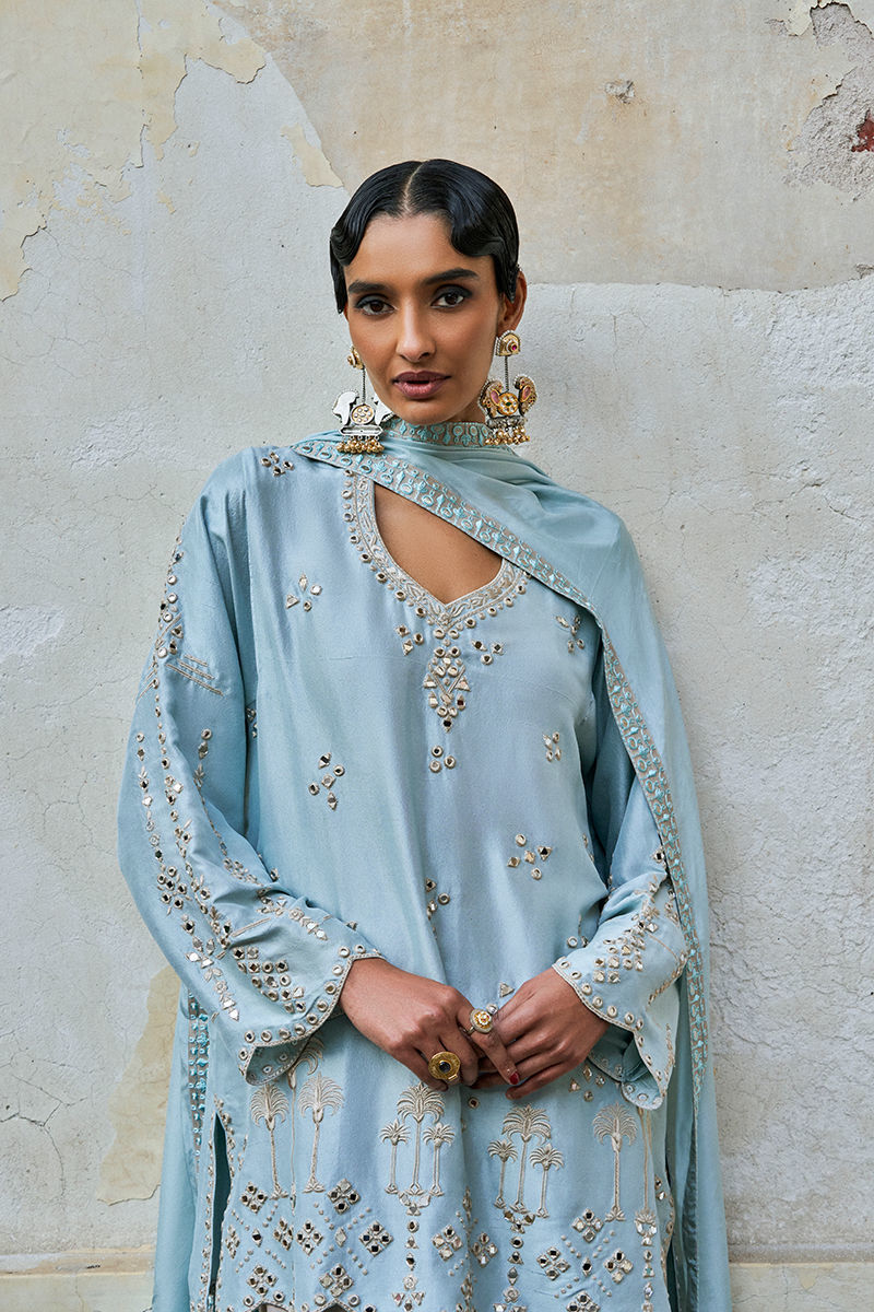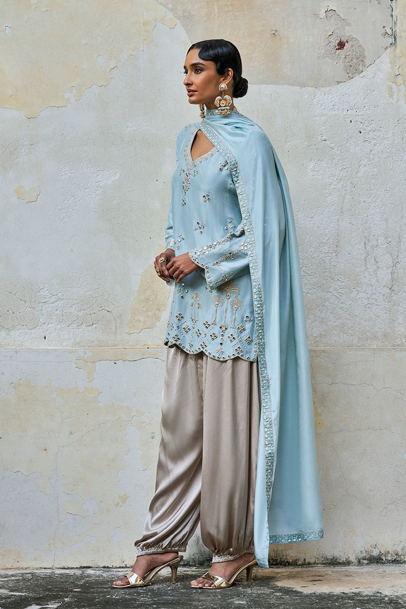 The smoke-aqua pure raw silk loose-cut short shirt features functional pockets and is adorned with delicate beige resham embroidery enhanced with mirror work, creating a subtle, reflective elegance. Paired with balloon-style cotton charmeuse pants in beige for effortless comfort, the ensemble is completed with a smoke-aqua medium silk dupatta, detailed with aqua resham, silver zari embroidery, and appliqué borders, adding a graceful and elevated finish perfect for festive occasions.