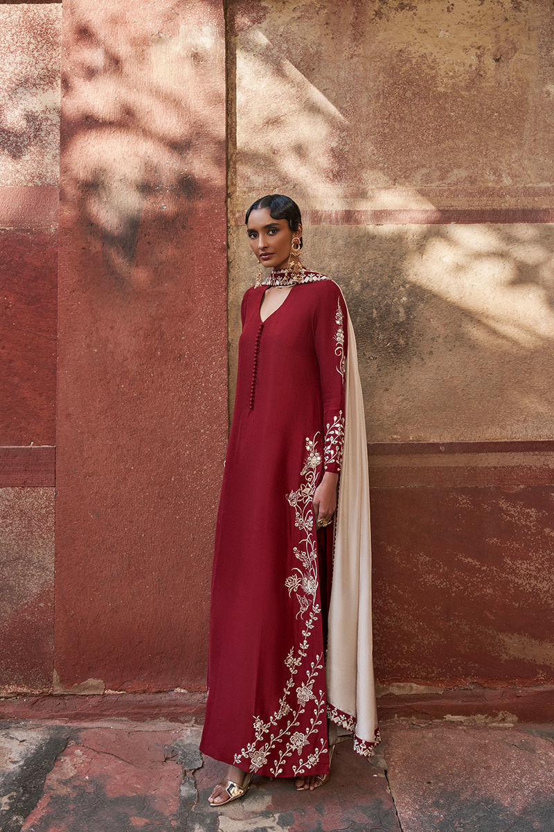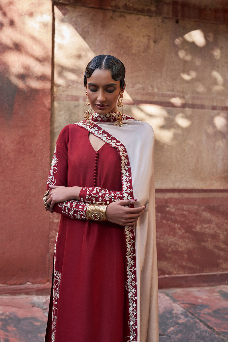 The syrah maroon long shirt with high slits is crafted from pure raw silk and adorned with delicate beigh resham embroidery and subtle mirror work, creating a refined, artisanal finish. It is paired with syrah maroon cotton charmeuse pants for a striking, elegant contrast. The ensemble is completed with a medium silk beige dupatta, detailed with red resham, silver zari embroidery, and appliqué borders, adding a graceful, elevated touch—perfect for festive and evening occasions.