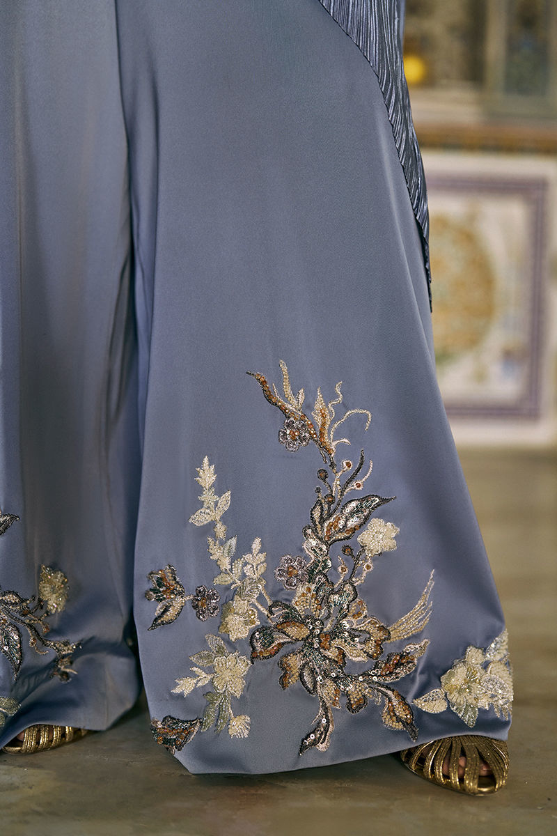The Blue Fog high-low poncho is crafted from pleated silk and adorned with intricate colored resham, zari, and zardozi embroidery, enhanced with cutdana, sequins, crystals, and delicate 3D flowers layered over skin net for a sophisticated, dimensional effect. It is paired with cotton charmeuse culottes, beautifully detailed with matching colored resham, zari, and zardozi embroidery, as well as cutdana, sequins, crystals, and 3D floral accents, creating a cohesive and statement-making ensemble perfect for festive occasions and elevated evening wear.