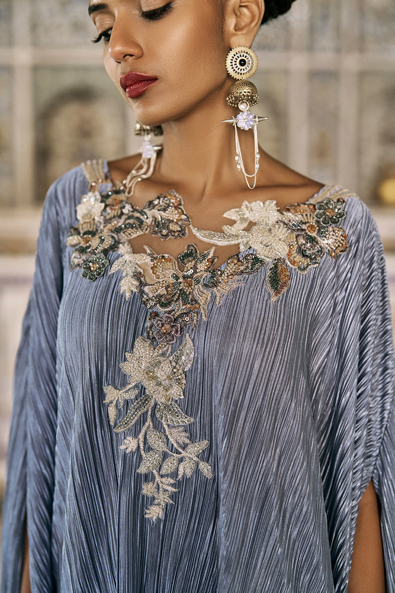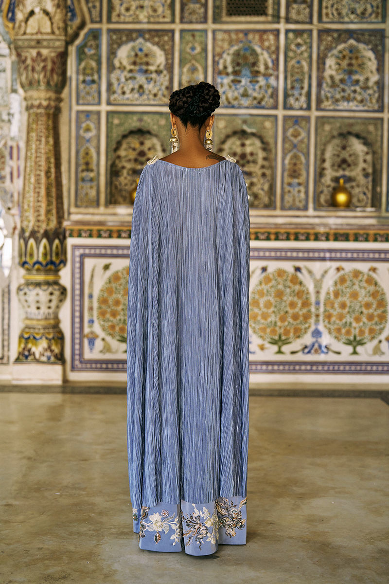 The Blue Fog high-low poncho is crafted from pleated silk and adorned with intricate colored resham, zari, and zardozi embroidery, enhanced with cutdana, sequins, crystals, and delicate 3D flowers layered over skin net for a sophisticated, dimensional effect. It is paired with cotton charmeuse culottes, beautifully detailed with matching colored resham, zari, and zardozi embroidery, as well as cutdana, sequins, crystals, and 3D floral accents, creating a cohesive and statement-making ensemble perfect for festive occasions and elevated evening wear.
