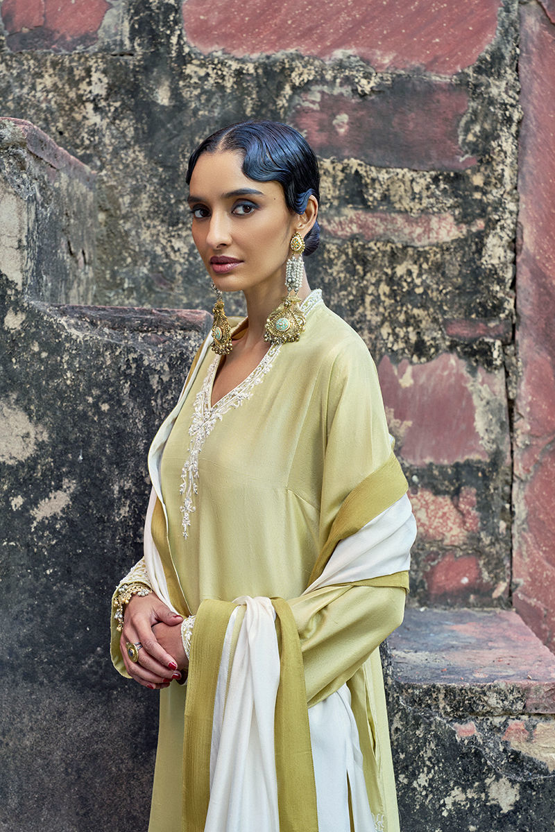 The Lemonade loose-cut long shirt, crafted from pure raw silk, features functional pockets and is adorned with intricate ivory resham and lorix embroidery, enriched with delicate handwork including pearls (moti), crystals, stones, sequins, and cutdana for a refined, artisanal finish. It is paired with cotton charmeuse culottes, detailed with a hand-embroidered sequins border, and completed with a medium silk ivory dupatta, creating an elegant and elevated ensemble perfect for festive and evening occasions.