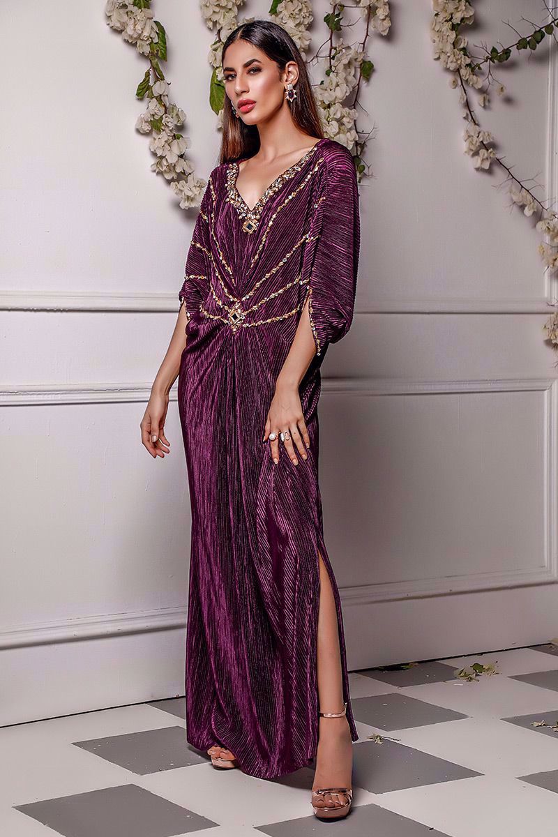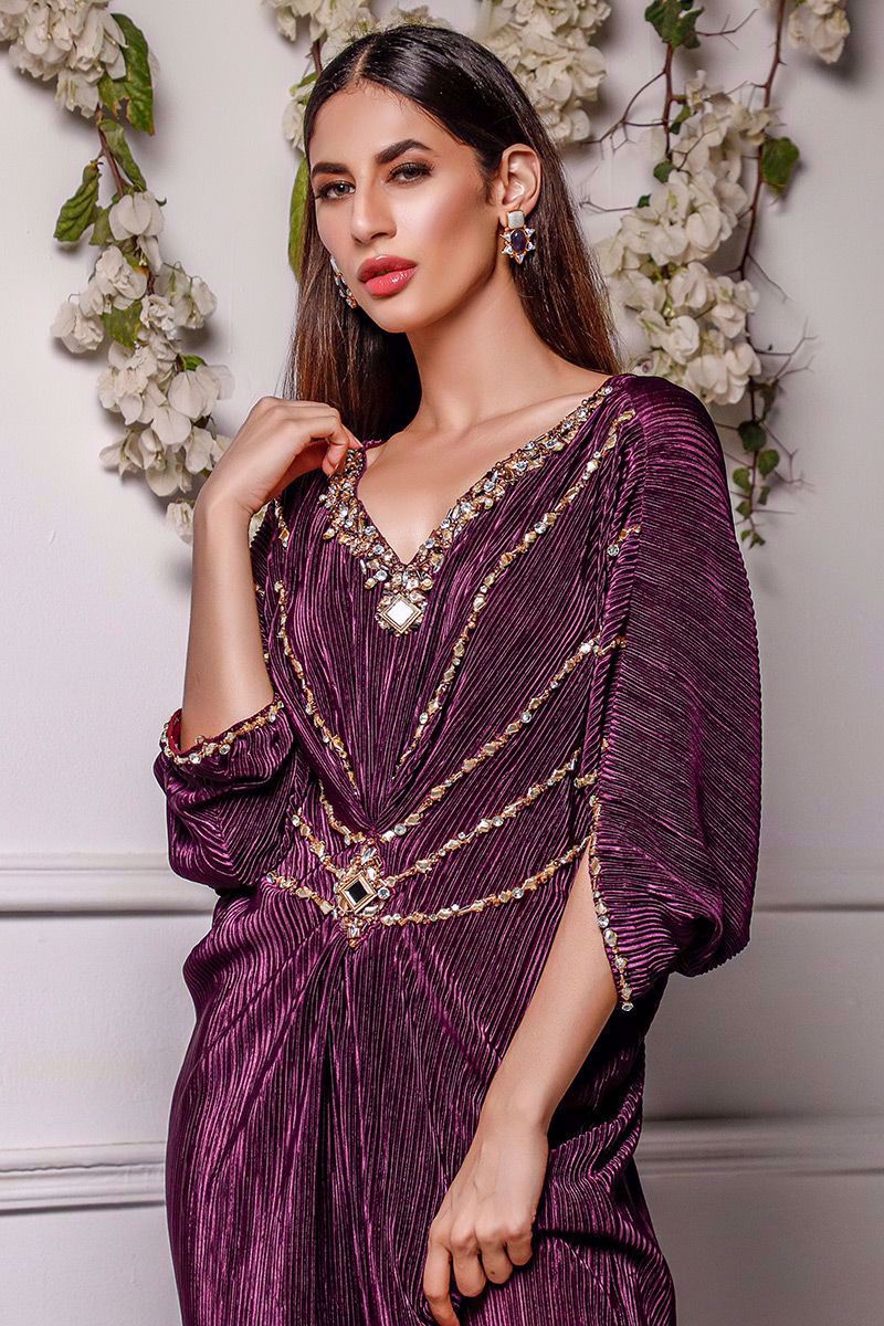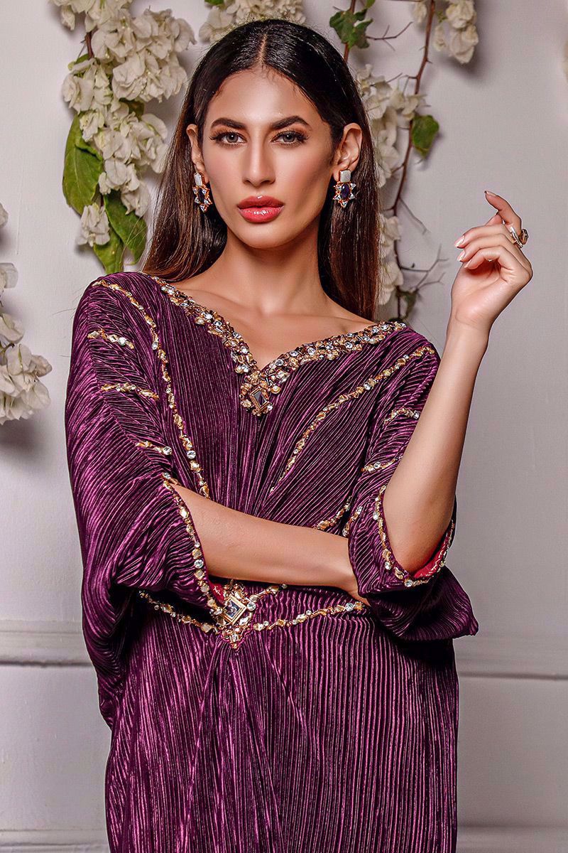 A breathtaking plum crush kaftan with skillfully tailored pleats on centre front and back. The upper body is bedecked with stones, crystals, mirror and metal ornaments in diagonal alignment giving the outfit worthy of a glance.