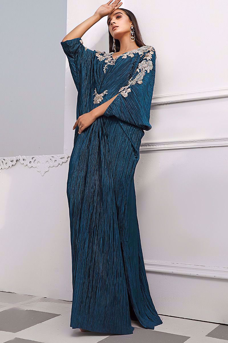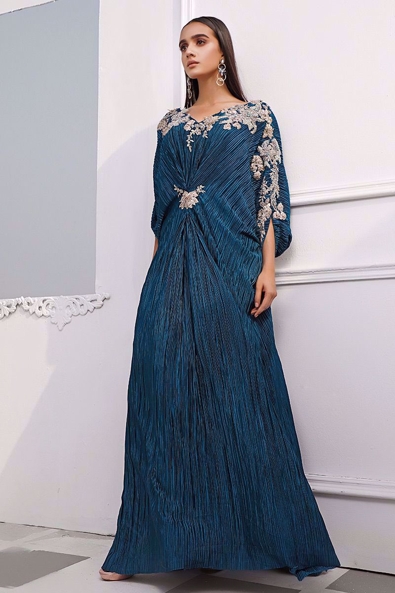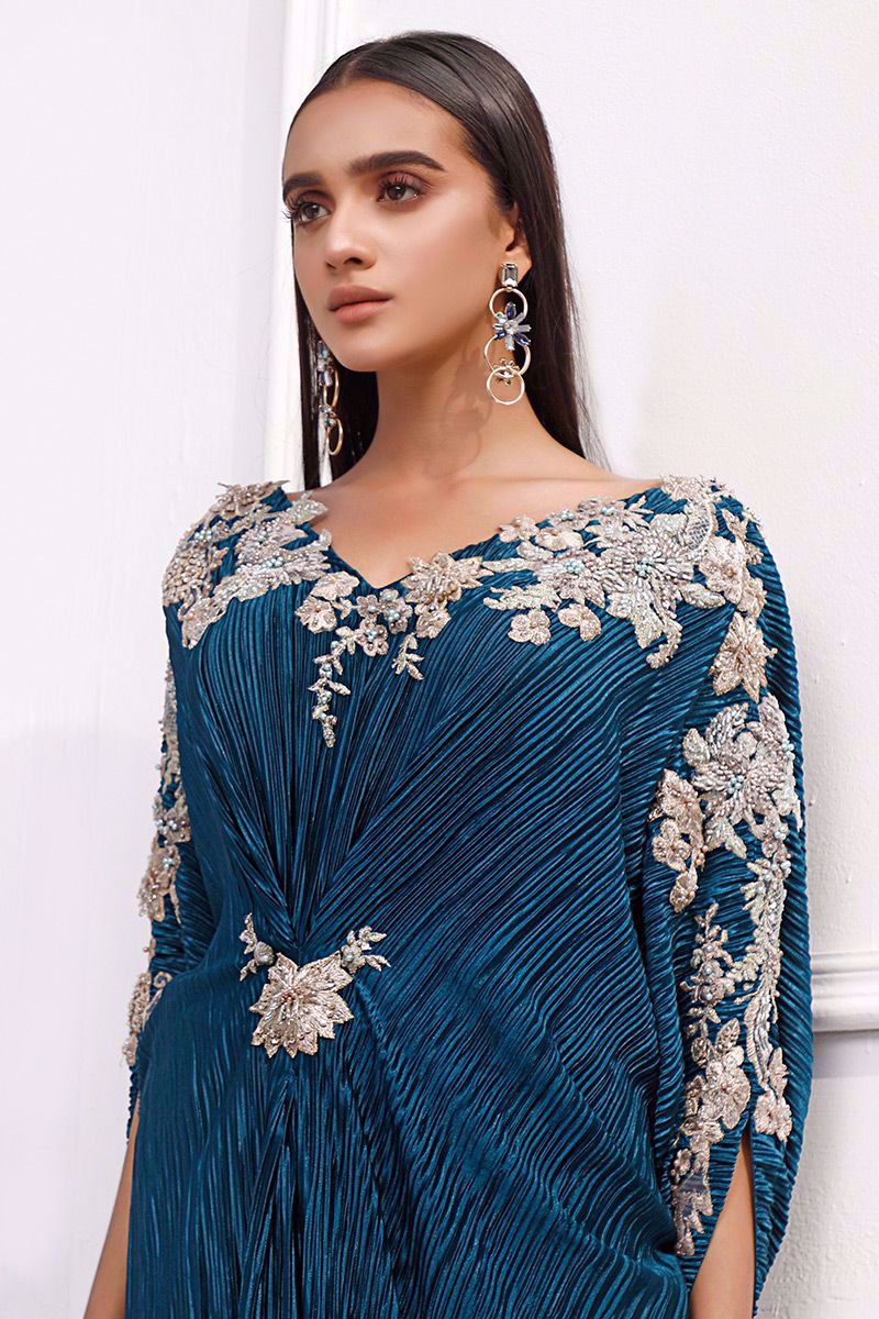 An upscale teal crush kaftan gives major fashionista goals. The 3D floral embellishments of resham, sequin, pearls and beads focus the V-neckline and waist.