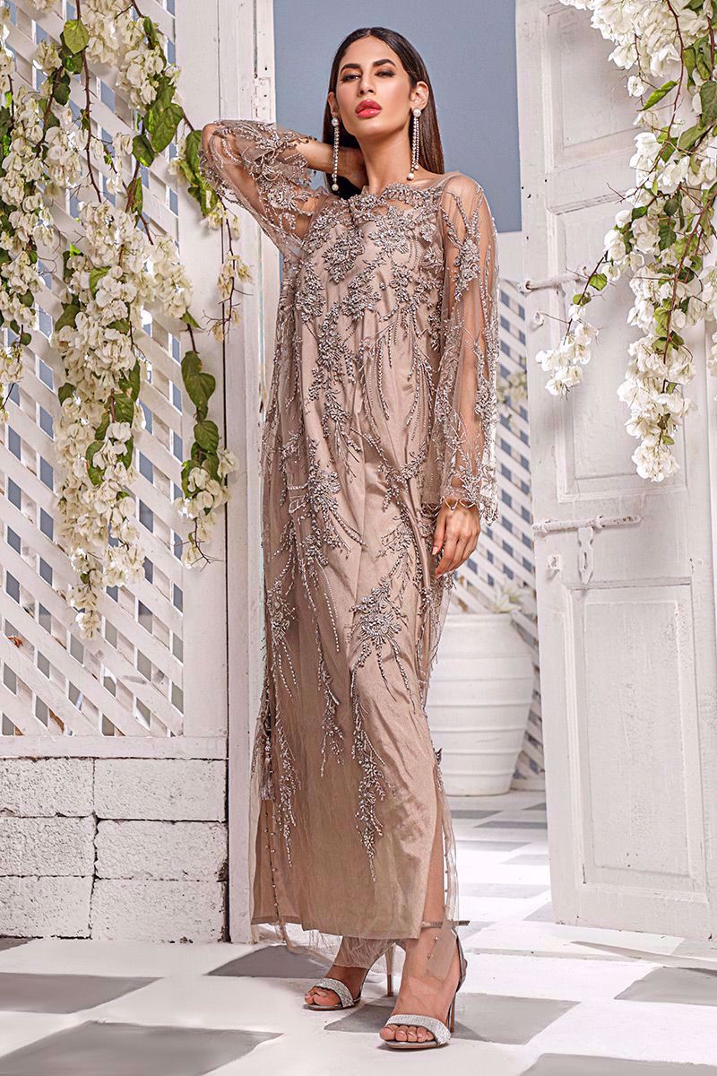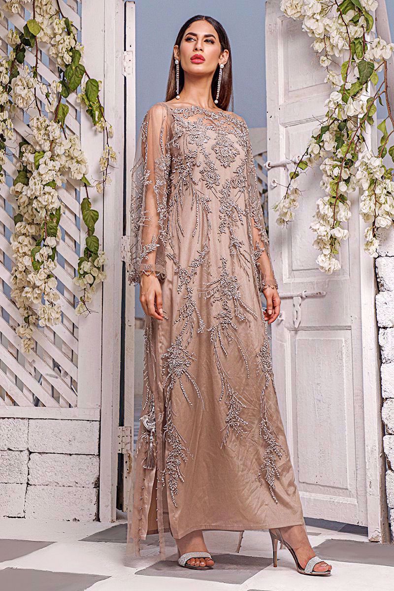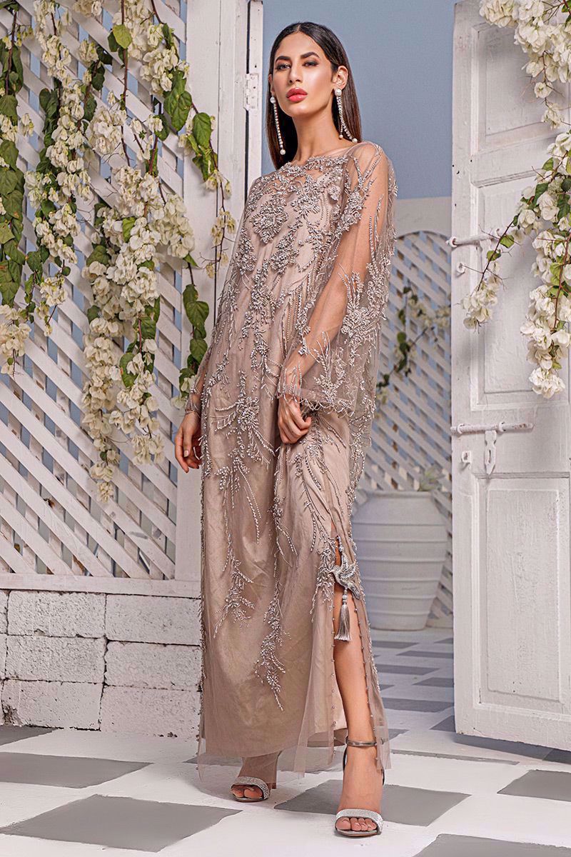 Dazzlingly taupe color lengthy net beaded kaftan has an inspiring French architecture like embellishments spread over the front and back.