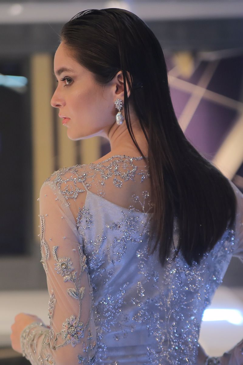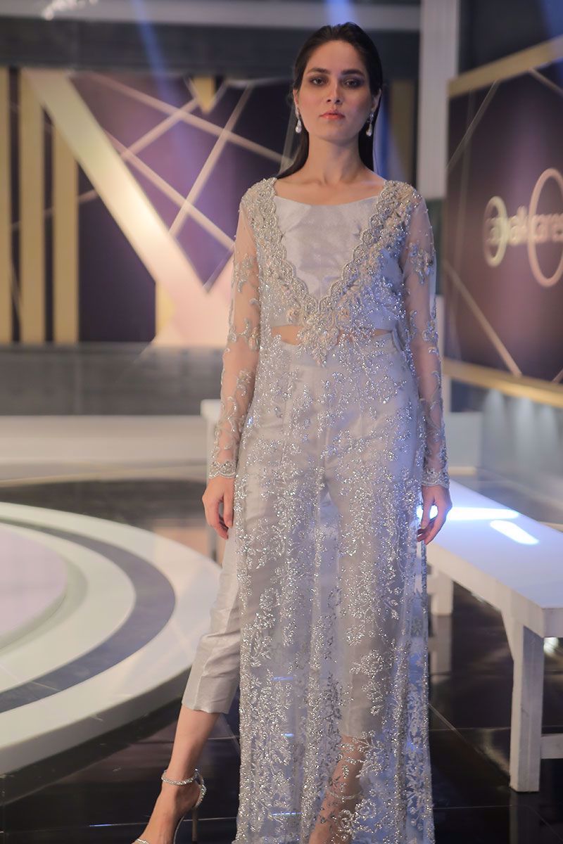 Elegance added to the evening with this glacier grey shimmer long shirt. The elaborated adornments on the neckline is depicted from French architecture infusing it with colored resham, zari, kora, sequins, pearls and cutdana. The look is finished off with same color silk pants.