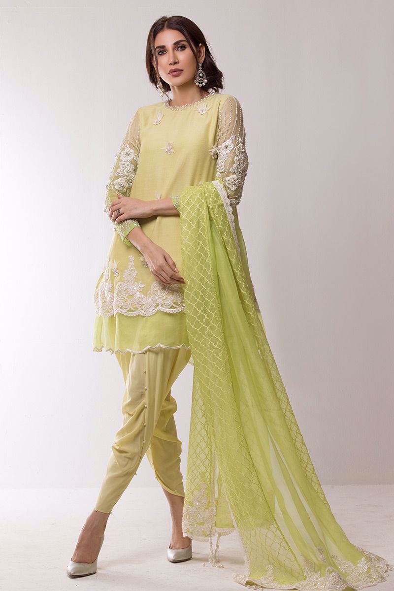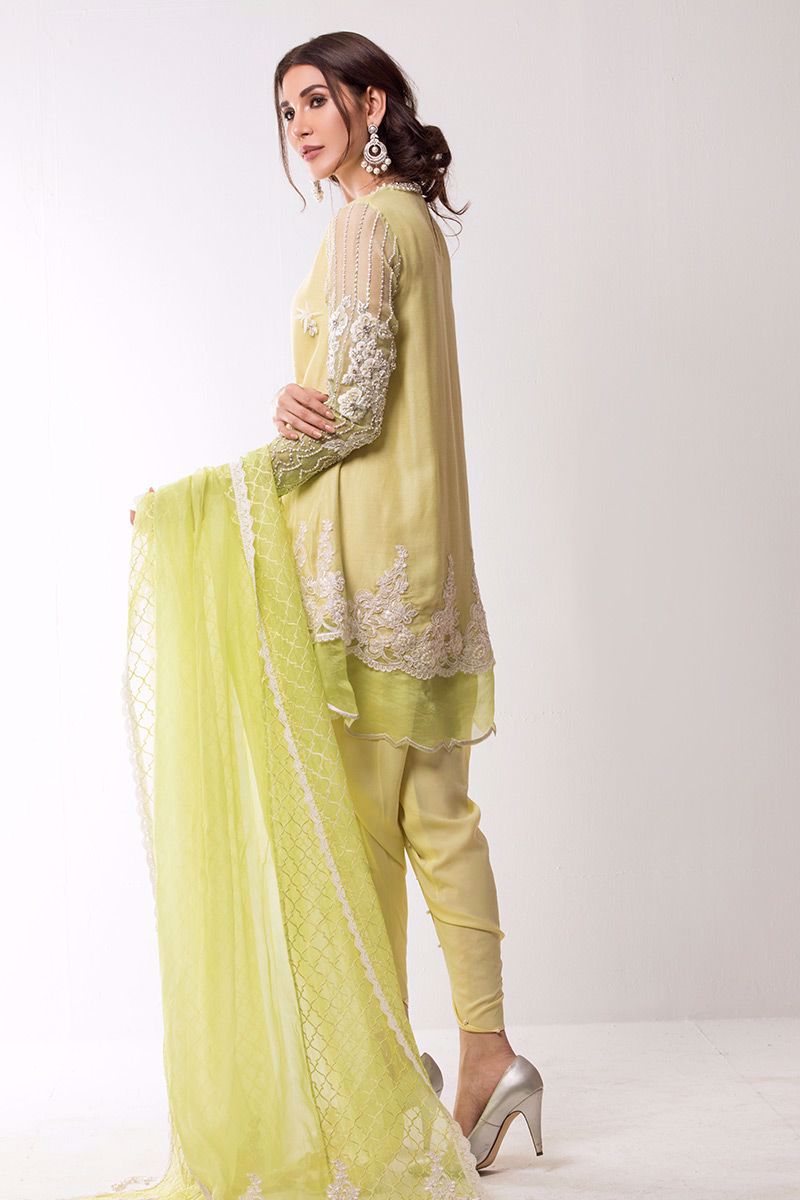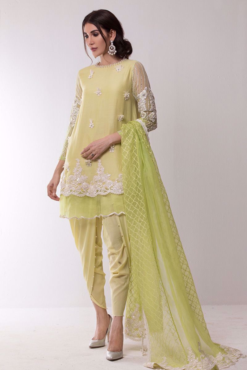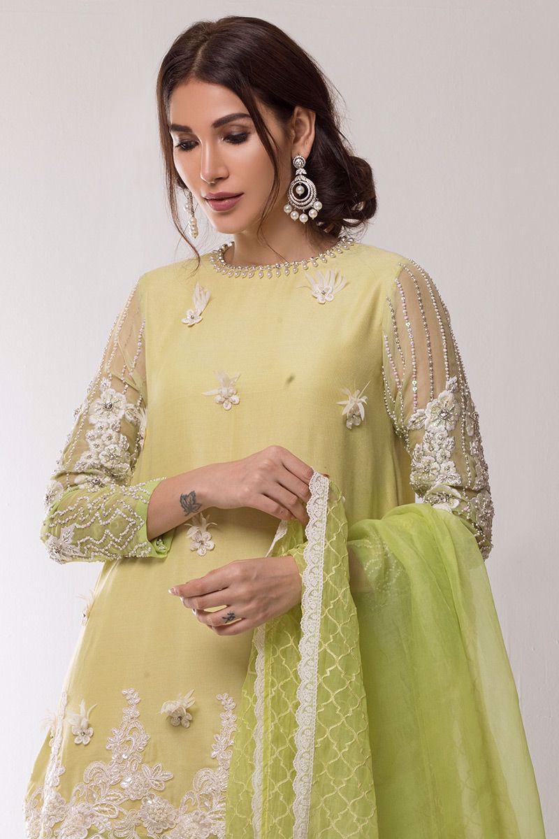 A beautiful embroidered organza Dupatta with four side laces and hanging tassels and Tulip Pants can be additionally bought to complete the look of this gorgeous Outfit.