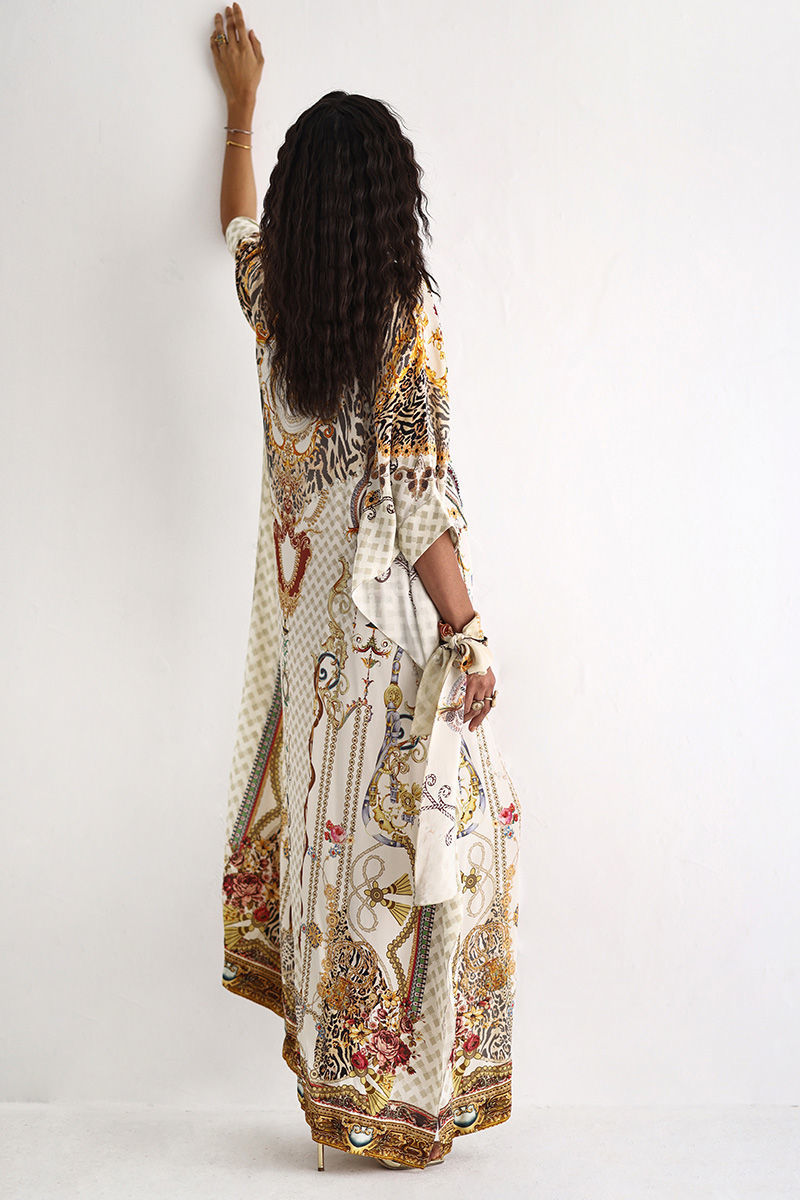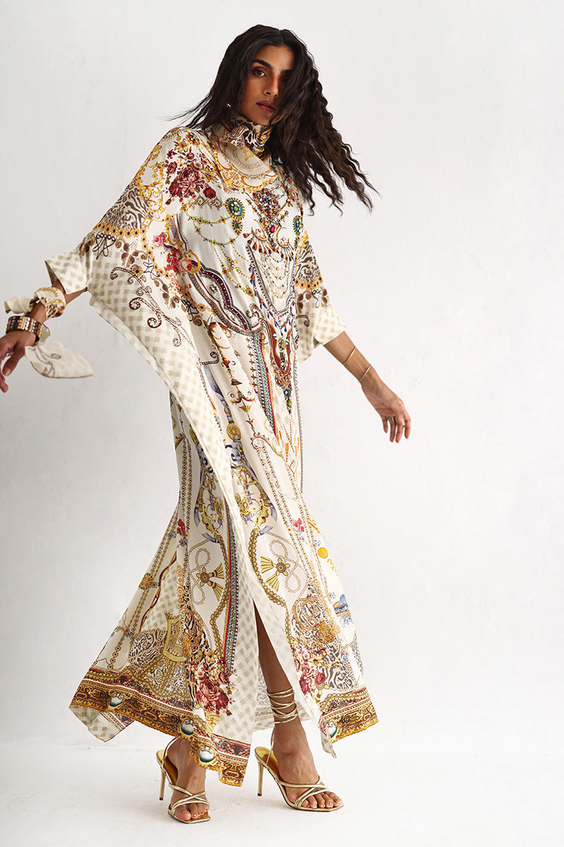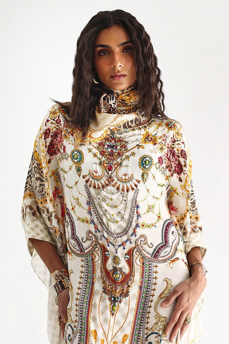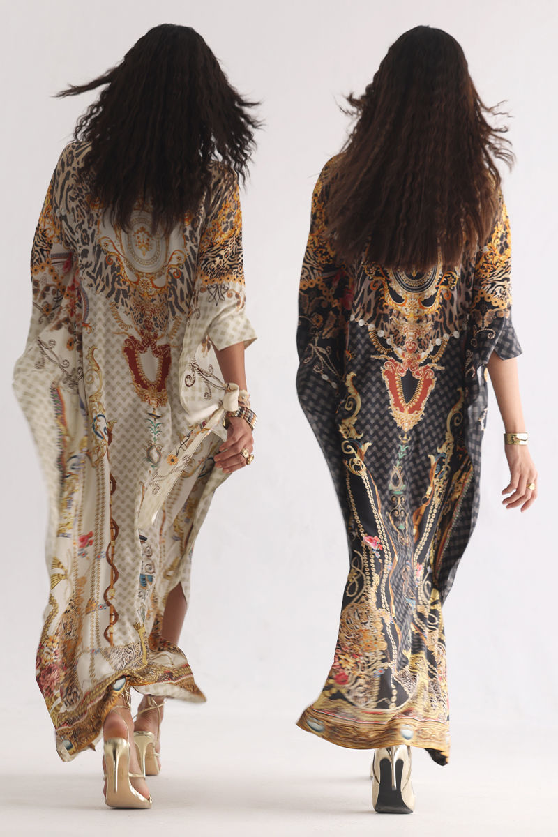 This statement kaftan features a striking digital print, elevated with intricate hand embellishments. Detailed with imported colored stones, textured stones, cutdana, metals, crystals, sequins, and delicate 3D flowers, the design reflects exceptional craftsmanship and depth. A perfect blend of modern elegance and artisanal detailing, this kaftan is ideal for festive evenings and elevated celebrations.