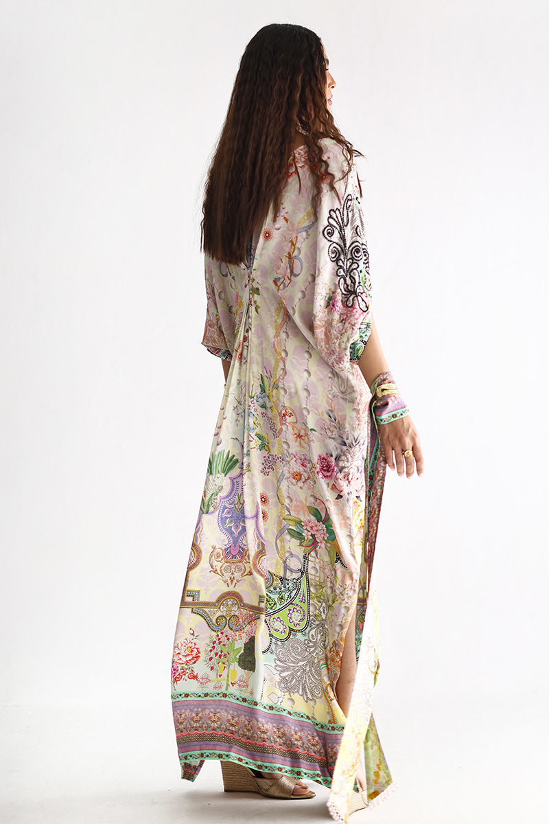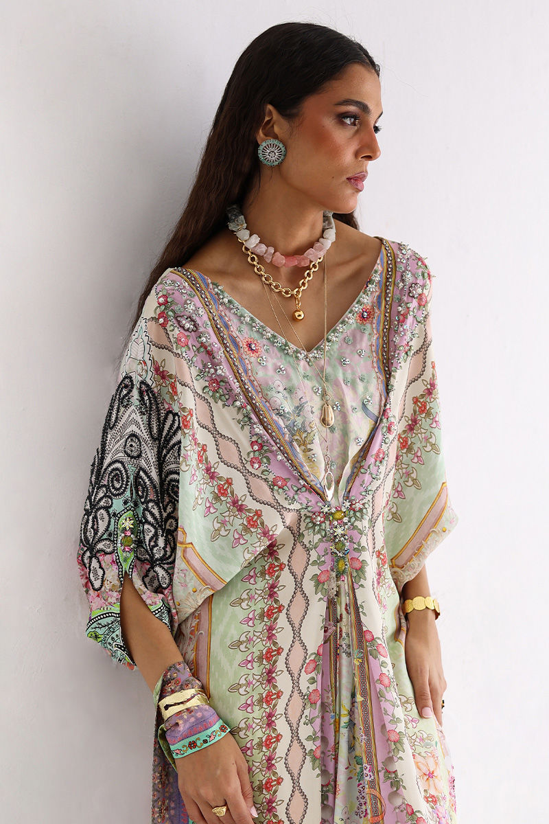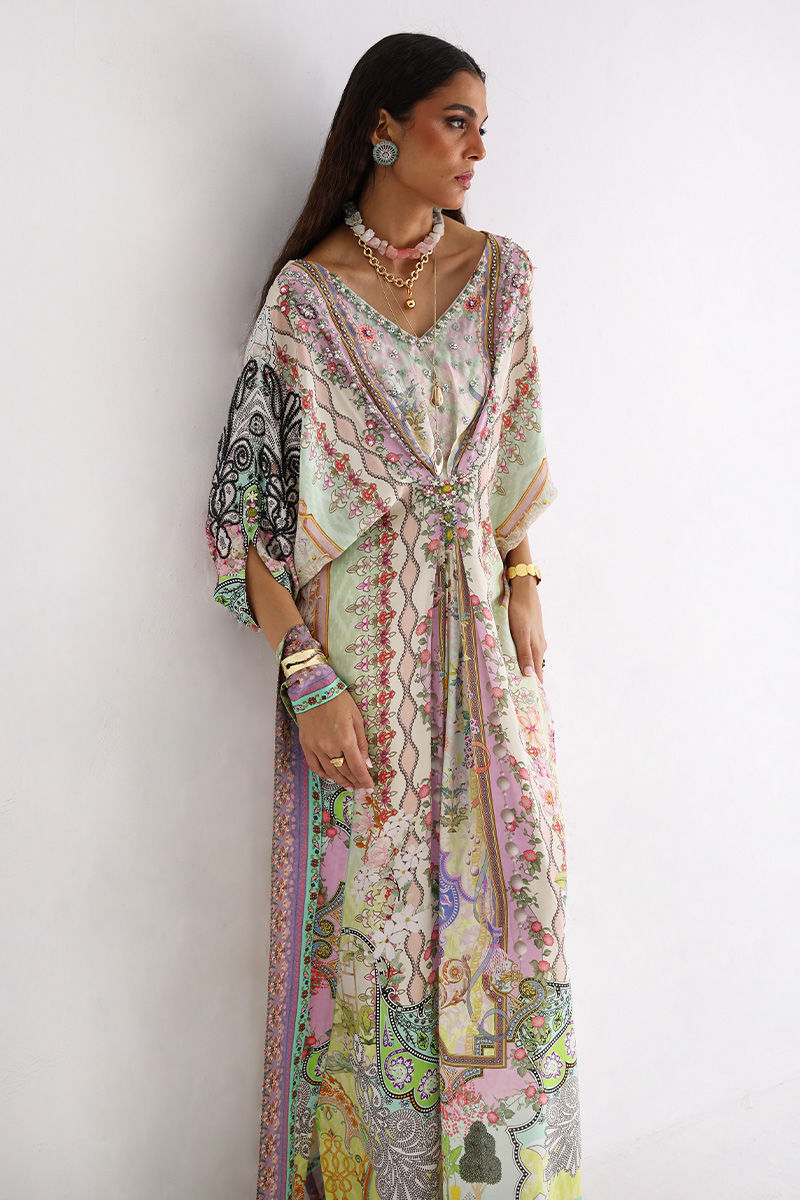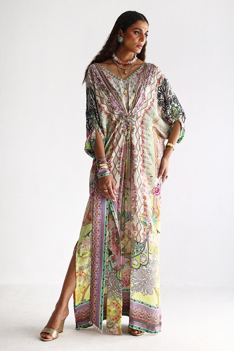 This Lily Green kaftan is crafted from fluid pure crepe and features a striking digital print enhanced with intricate hand embellishments. Imported colored stones, textured stones, cutdana, shimmering sequins, and delicate pearls add depth and refined elegance. Effortless yet statement-making, this kaftan is perfect for festive occasions and graceful evening wear.