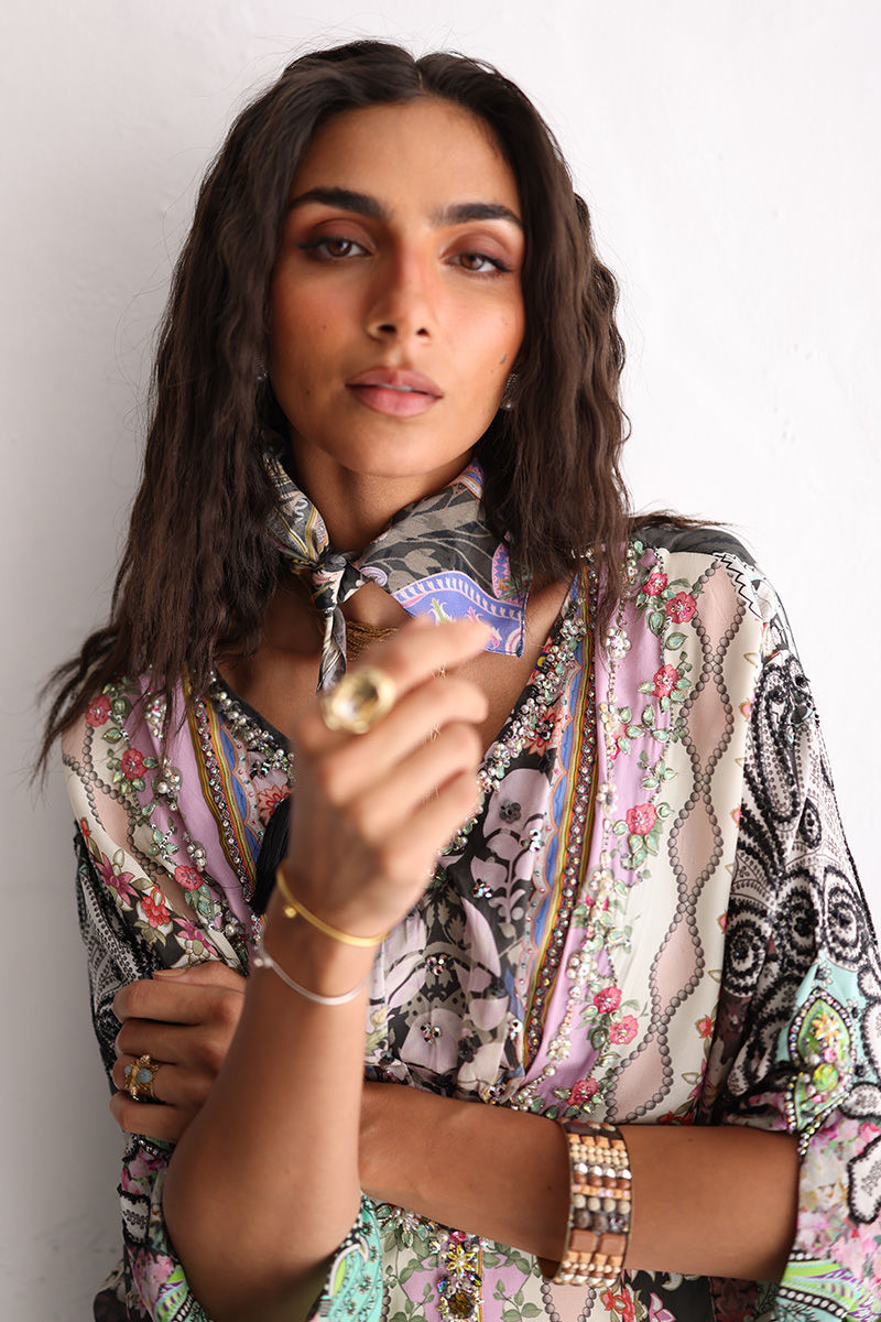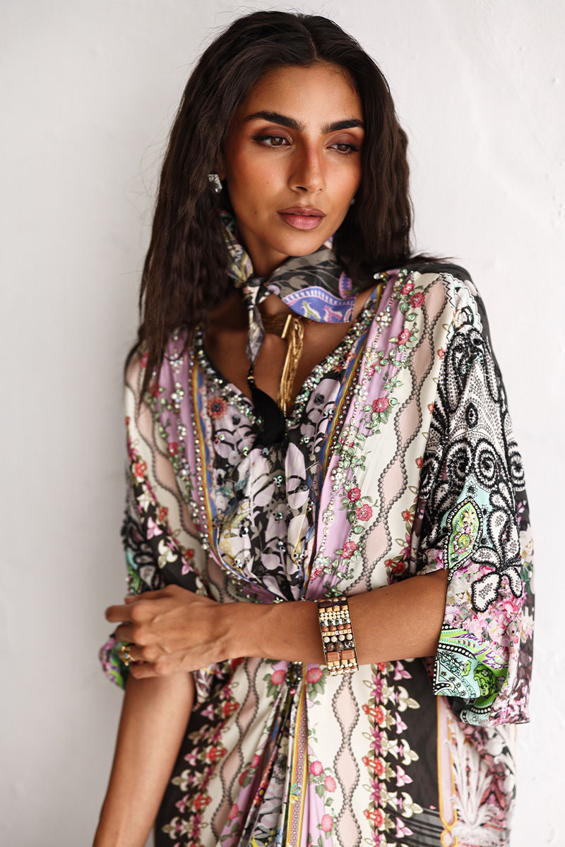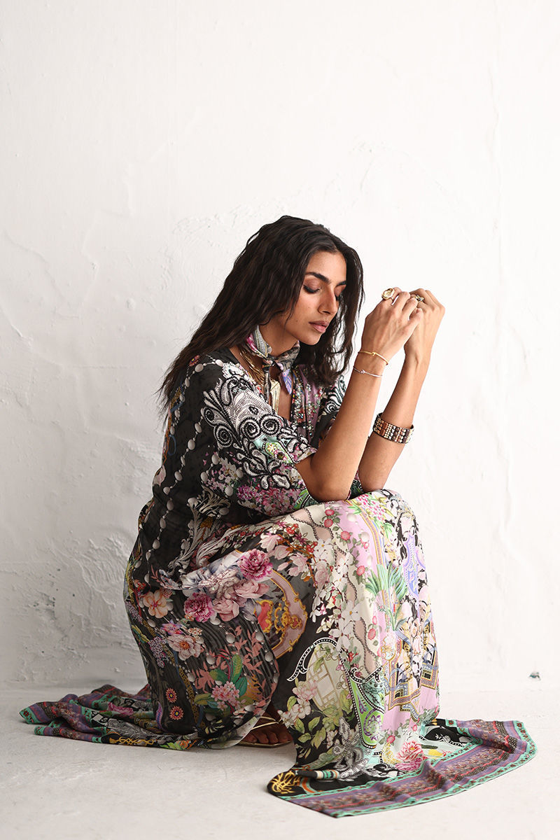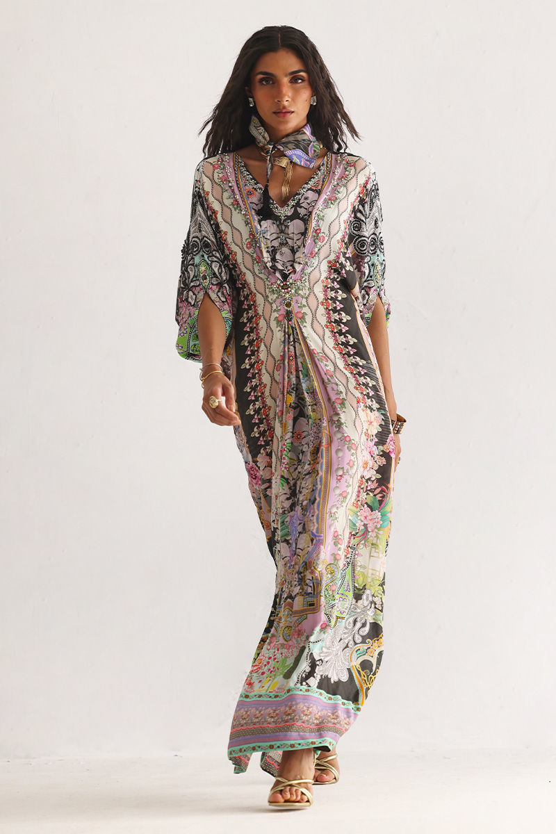 This kaftan is crafted from pure crepe and features a captivating digital print, elevated with delicate hand embellishments. Imported colored stones, textured stones, cutdana, sequins, and pearls add subtle sparkle and depth. Designed for effortless elegance, it’s an ideal choice for festive occasions and elevated evening wear.