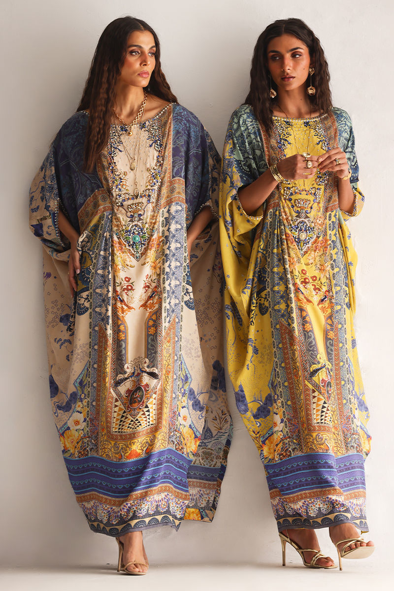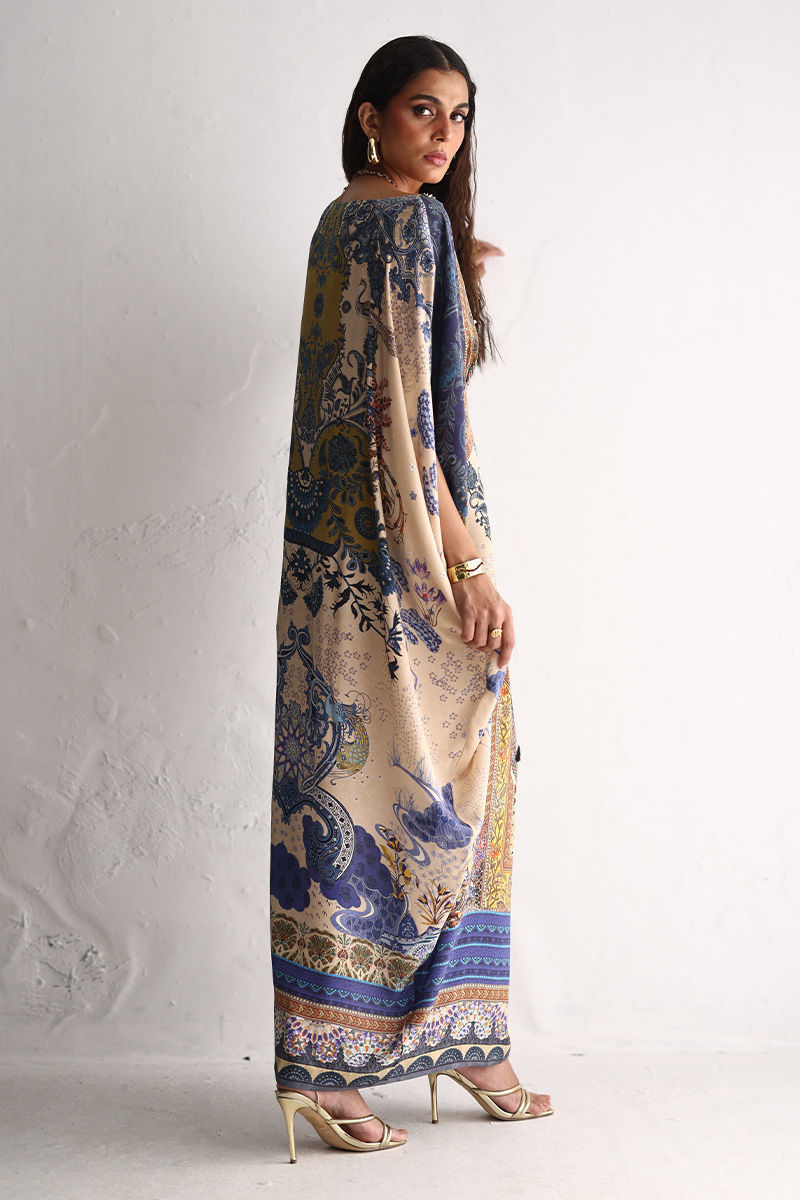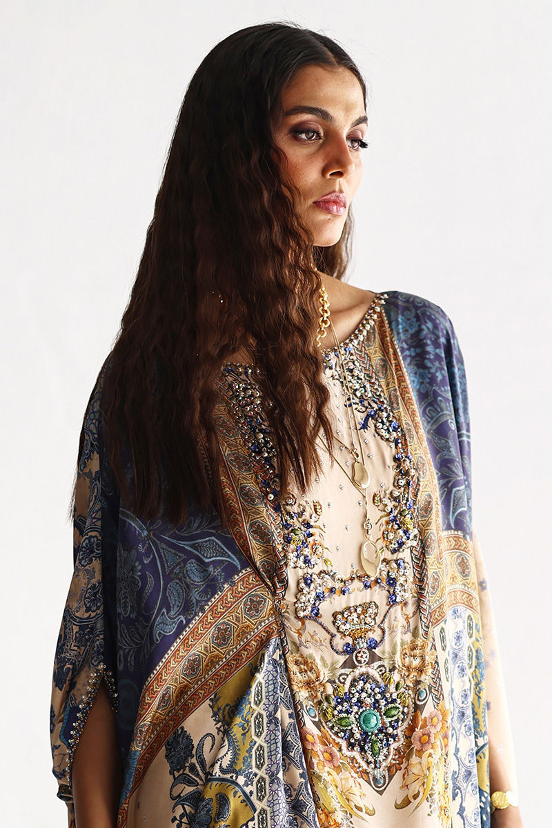 This kaftan features a striking digital print, elevated with intricate hand embellishments. Imported colored stones, textured stones, cutdana, sequins, luminous pearls, and crystals come together to add depth and refined sparkle. Designed for effortless elegance, this statement kaftan is perfect for festive occasions and evening wear.