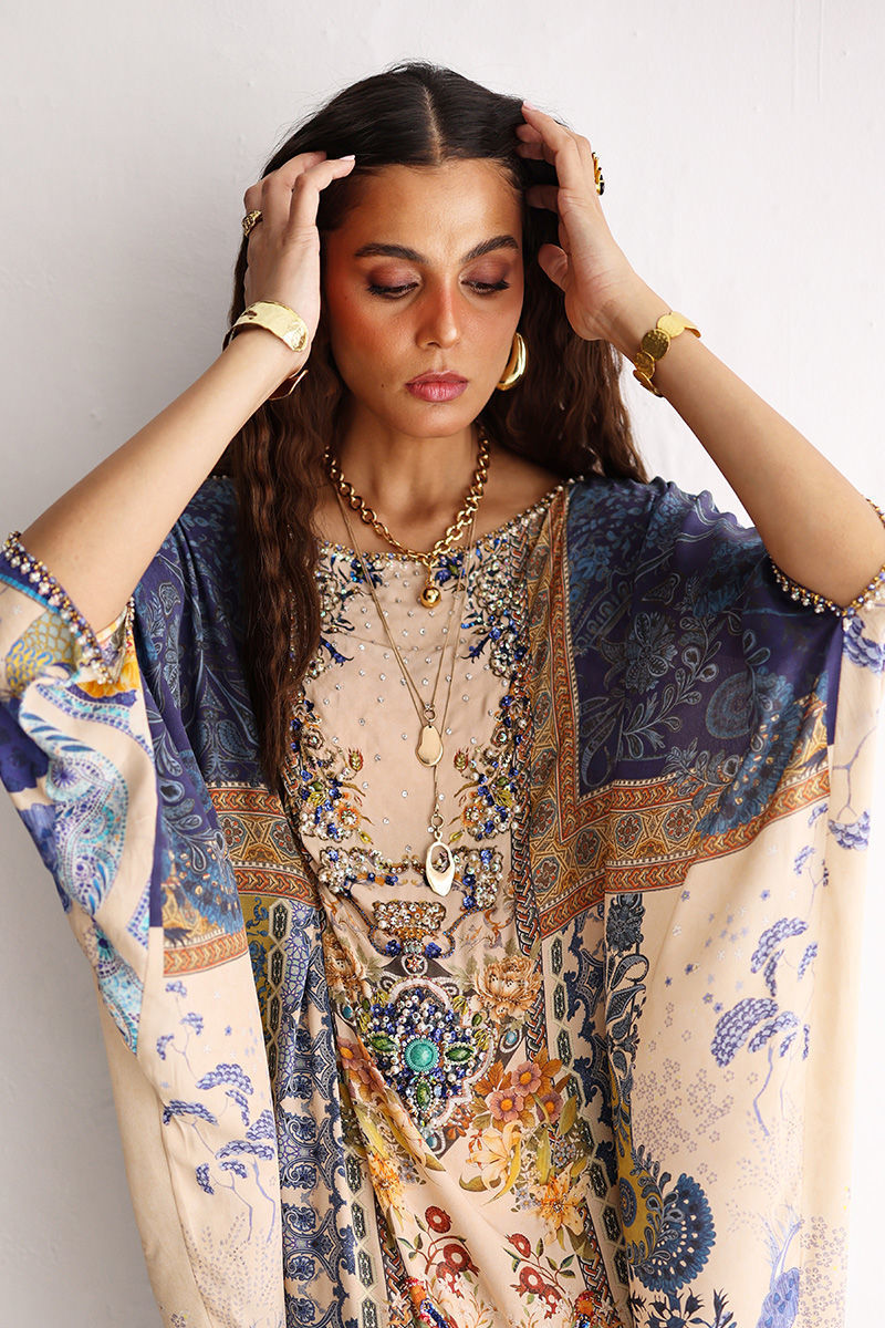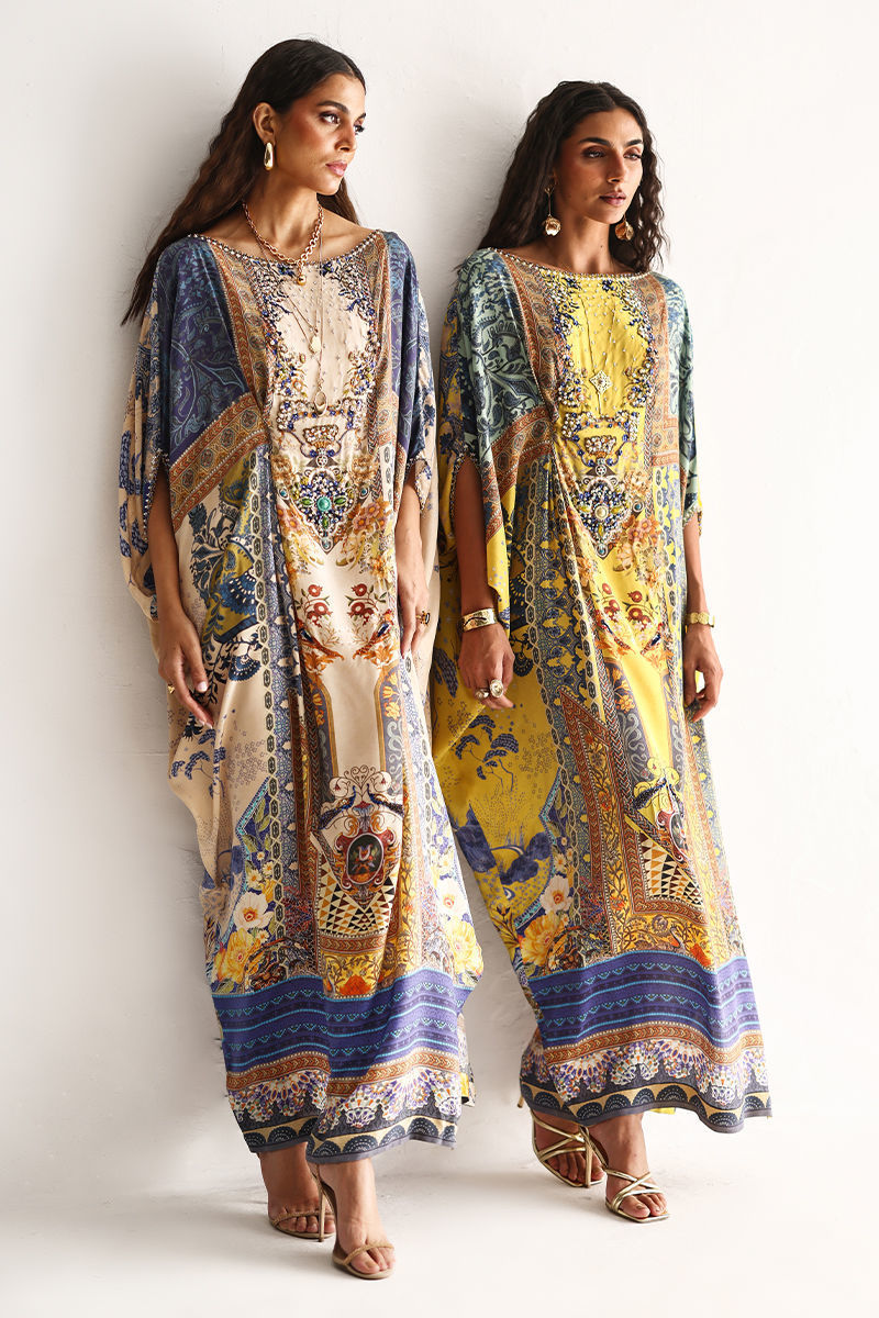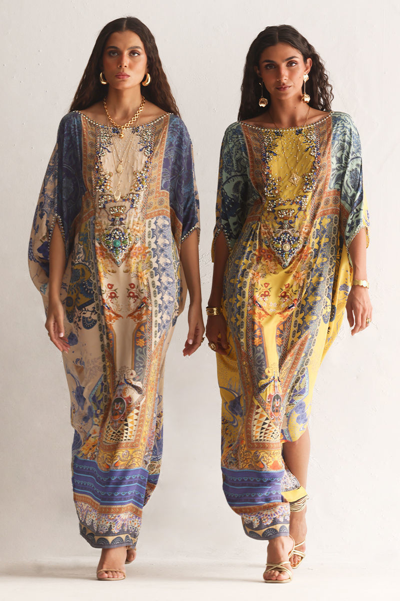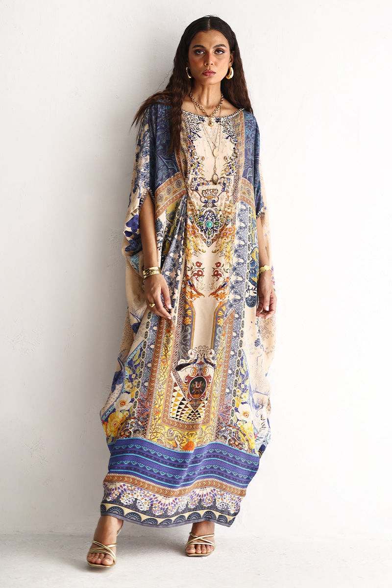 This kaftan features a striking digital print, elevated with intricate hand embellishments. Imported colored stones, textured stones, cutdana, sequins, luminous pearls, and crystals come together to add depth and refined sparkle. Designed for effortless elegance, this statement kaftan is perfect for festive occasions and evening wear.