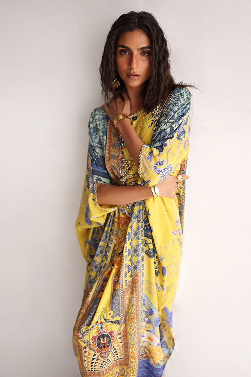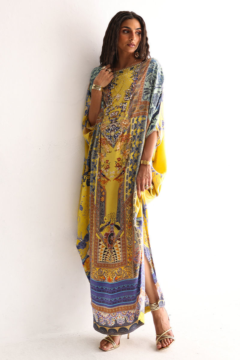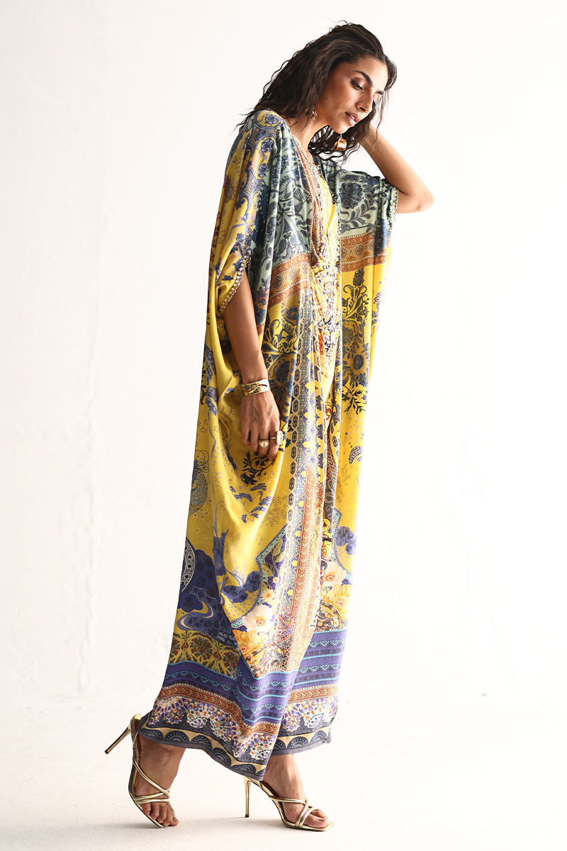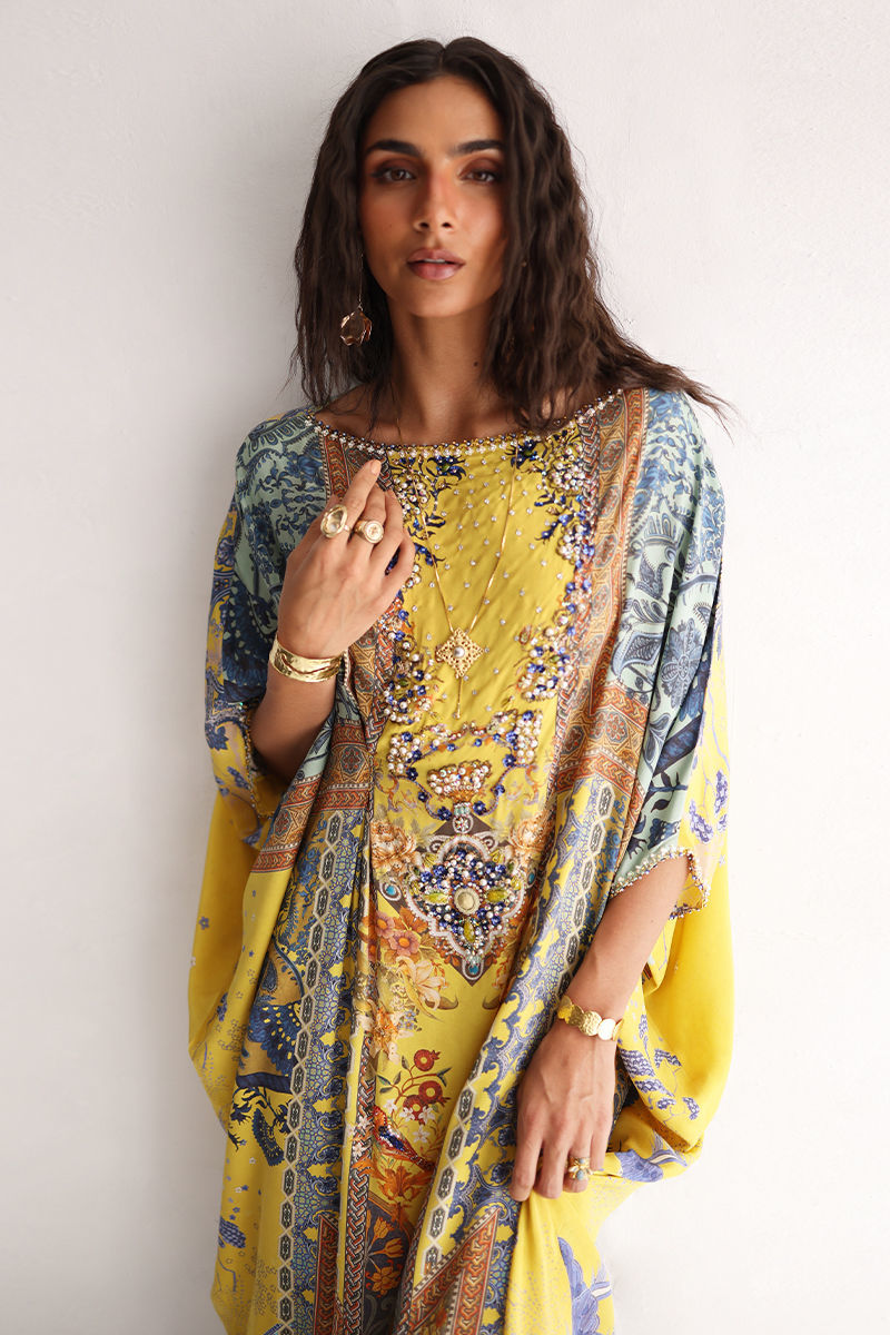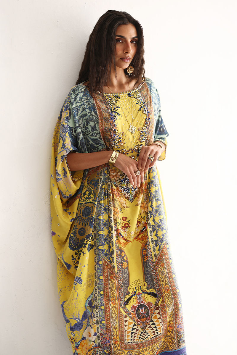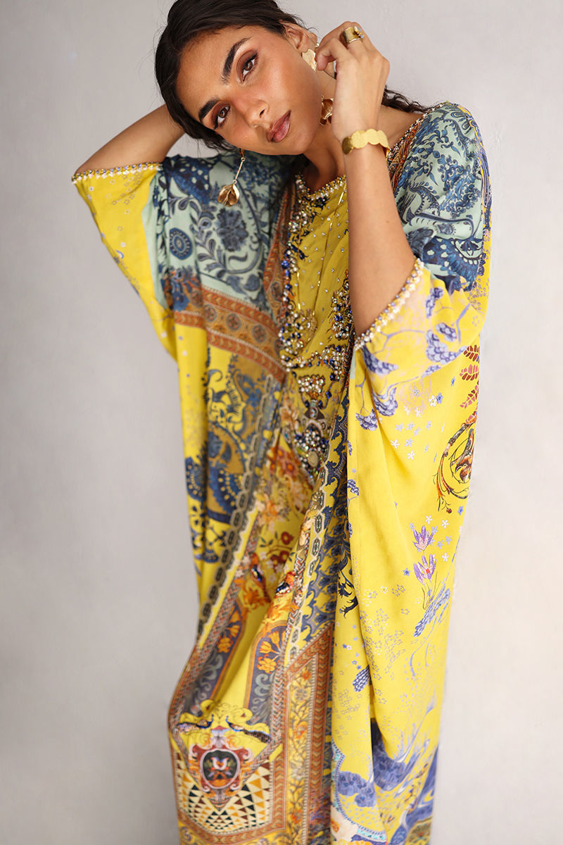 This kaftan showcases a striking digital print, elevated with intricate hand embellishments. Imported colored stones, textured stones, cutdana,sequins, pearls, and crystals add refined depth and subtle sparkle. Effortlessly elegant and statement-making, this kaftan is perfect for festive occasions and evening wear.