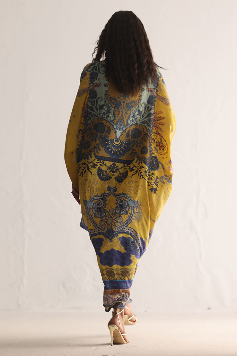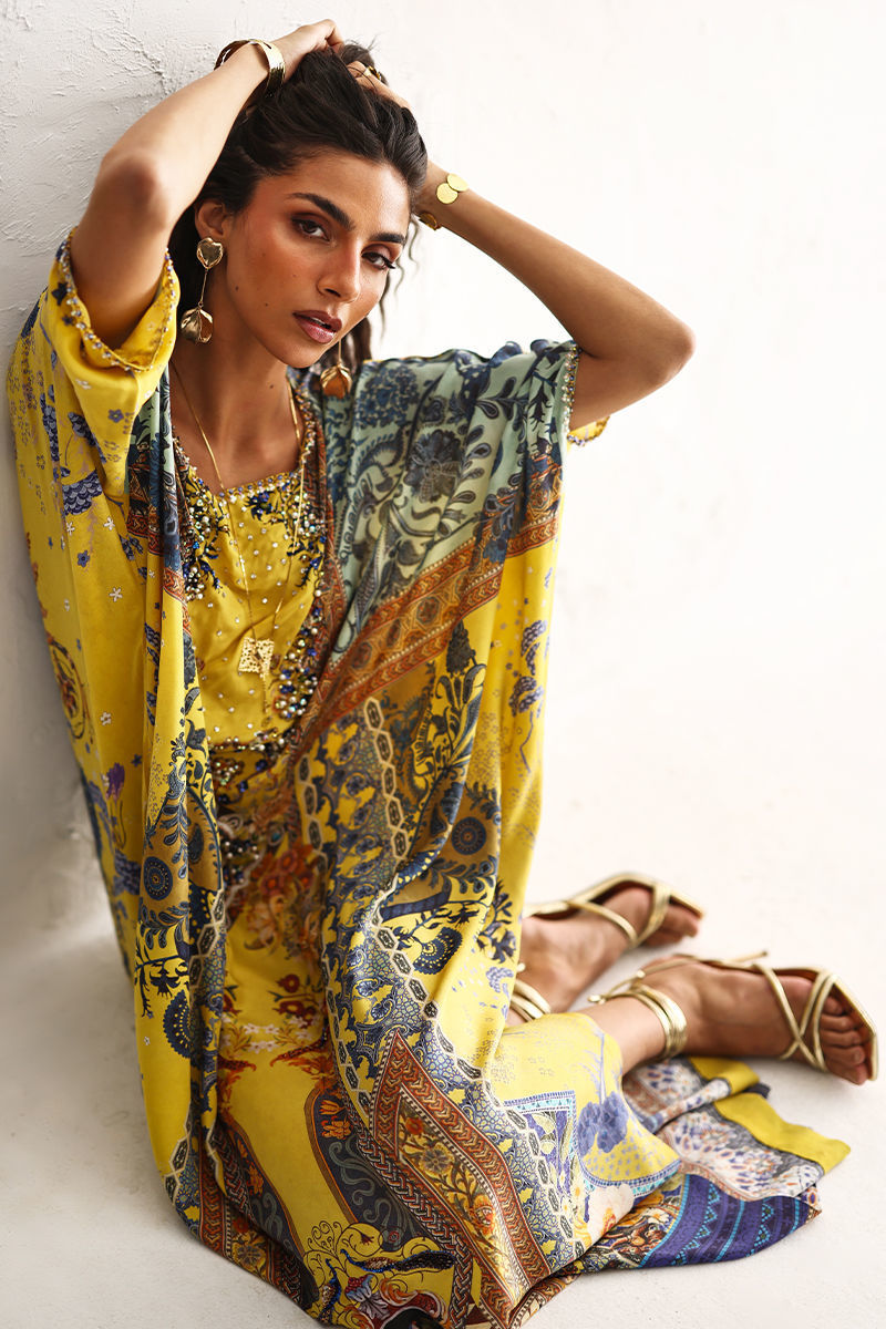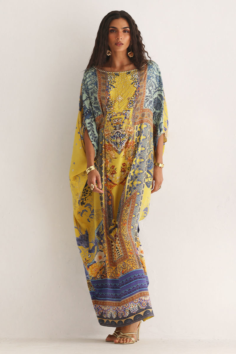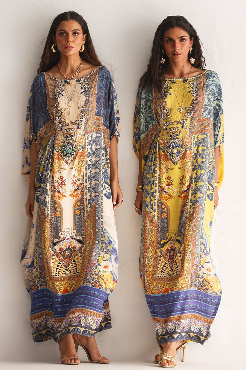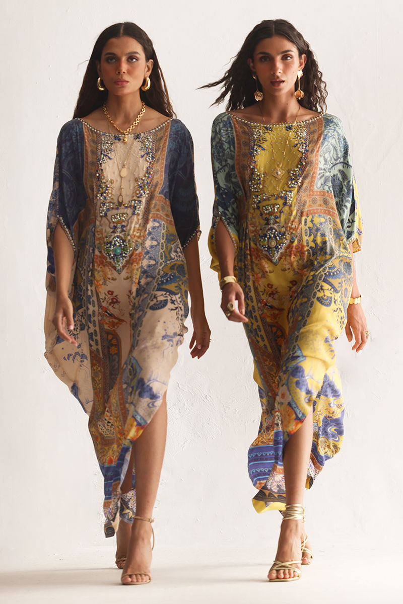 This kaftan showcases a striking digital print, elevated with intricate hand embellishments. Imported colored stones, textured stones, cutdana,sequins, pearls, and crystals add refined depth and subtle sparkle. Effortlessly elegant and statement-making, this kaftan is perfect for festive occasions and evening wear.