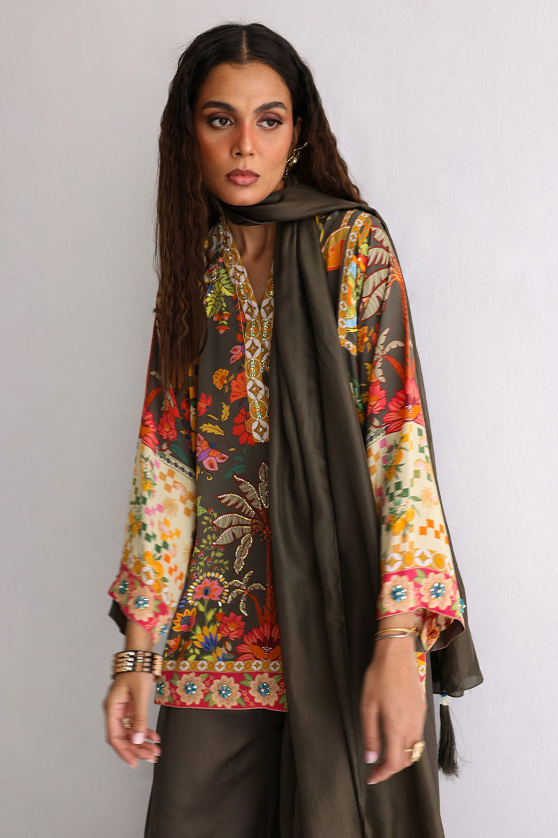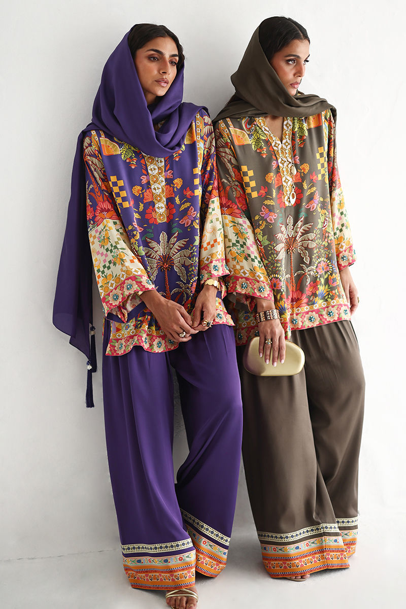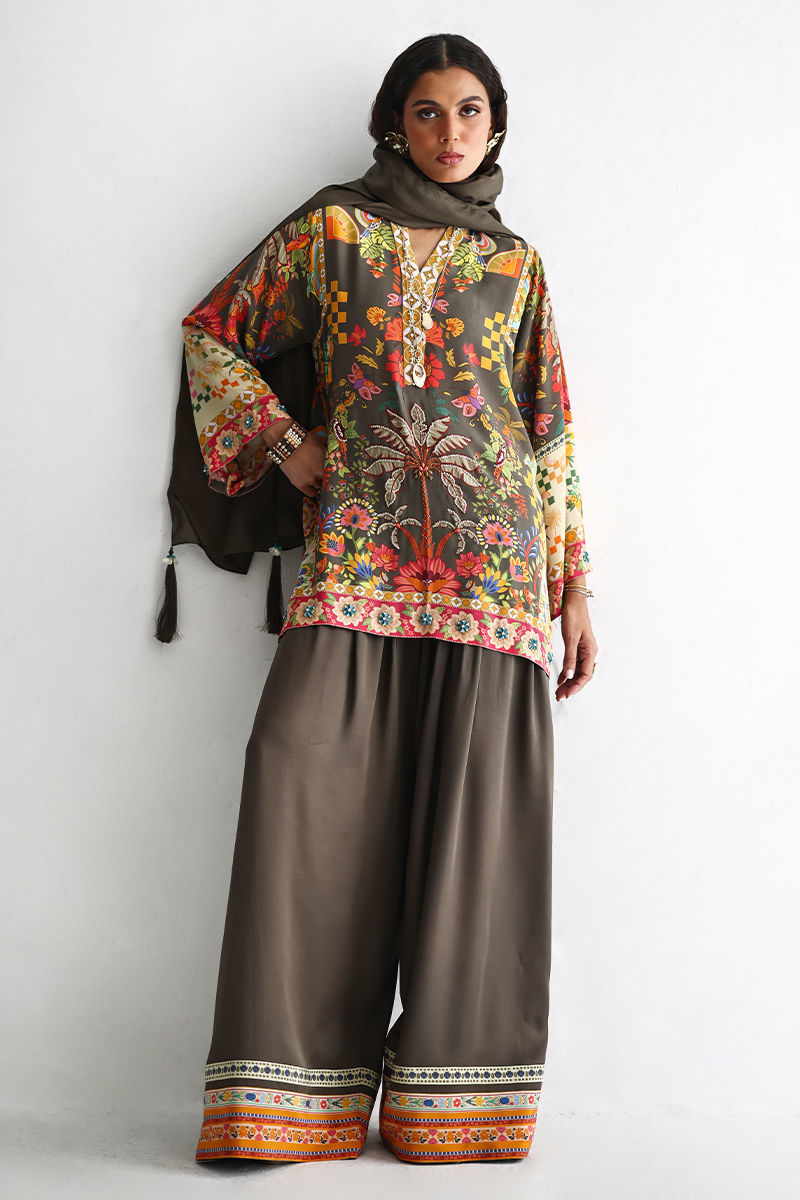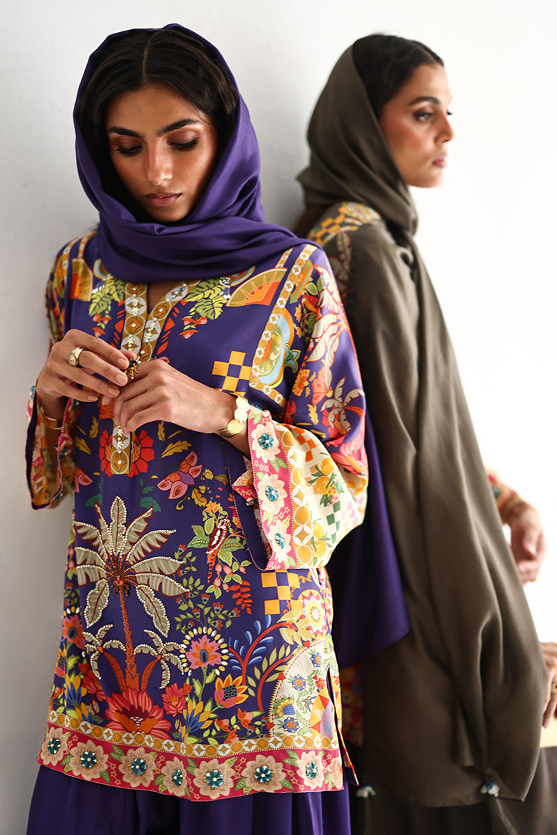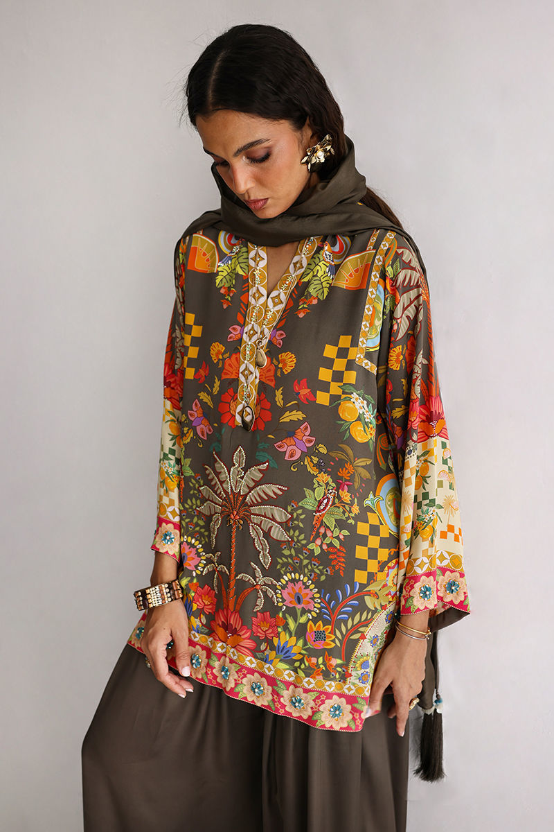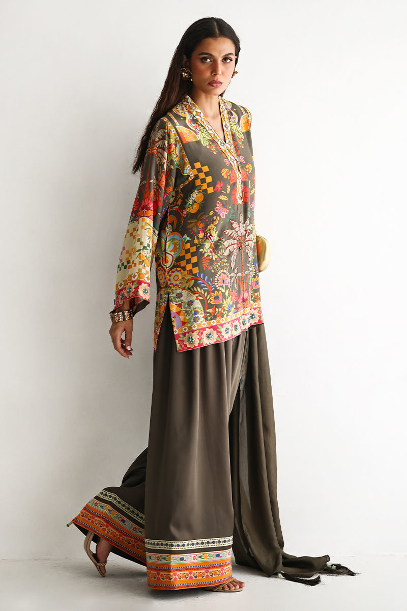 This lose cut shirt with pockets features a vibrant digital print, beautifully enhanced with intricate hand embellishments including imported colored stones, 3D flowers, textured sequins, cutdana, and pearls (moti), creating a rich and artisanal finish. It is paired with farshi-style cotton charmeuse culottes, detailed with printed borders at the hem for a contemporary touch. The look is completed with a pure medium silk stole, finished with delicate handmade tassel hangings, adding an effortless elegance to this statement ensemble.