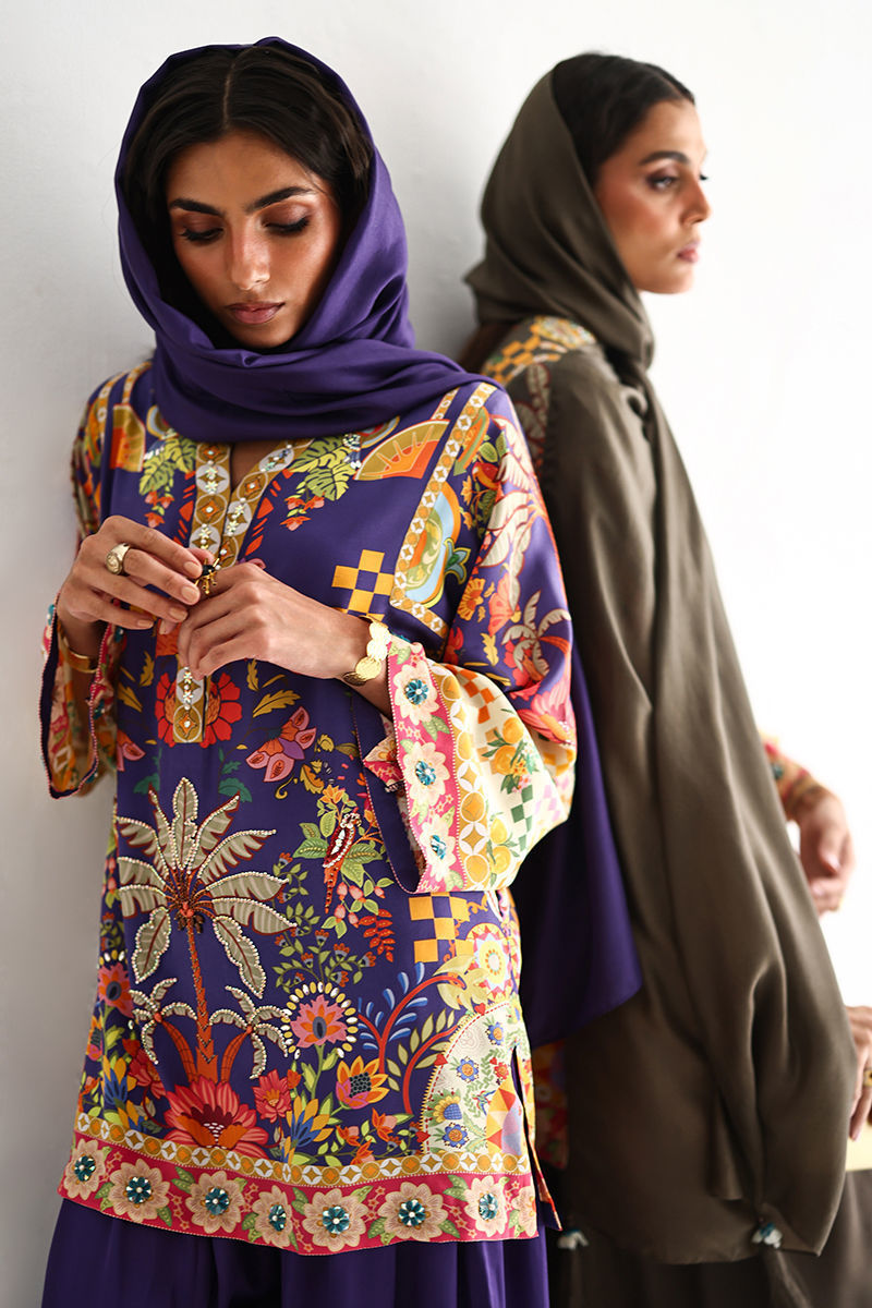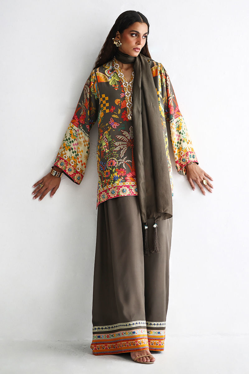 The shirt features a sophisticated digital print, enhanced with delicate hand embellishments of imported colored stones, textured sequins, cutdana, pearls, and crystals, adding depth and subtle sparkle. It is paired with fluid cotton charmeuse culottes, finished with printed borders at the hem for a polished touch. The ensemble is completed with a pure medium silk dupatta in a soft grey and ivory ombré, detailed with elegant lace for a graceful, elevated finish.