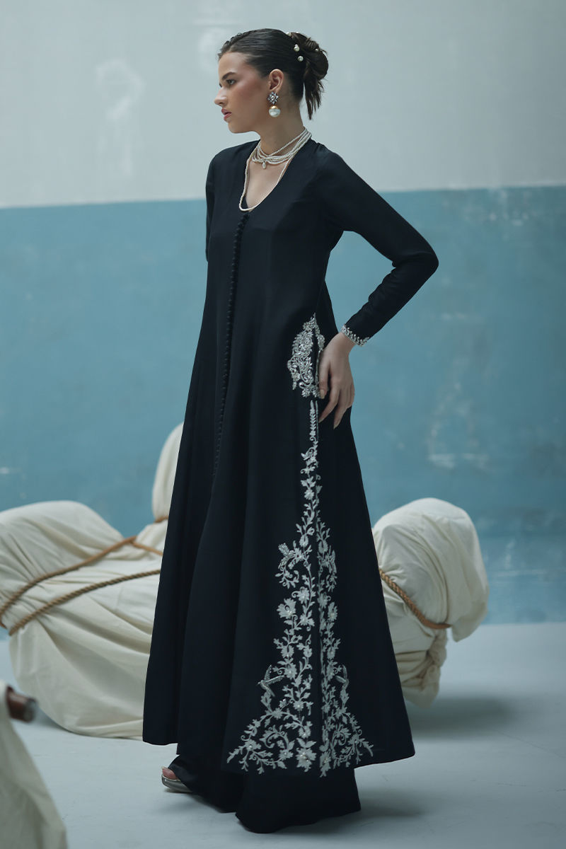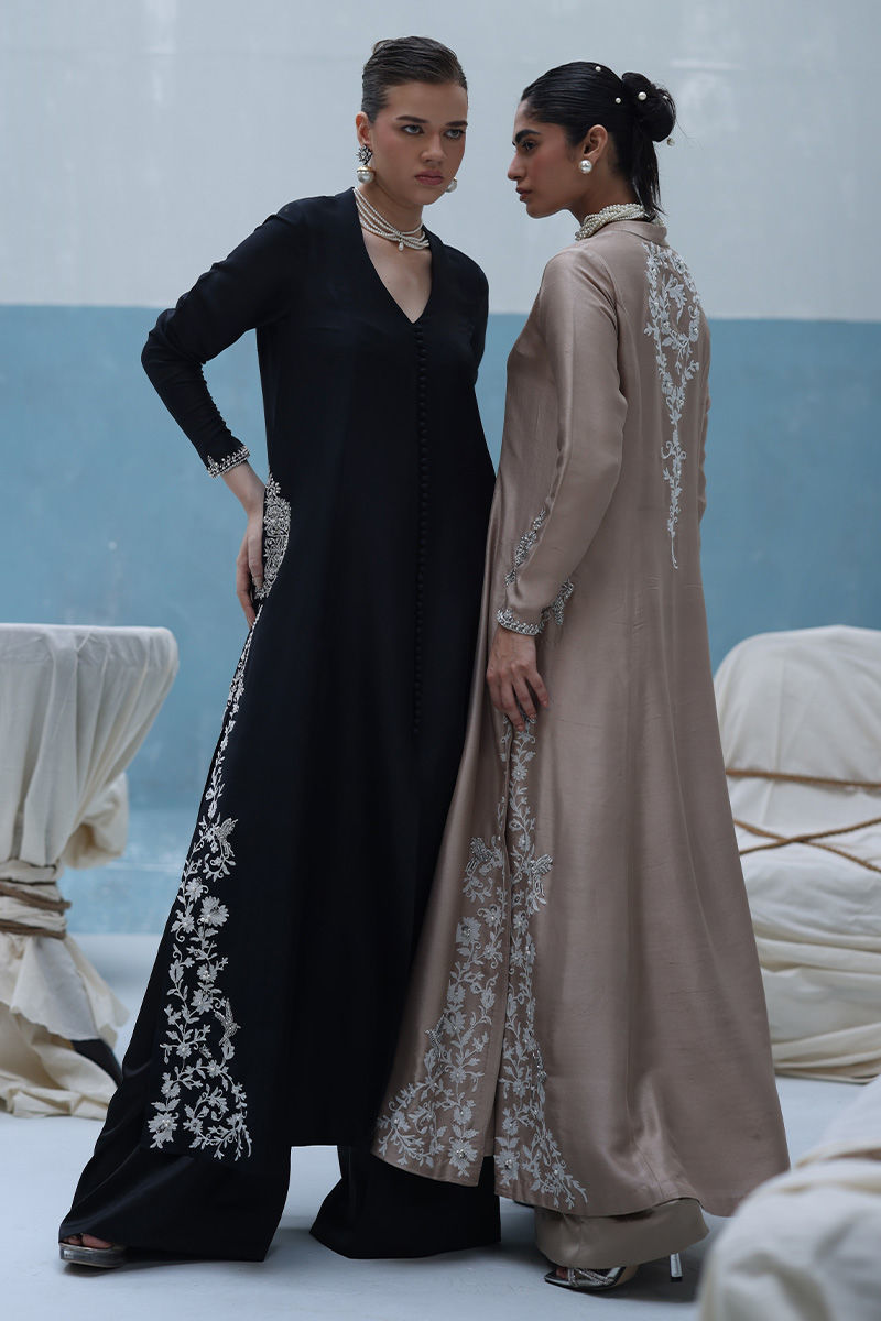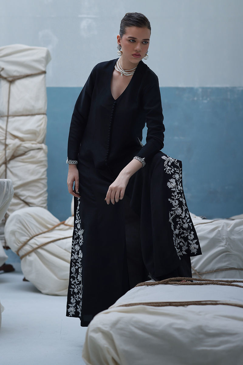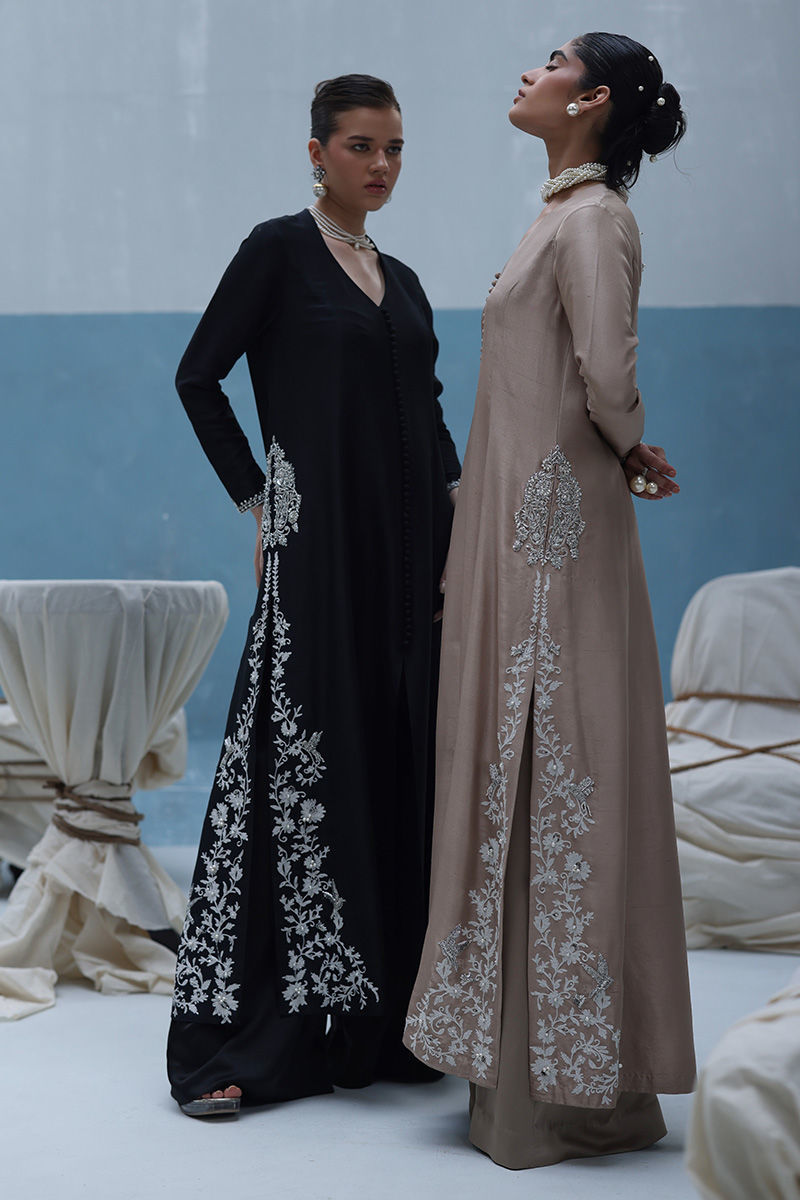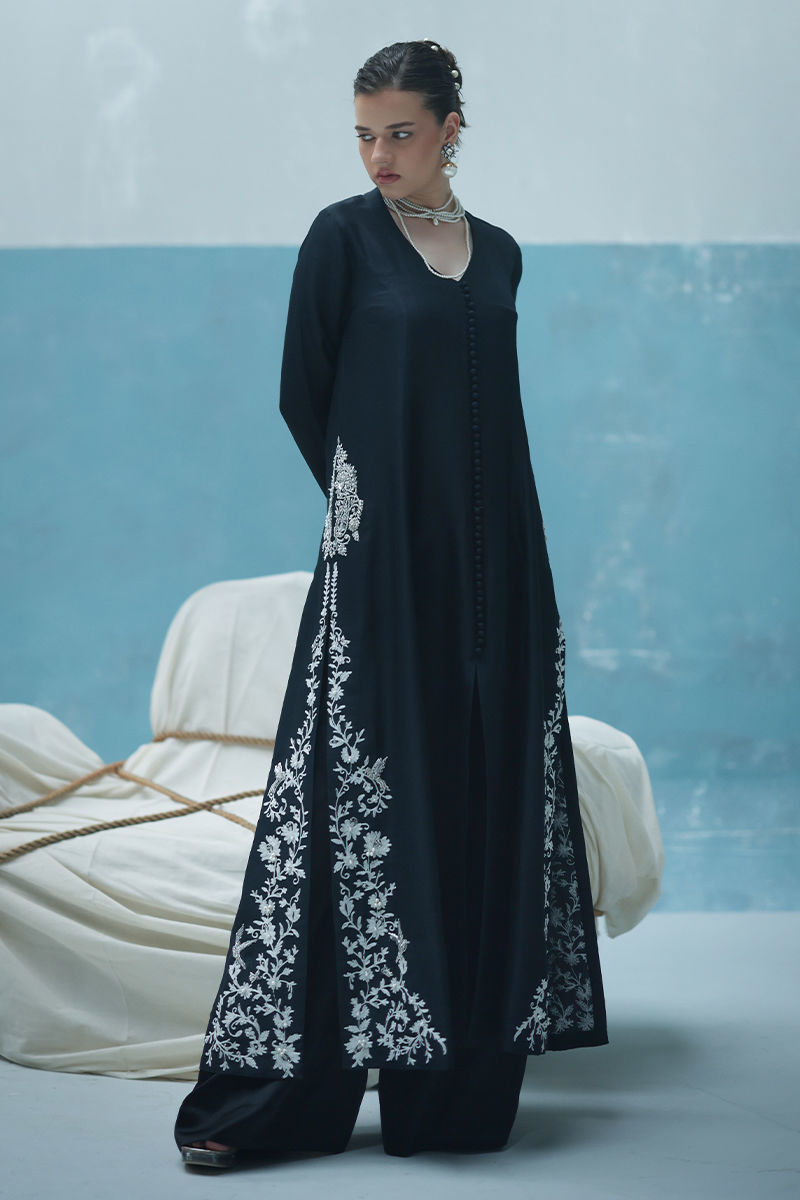 A graceful black pure raw silk 80 gms outfit featuring resham ari work, hand-embroidered with dabka, pearls, sequins, tikki stones, cutdana, and nakshi. The front-open shirt with a Prince panel cut pairs elegantly with shimmer crepe culottes—blending tradition with modern charm.