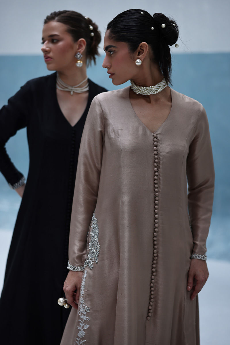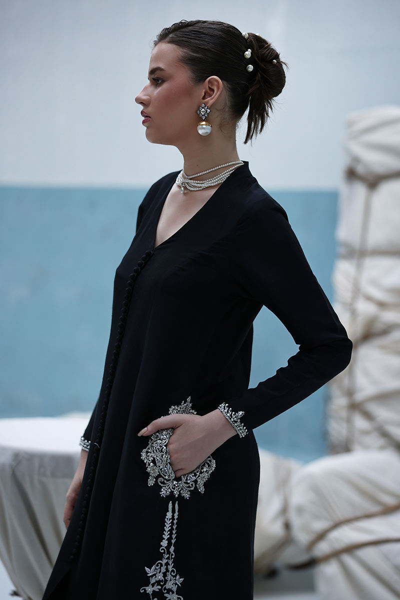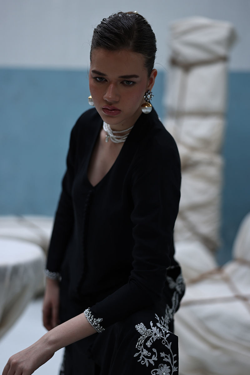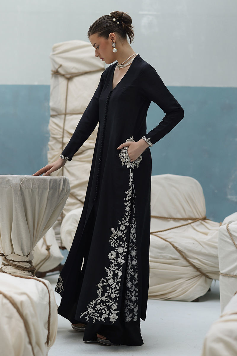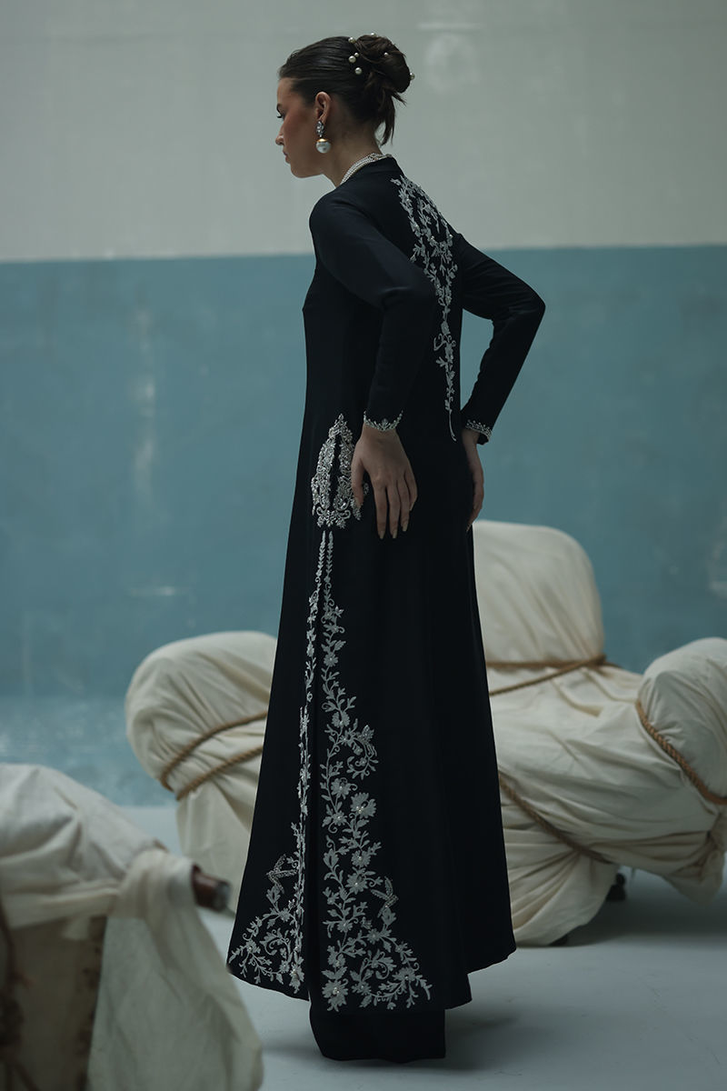 A graceful black pure raw silk 80 gms outfit featuring resham ari work, hand-embroidered with dabka, pearls, sequins, tikki stones, cutdana, and nakshi. The front-open shirt with a Prince panel cut pairs elegantly with shimmer crepe culottes—blending tradition with modern charm.