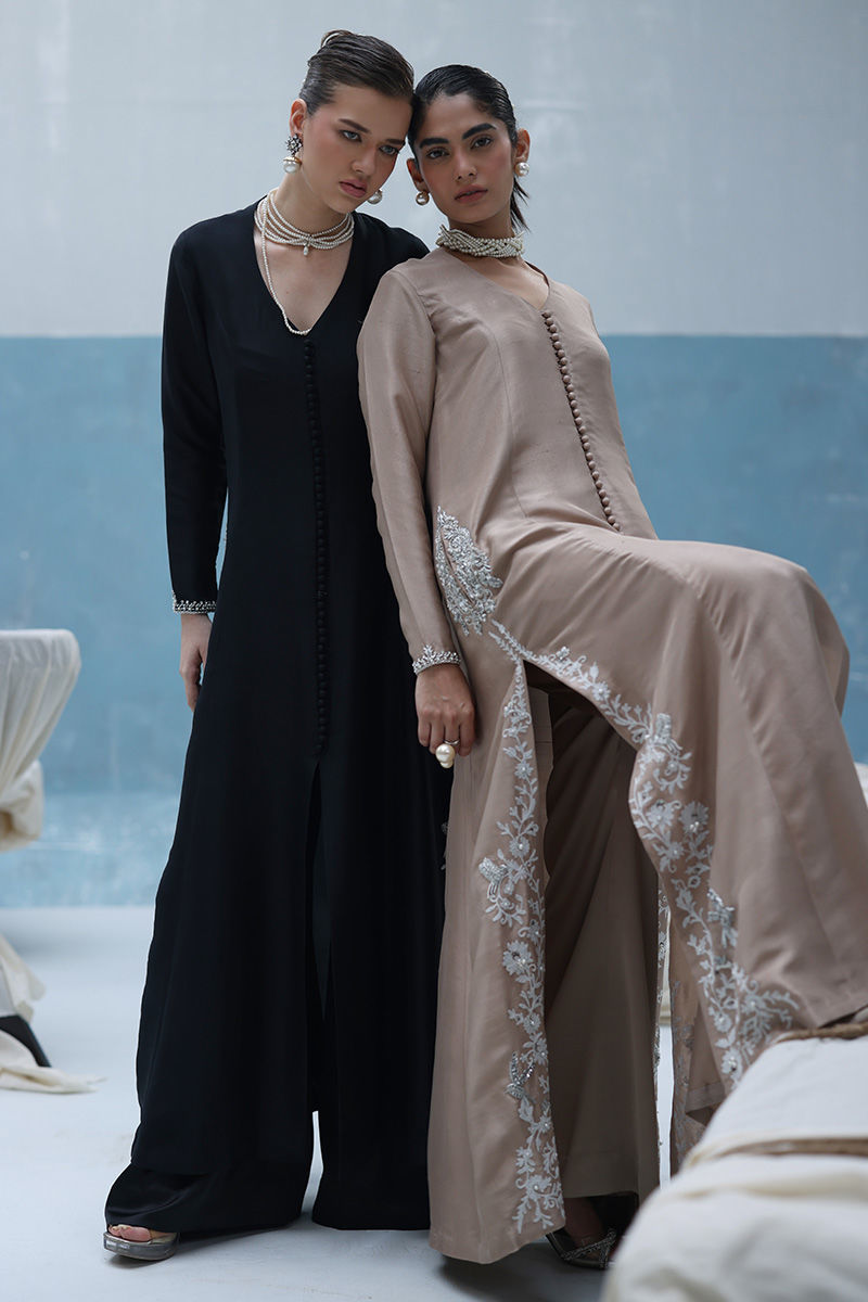 Color: Black Fabric: Shirt: Pure Raw Silk and Culottes: Shimmer Crepe Work Details: Embroidered and Embellished