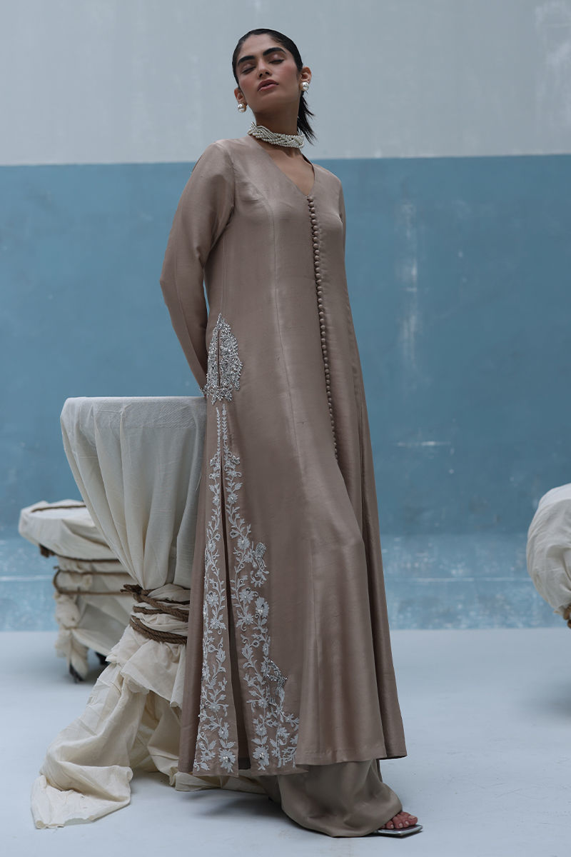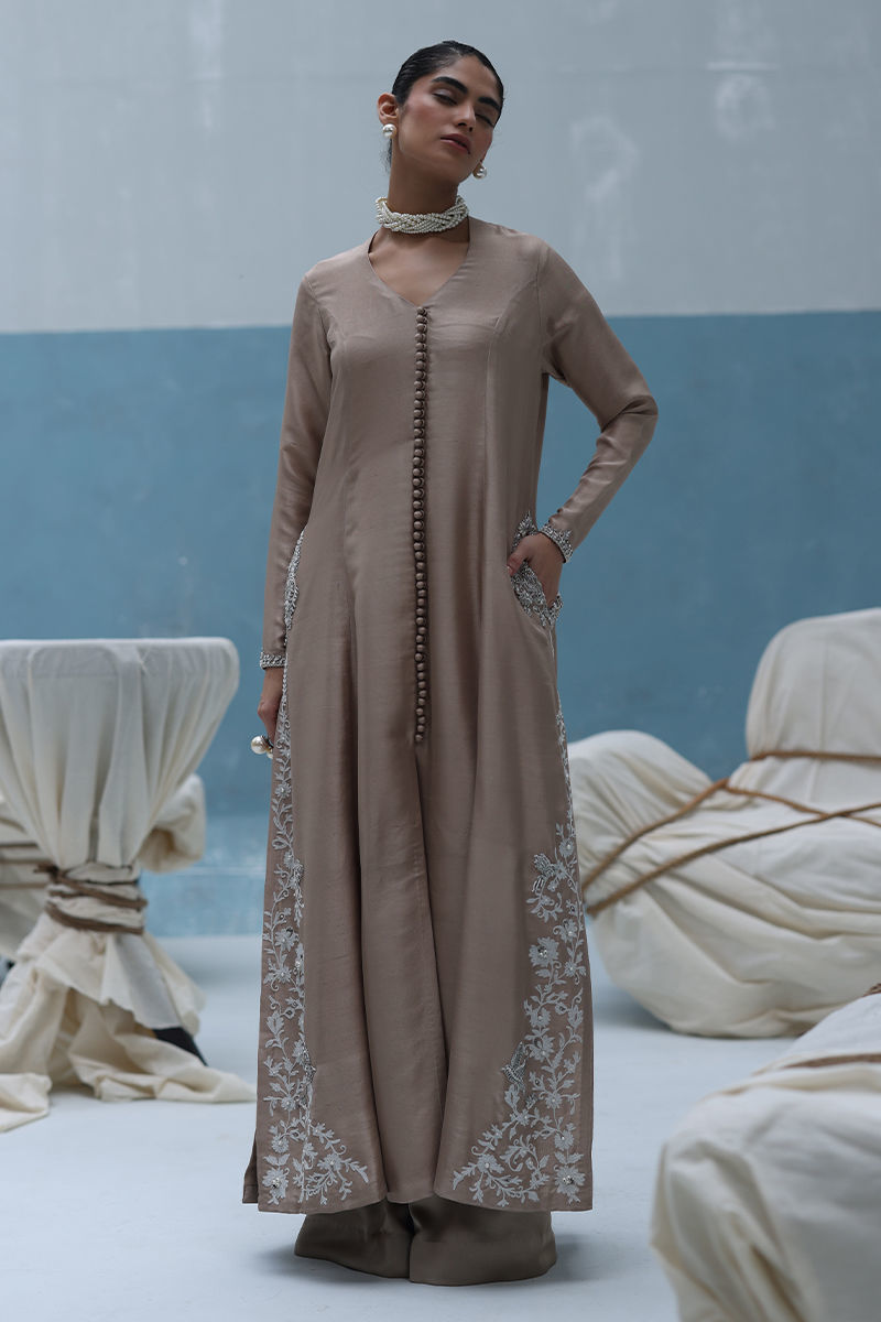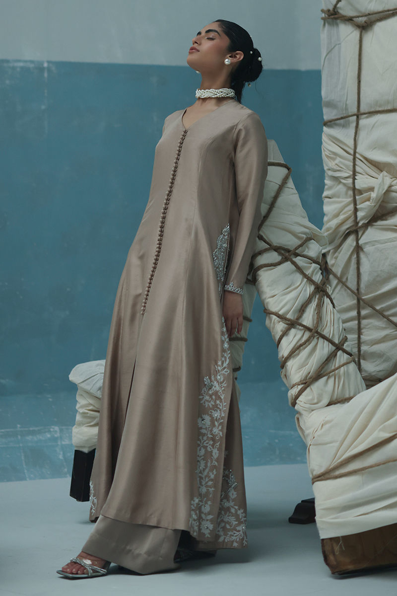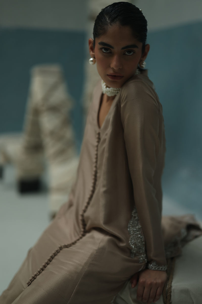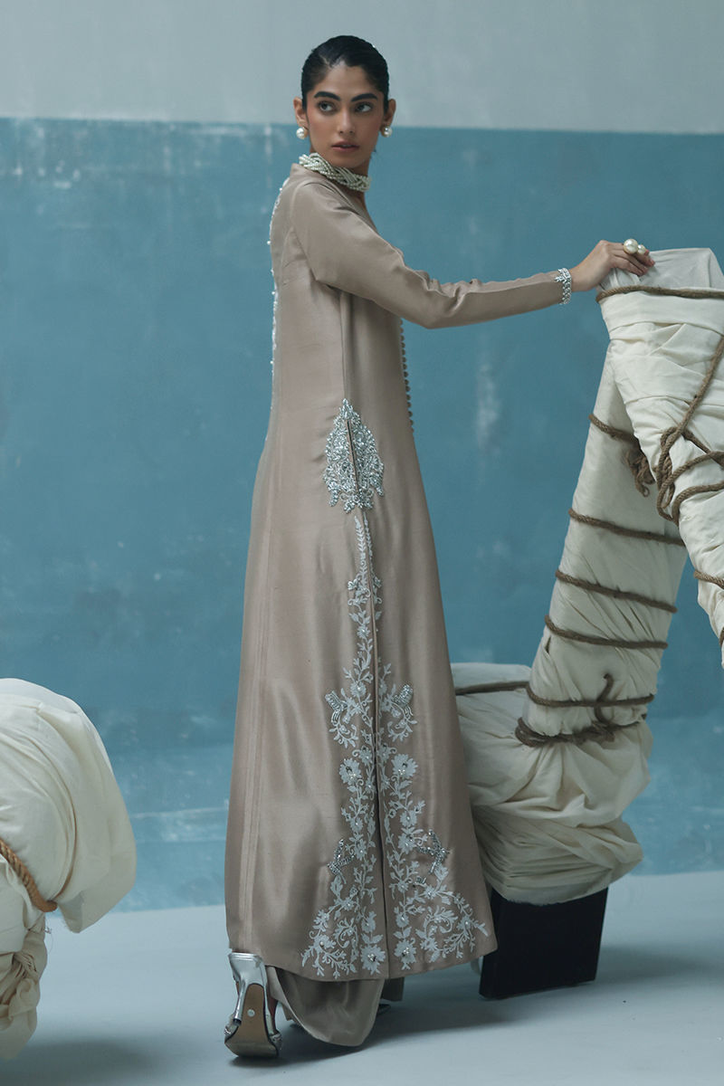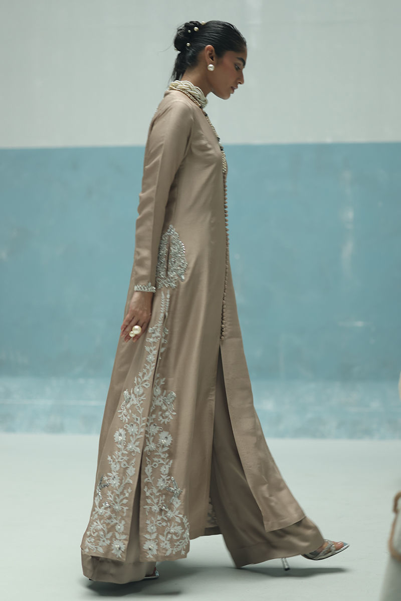 A front-open Prince panel shirt crafted from pure raw silk 80 gms in beige, adorned with resham ari work and detailed hand embroidery featuring dabka, pearls, sequins, tikki stones, cutdana, and nakshi. Paired with beige shimmer crepe culottes, this ensemble exudes timeless elegance with artisanal finesse.