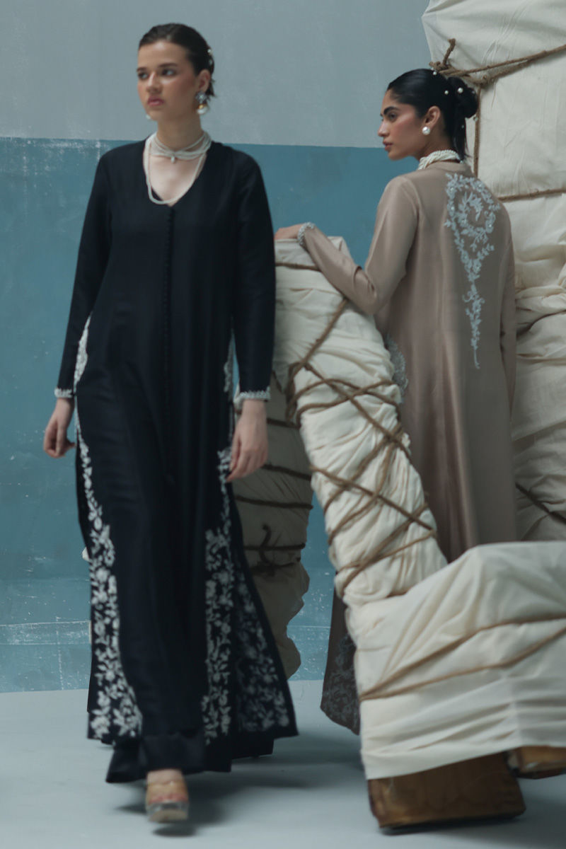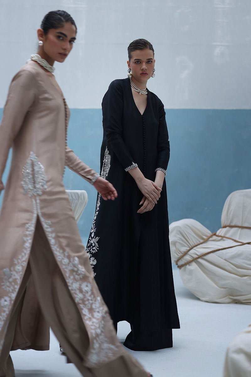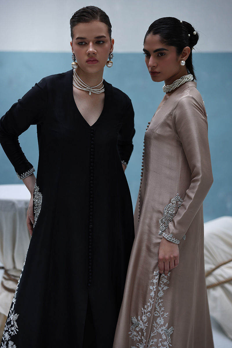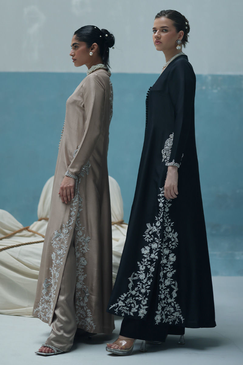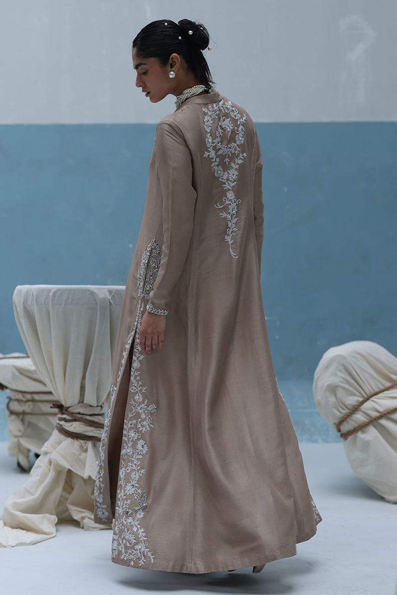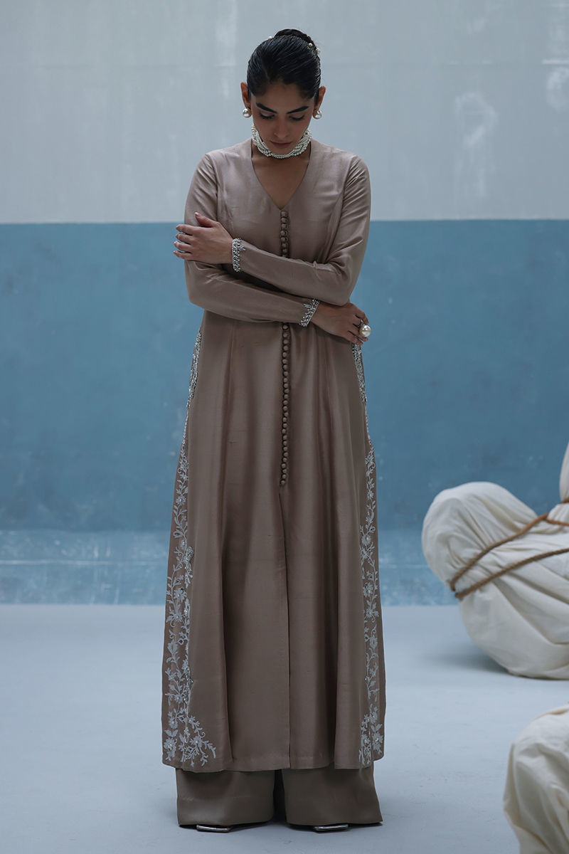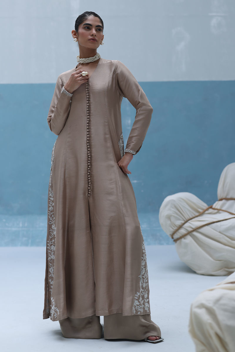 A front-open Prince panel shirt crafted from pure raw silk 80 gms in beige, adorned with resham ari work and detailed hand embroidery featuring dabka, pearls, sequins, tikki stones, cutdana, and nakshi. Paired with beige shimmer crepe culottes, this ensemble exudes timeless elegance with artisanal finesse.