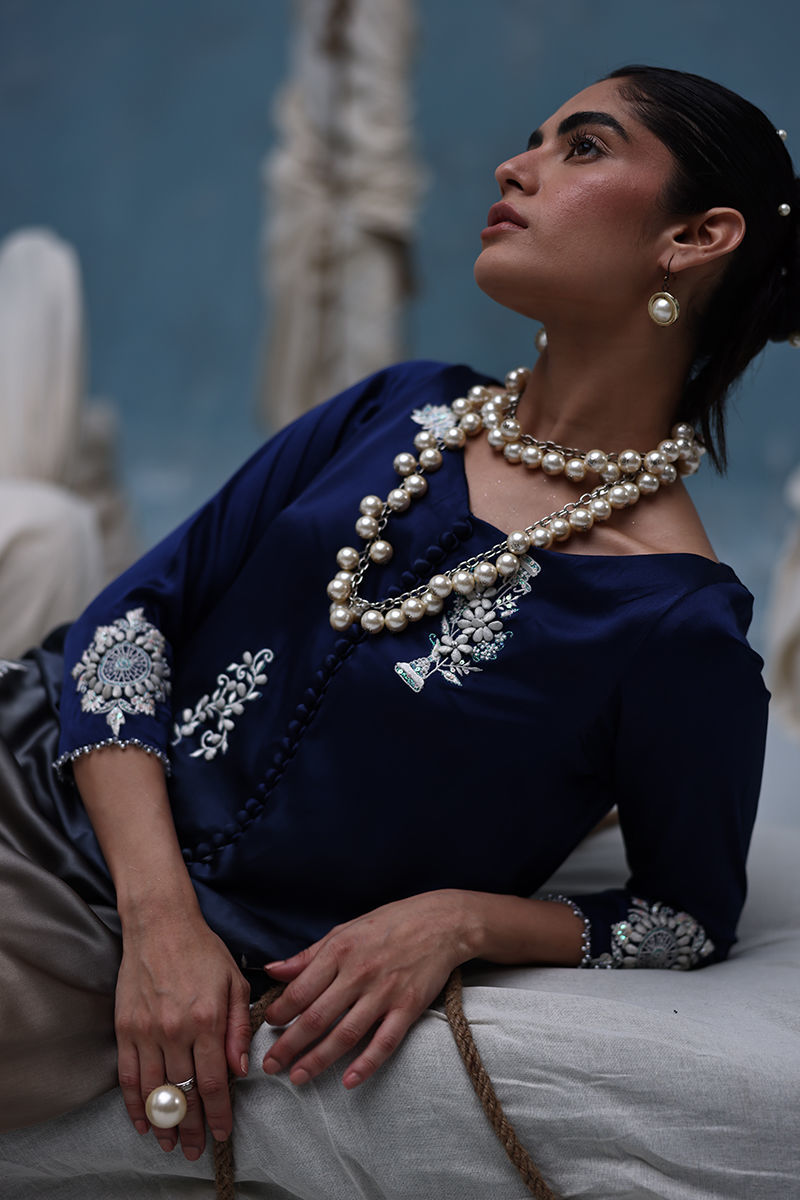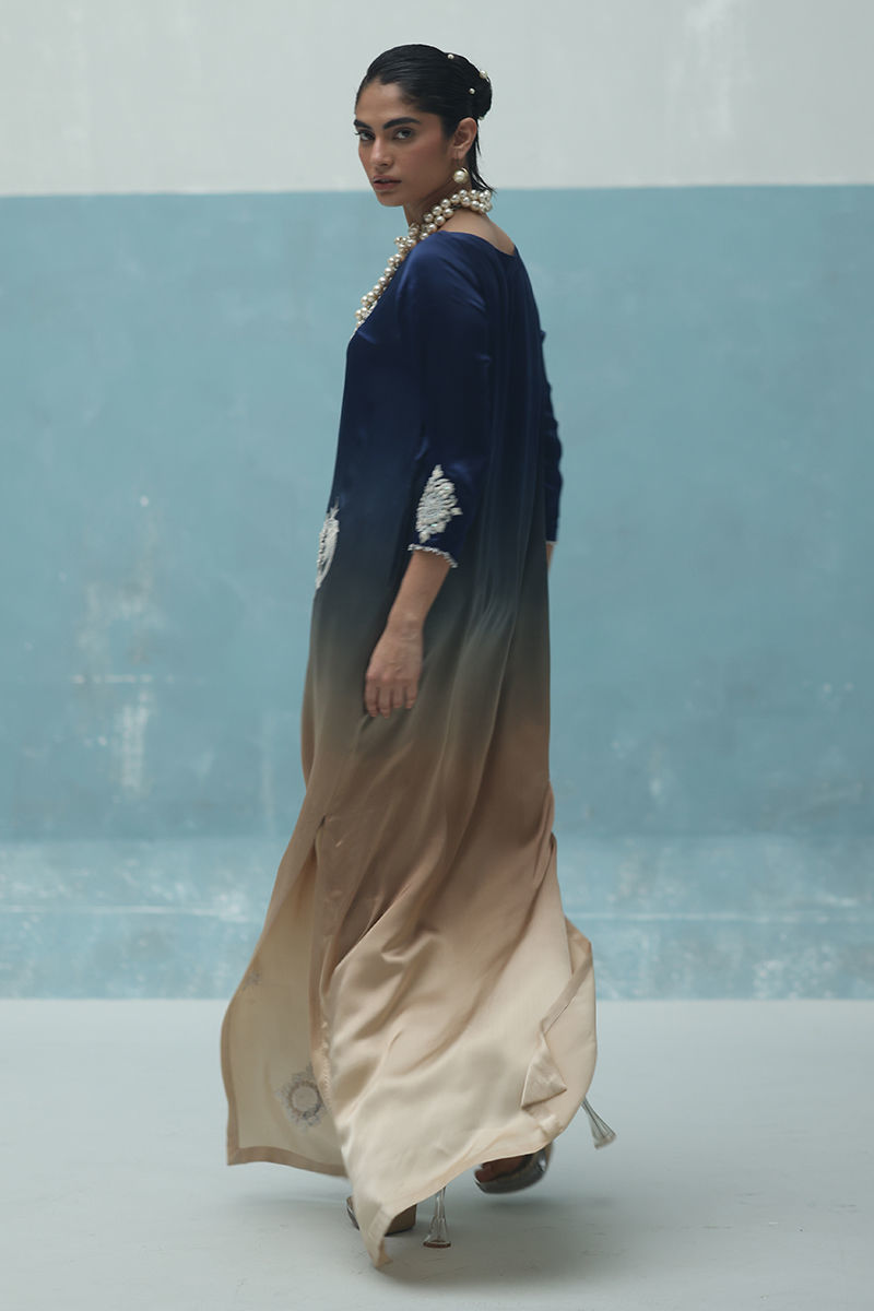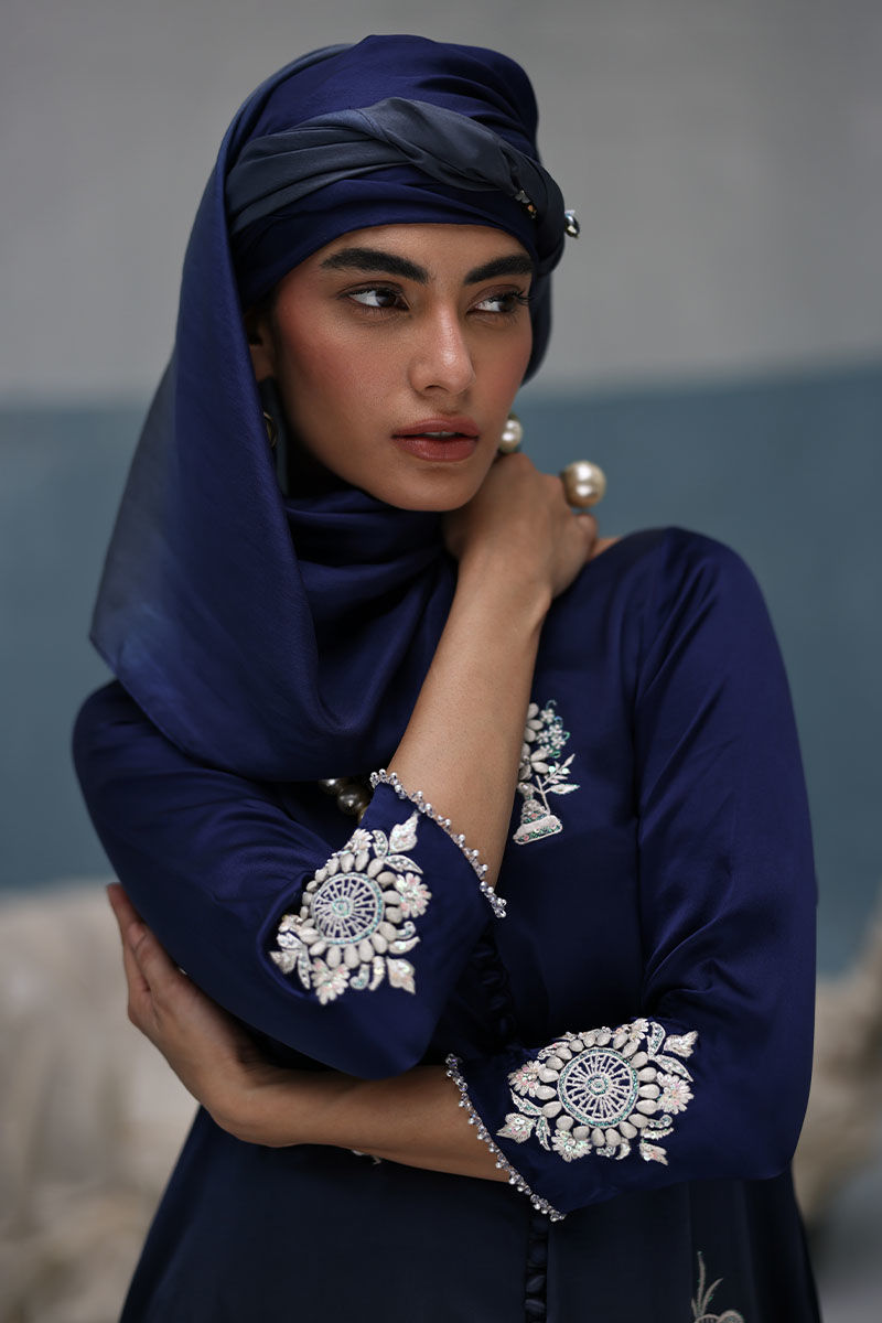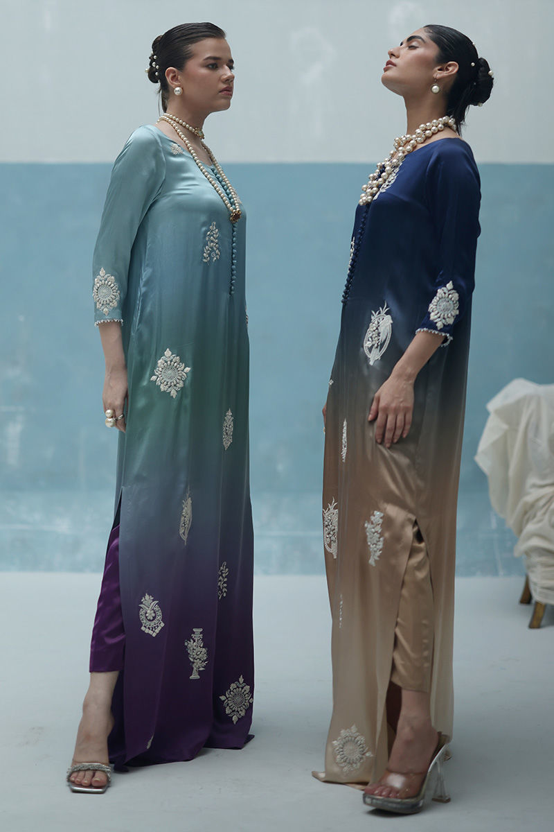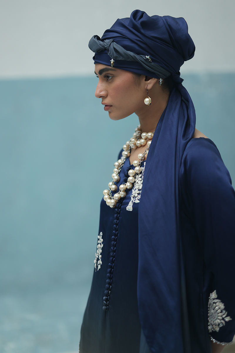 Step into elegance with this ensemble in rich True Blue, showcasing a Charmeuse Silk Kaftan embellished with ivory resham bunches and detailed hand embroidery—tikki stones, moti, cutdana, 3D patti work, and crystal hangings on the sleeves. Complemented by Crepe Silk Pants and a Pure Medium Silk Scarf with an ombré pallu and crystal accents.
