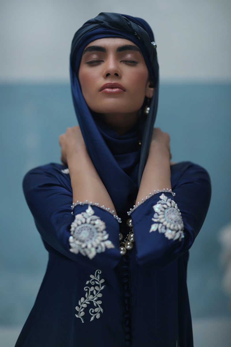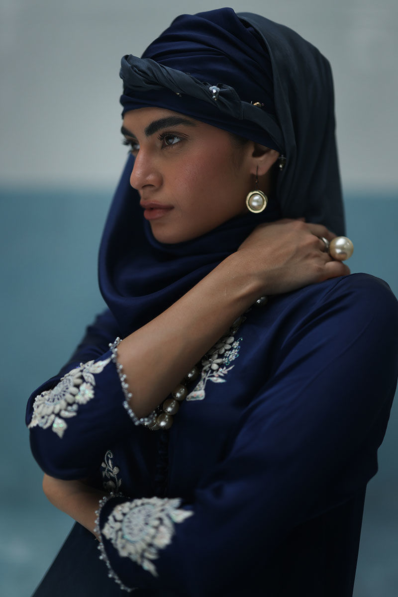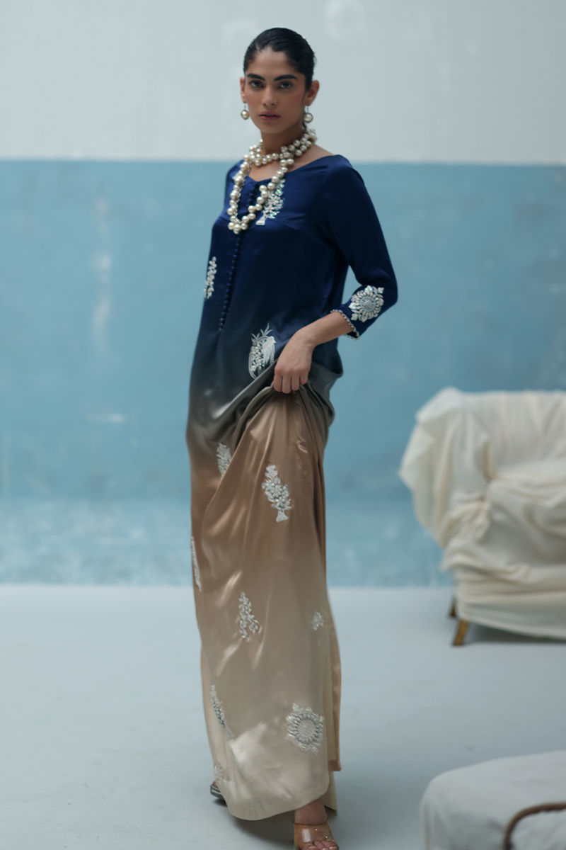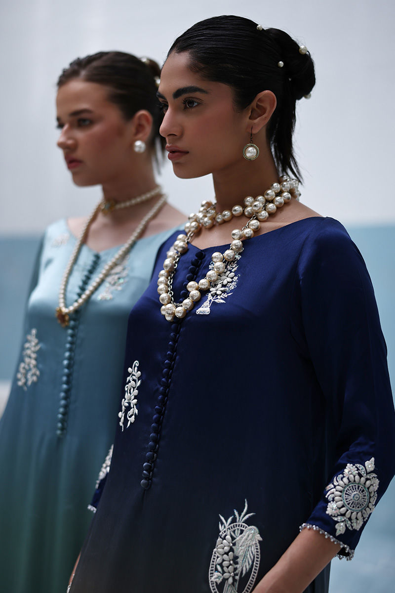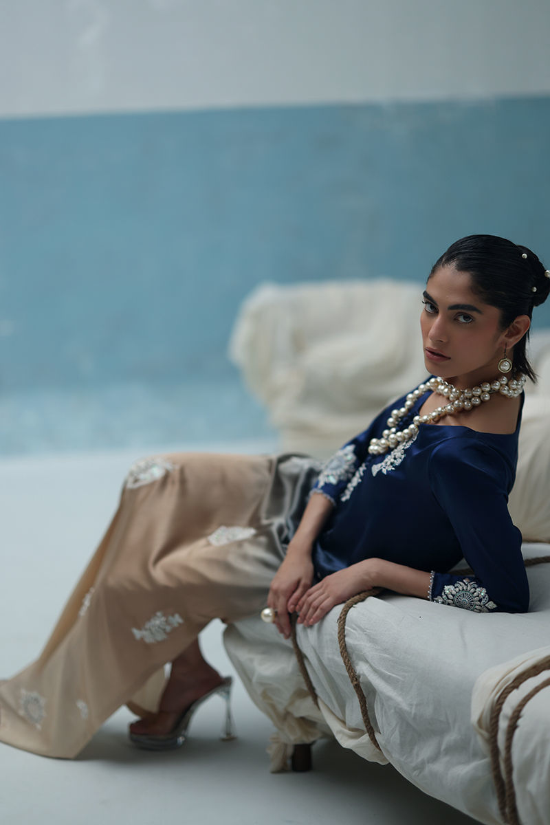 Step into elegance with this ensemble in rich True Blue, showcasing a Charmeuse Silk Kaftan embellished with ivory resham bunches and detailed hand embroidery—tikki stones, moti, cutdana, 3D patti work, and crystal hangings on the sleeves. Complemented by Crepe Silk Pants and a Pure Medium Silk Scarf with an ombré pallu and crystal accents.