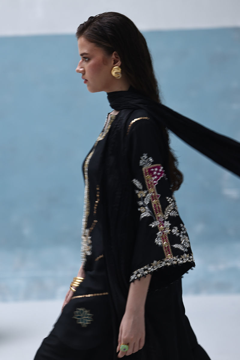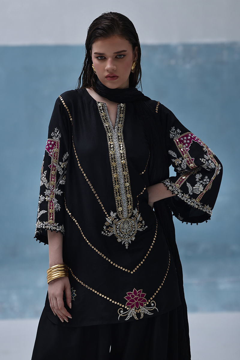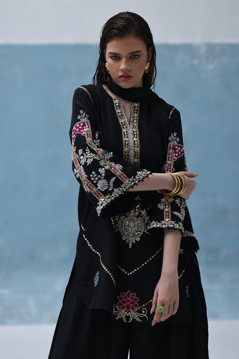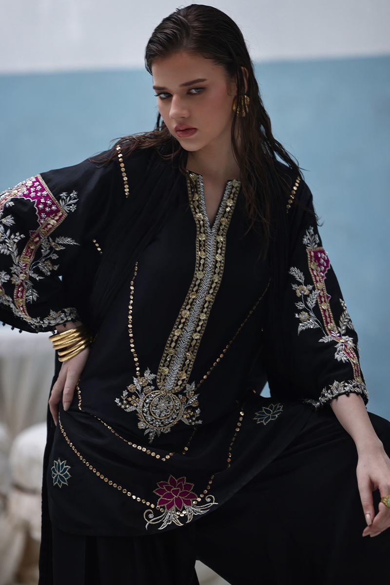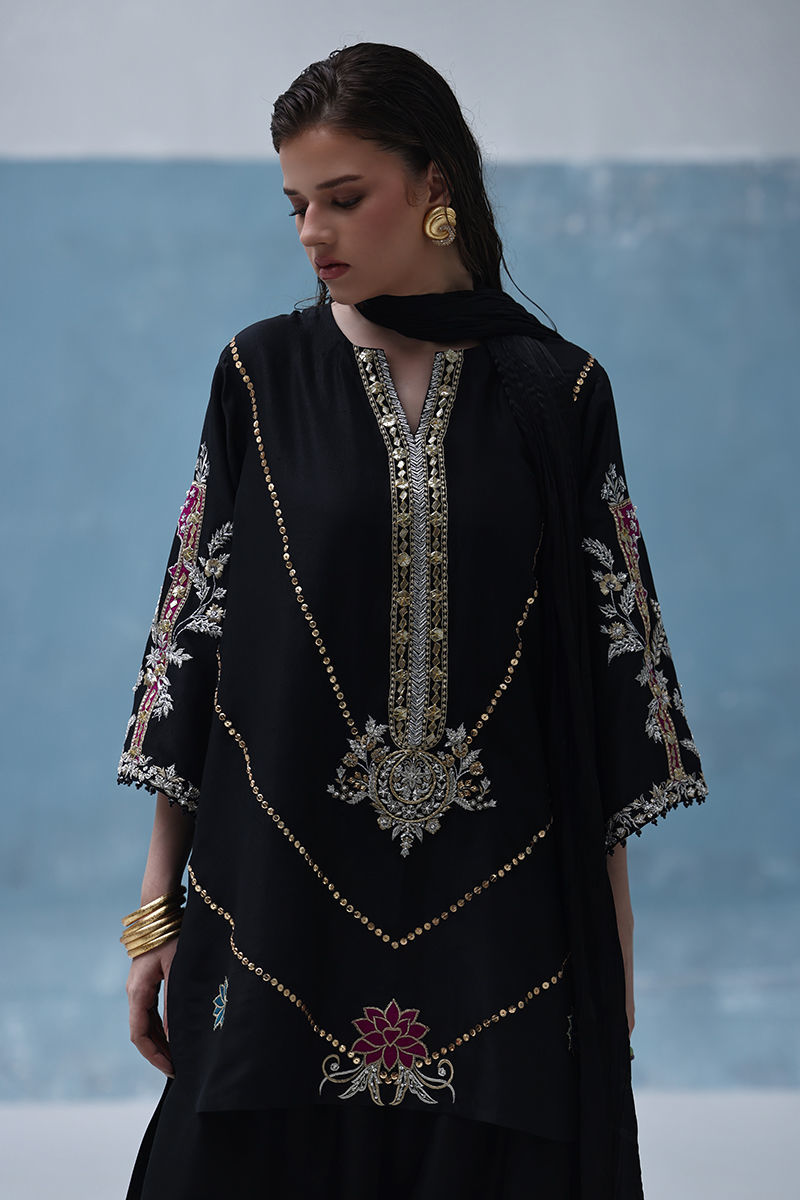 Black pure raw silk 80 gms loose-cut kurta with gold and silver zari embroidery, colored applique, and handwork using gota, sequins, cutdana, kora, dabka, naqshi, tikki stones, pearls, and moti. Crystal hangings on sleeve edges. Paired with pure raw silk Farshi culottes handworked and zari embroidery and a dupatta finished with crushed crystal hangings on the pallu.