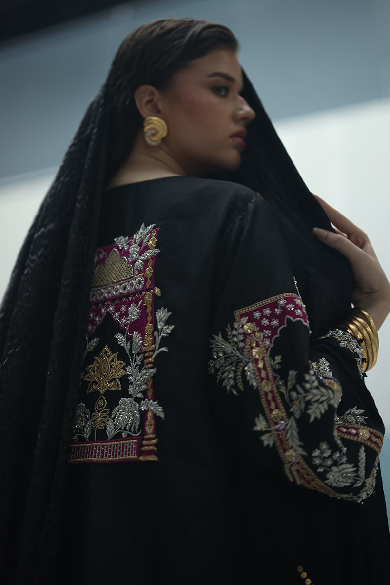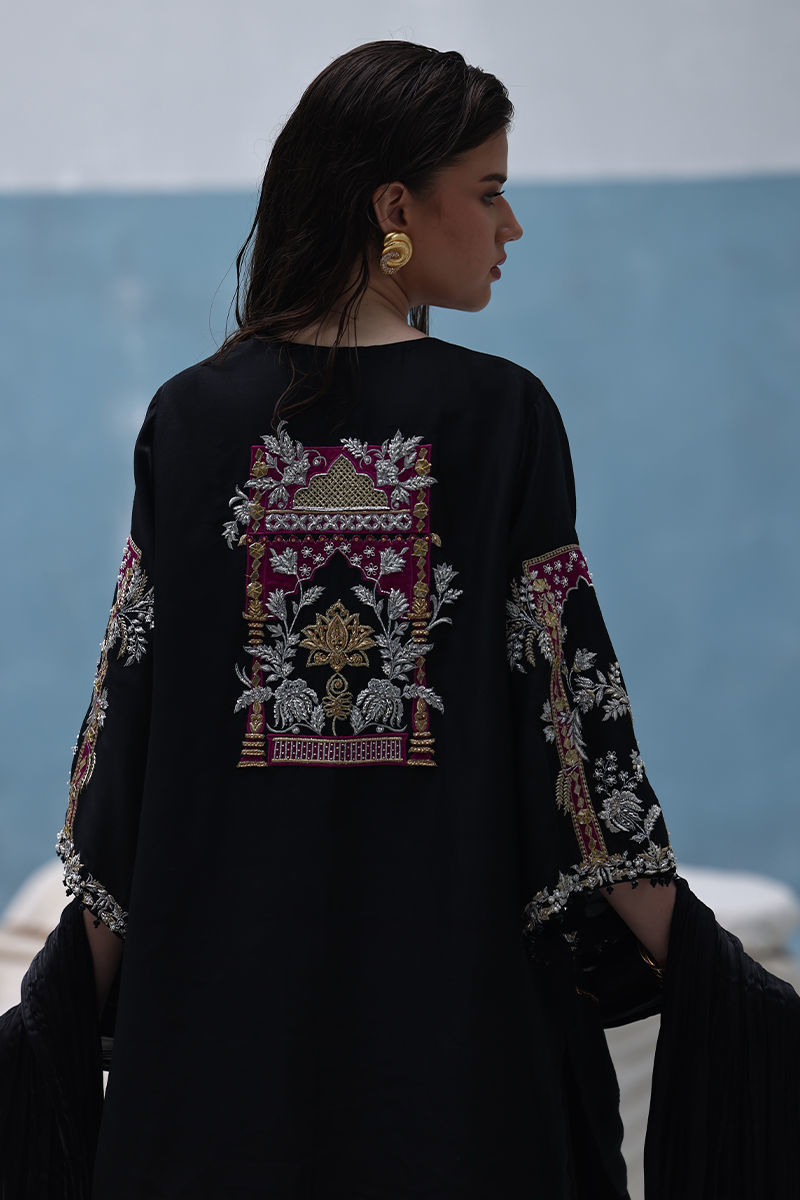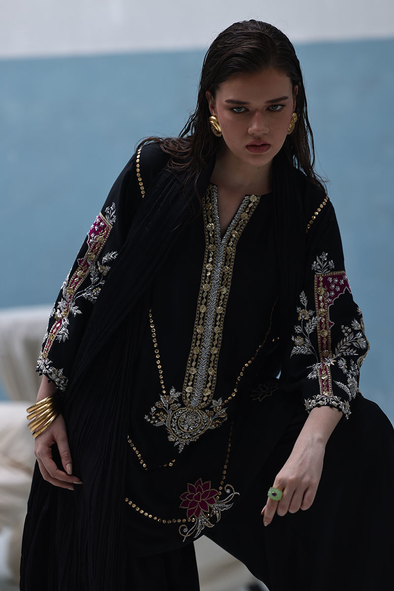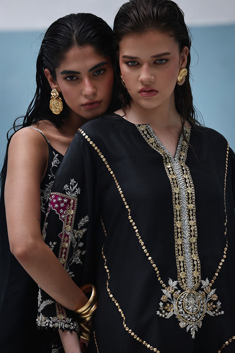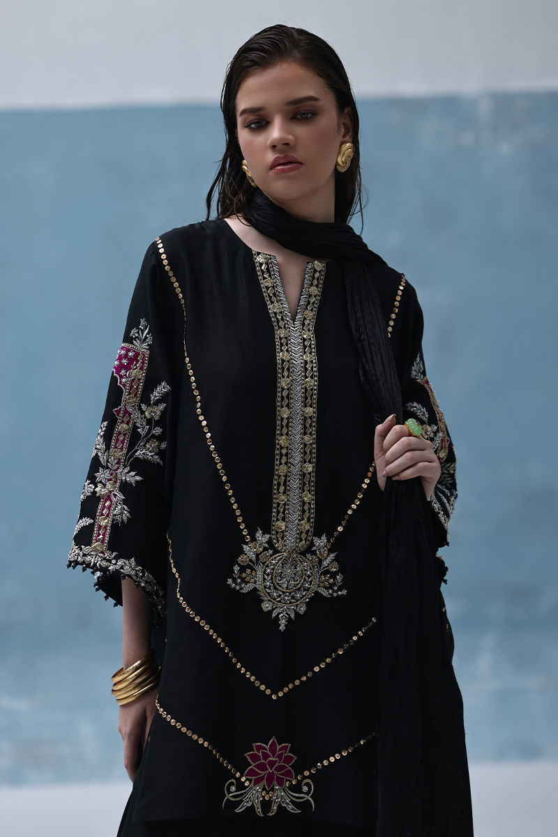 Black pure raw silk 80 gms loose-cut kurta with gold and silver zari embroidery, colored applique, and handwork using gota, sequins, cutdana, kora, dabka, naqshi, tikki stones, pearls, and moti. Crystal hangings on sleeve edges. Paired with pure raw silk Farshi culottes handworked and zari embroidery and a dupatta finished with crushed crystal hangings on the pallu.