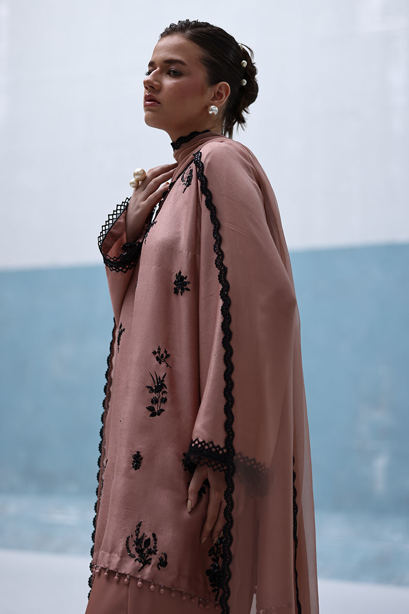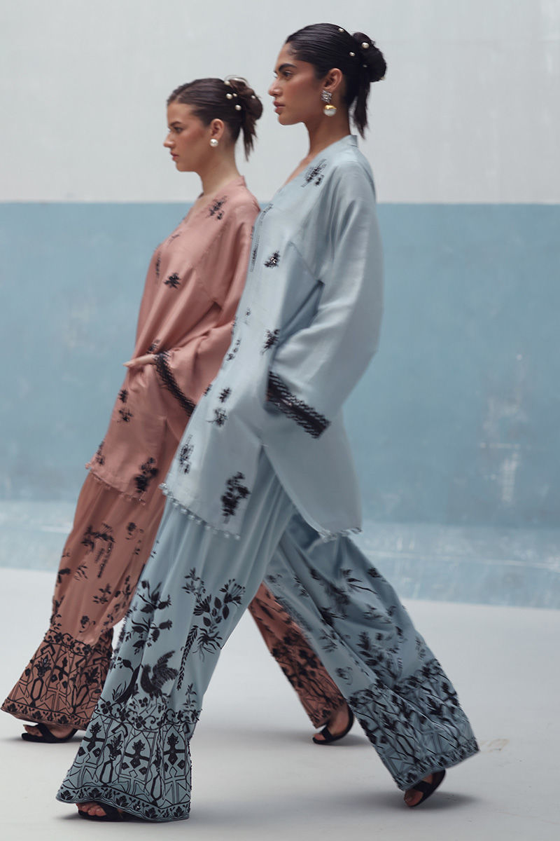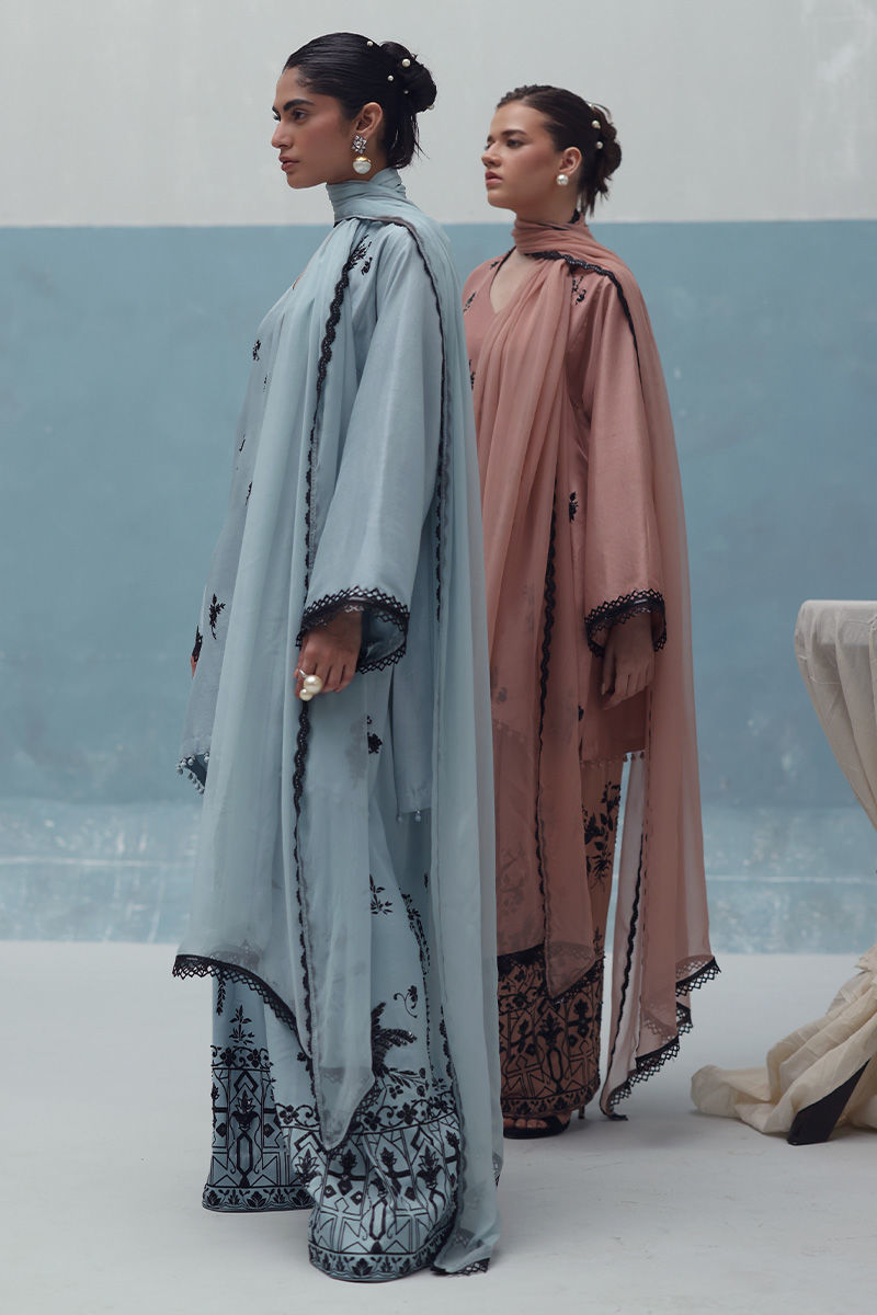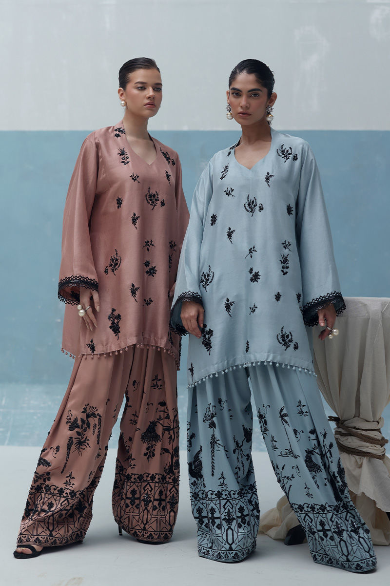 Loose-cut pure raw silk kurta 80 gms with all-over screen-printed bunches, adorned with handwork of cutdana, crystals, moti, sequins, and 3D flowers. Paired with crepe silk Farshi shalwar featuring screen print and hand embellishment, and a crinkle chiffon dupatta finished with lace on all four sides.