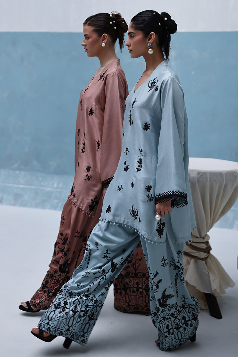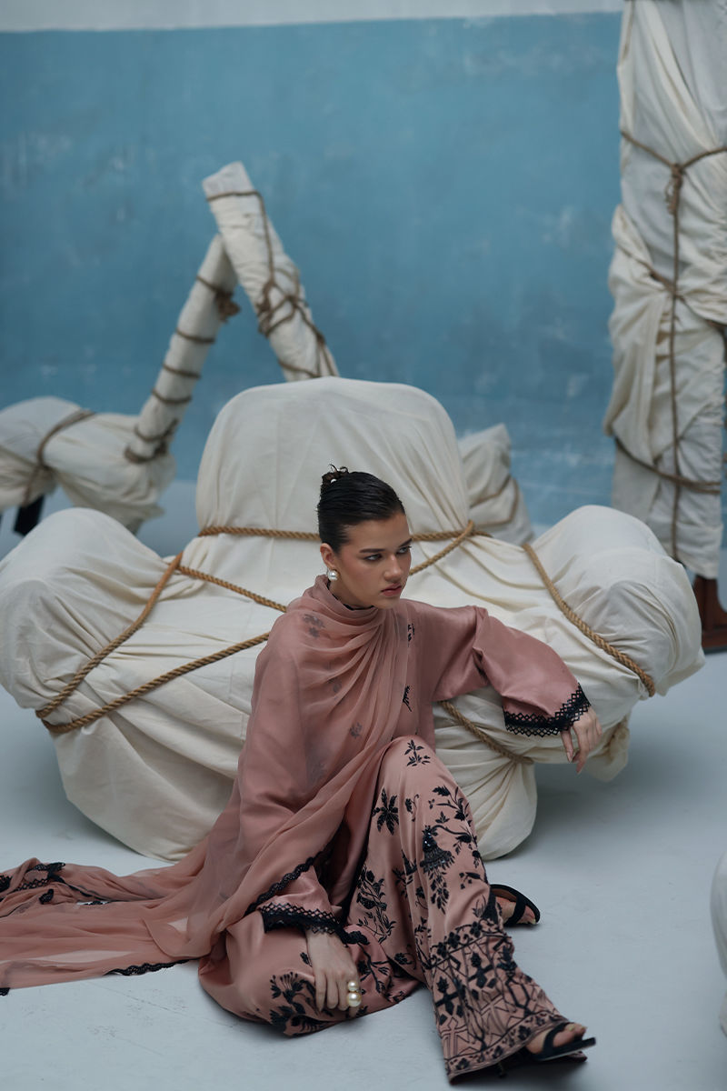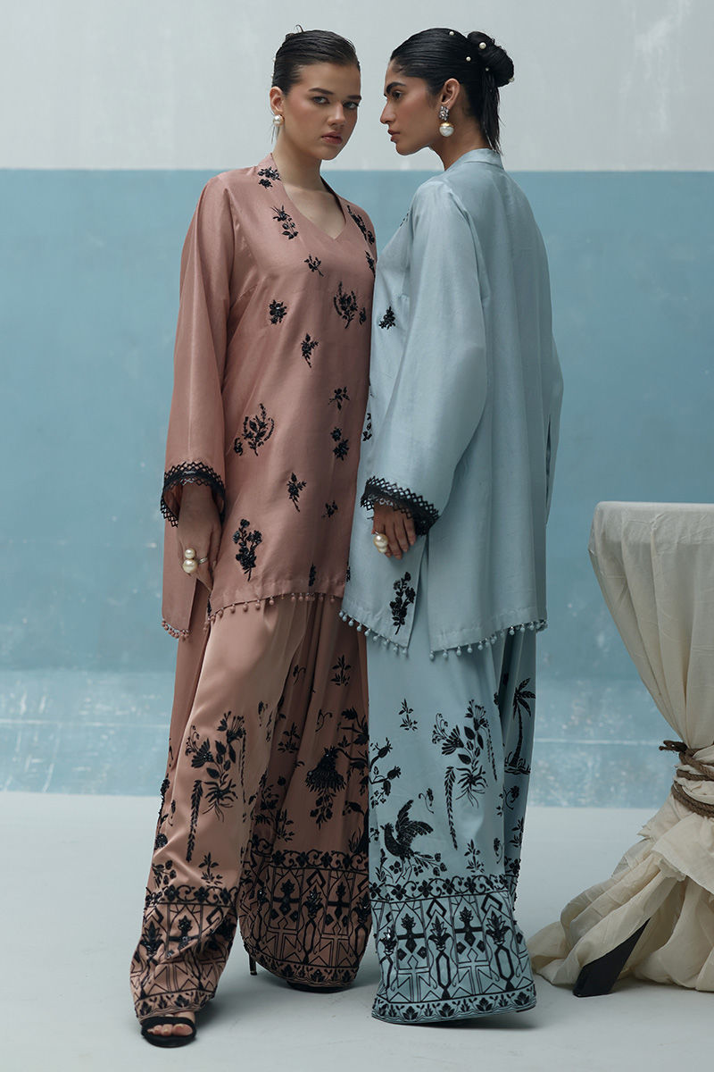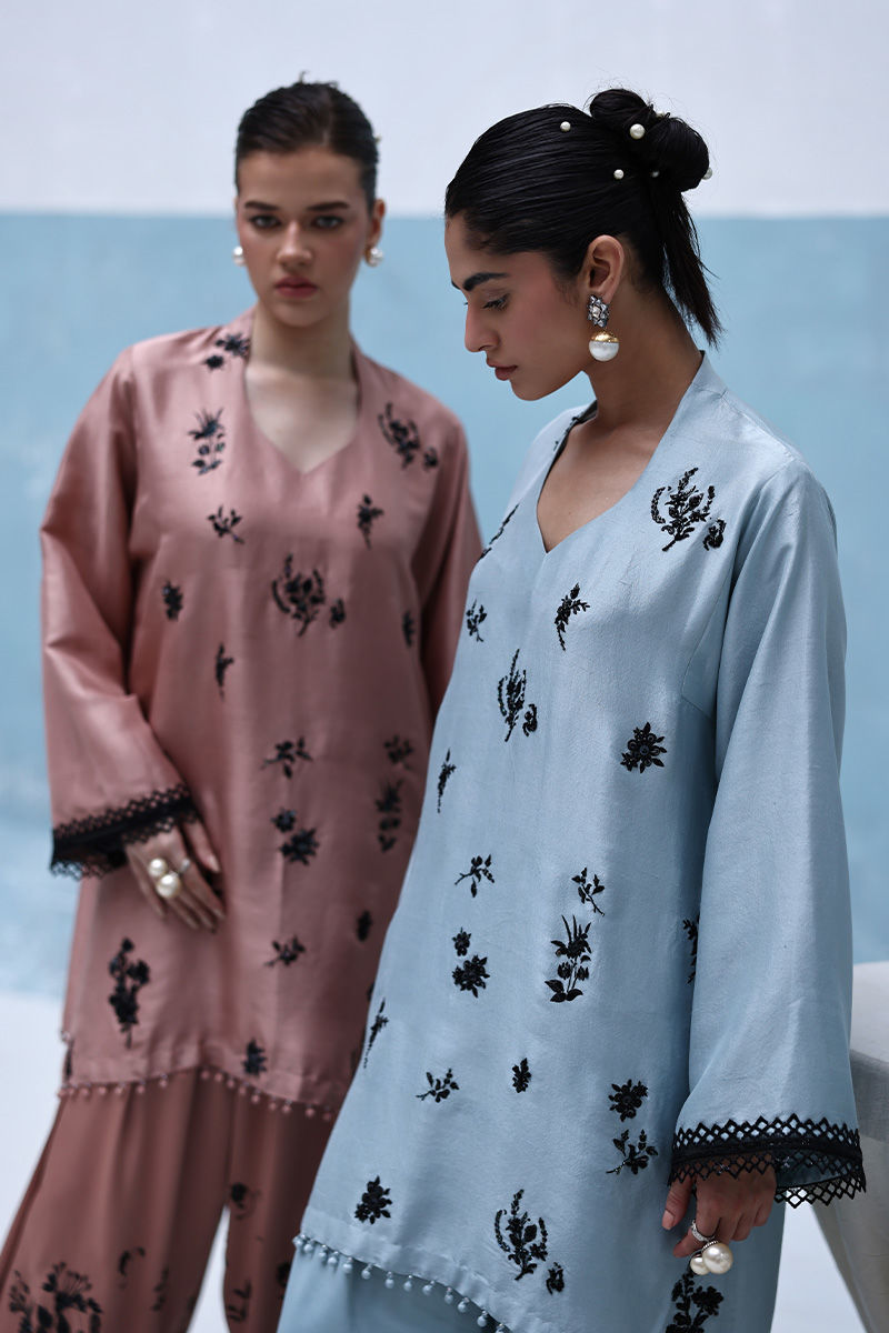 Loose-cut pure raw silk kurta 80 gms with all-over screen-printed bunches, adorned with handwork of cutdana, crystals, moti, sequins, and 3D flowers. Paired with crepe silk Farshi shalwar featuring screen print and hand embellishment, and a crinkle chiffon dupatta finished with lace on all four sides.