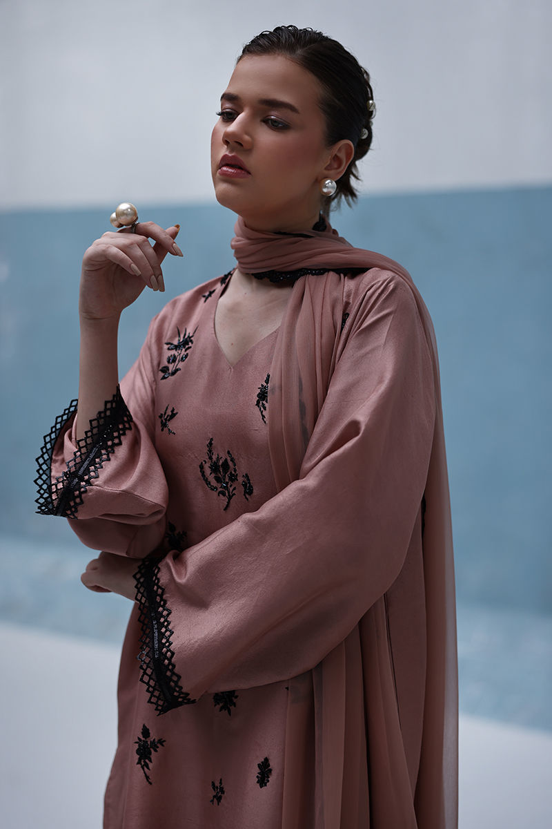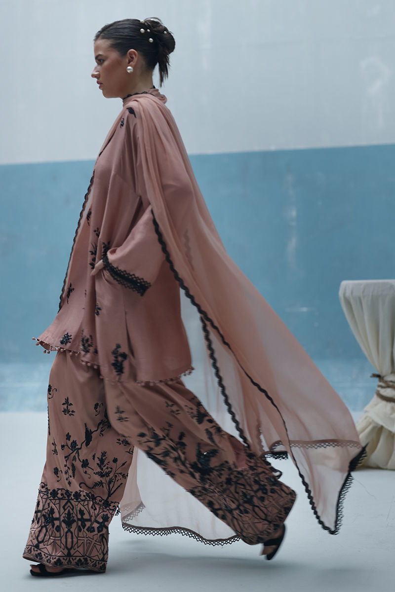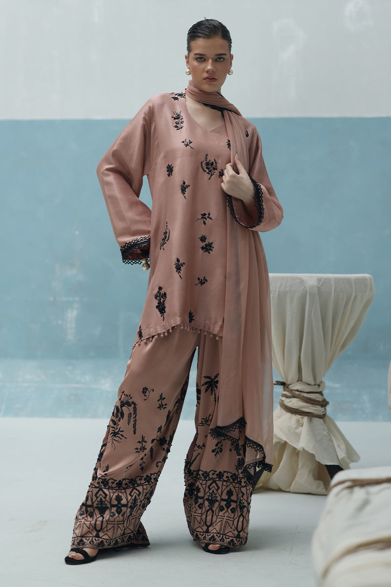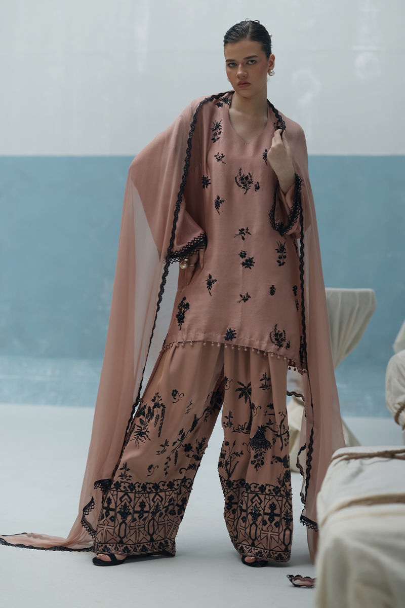 Color: Nude Fabric: Loose Cut Kurta: Pure Raw Silk and Farshi Shalwar: Crepe Silk and Dupatta: Chiffon Work Details: Embroidered and Embellished