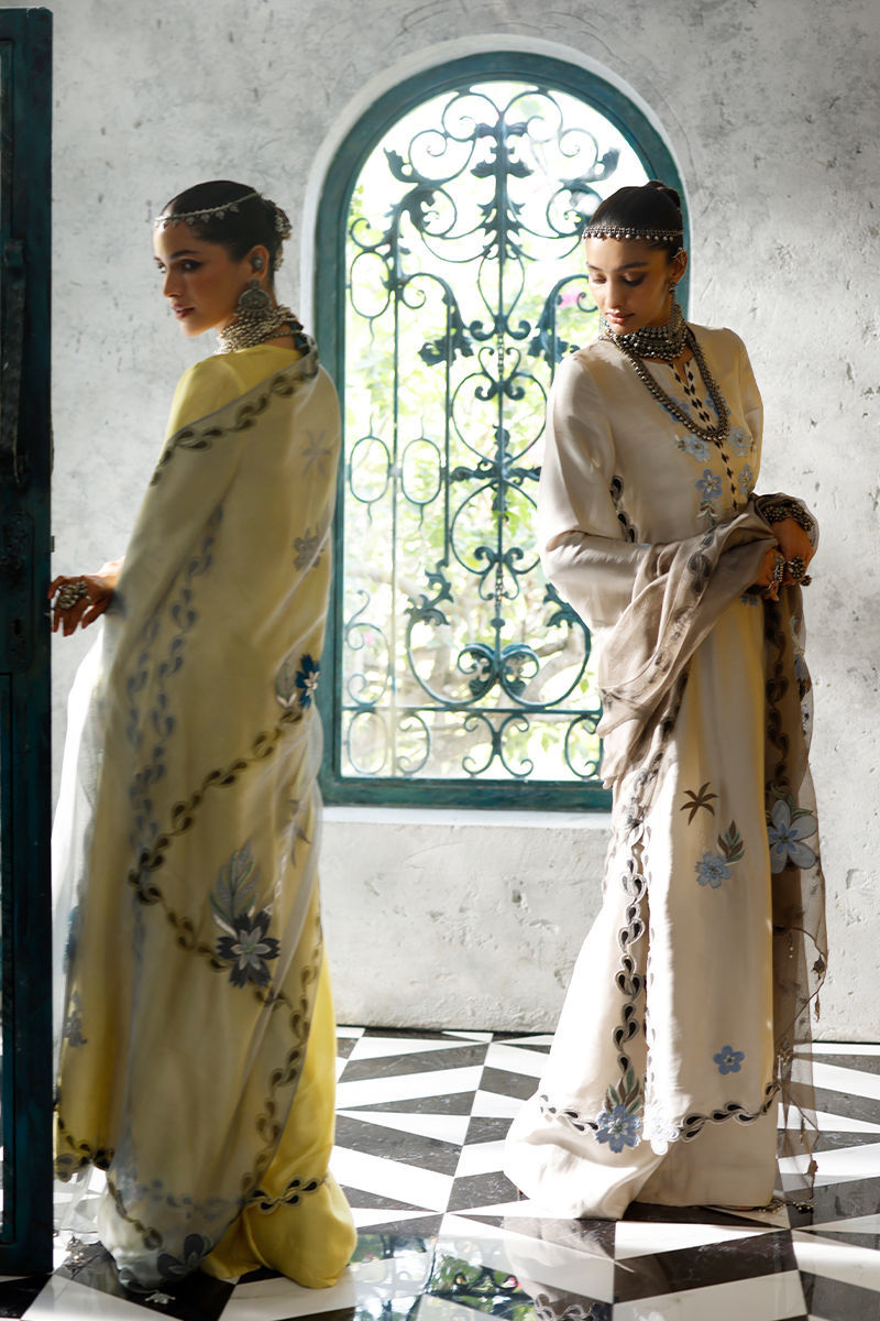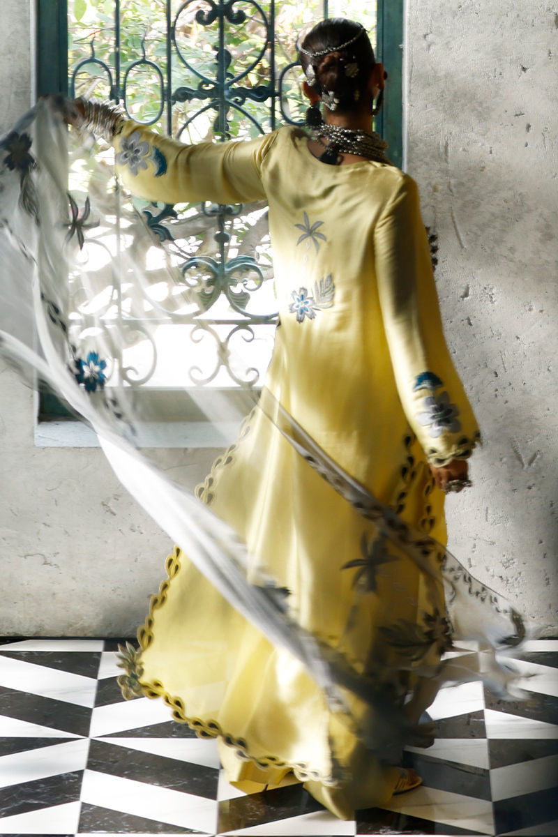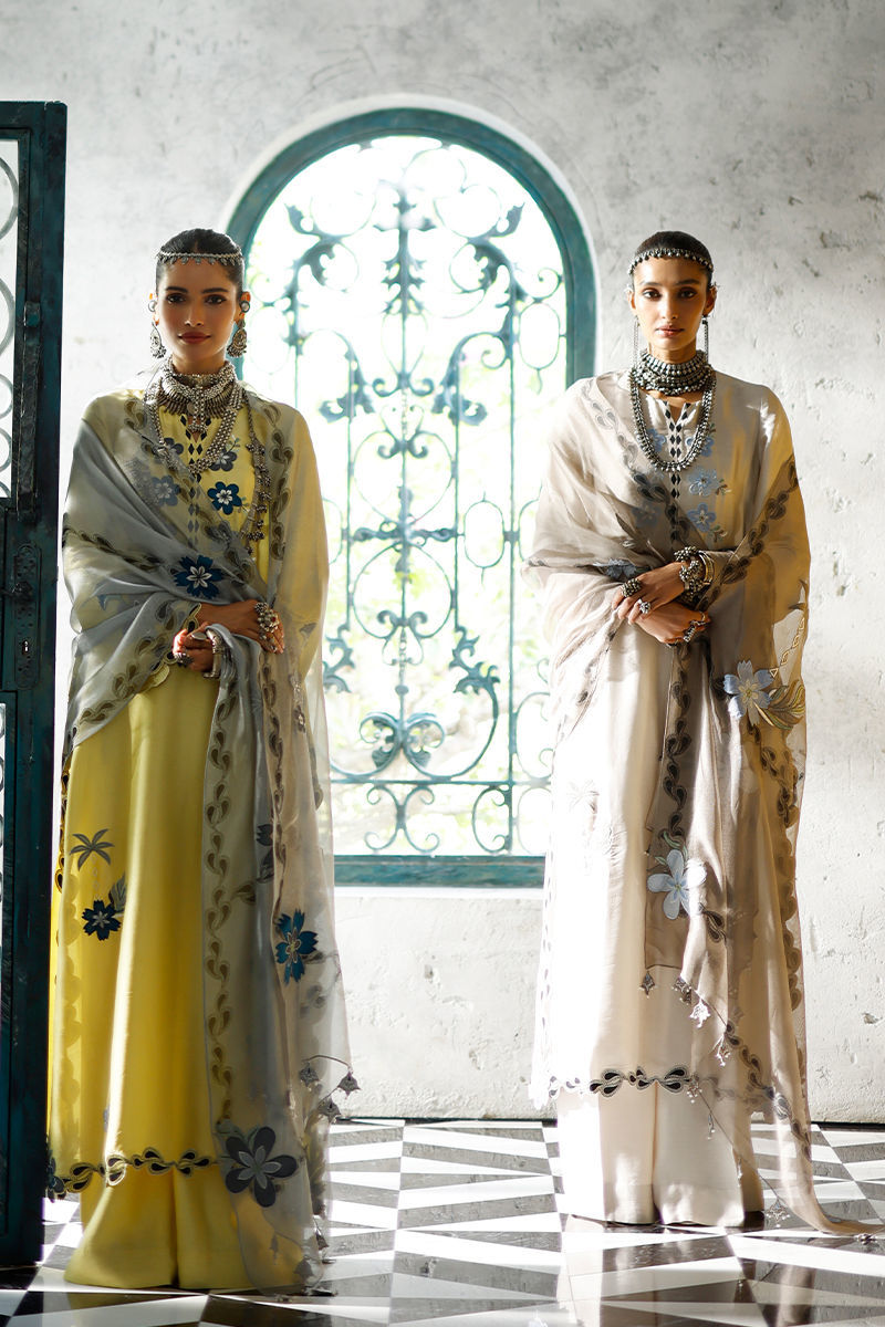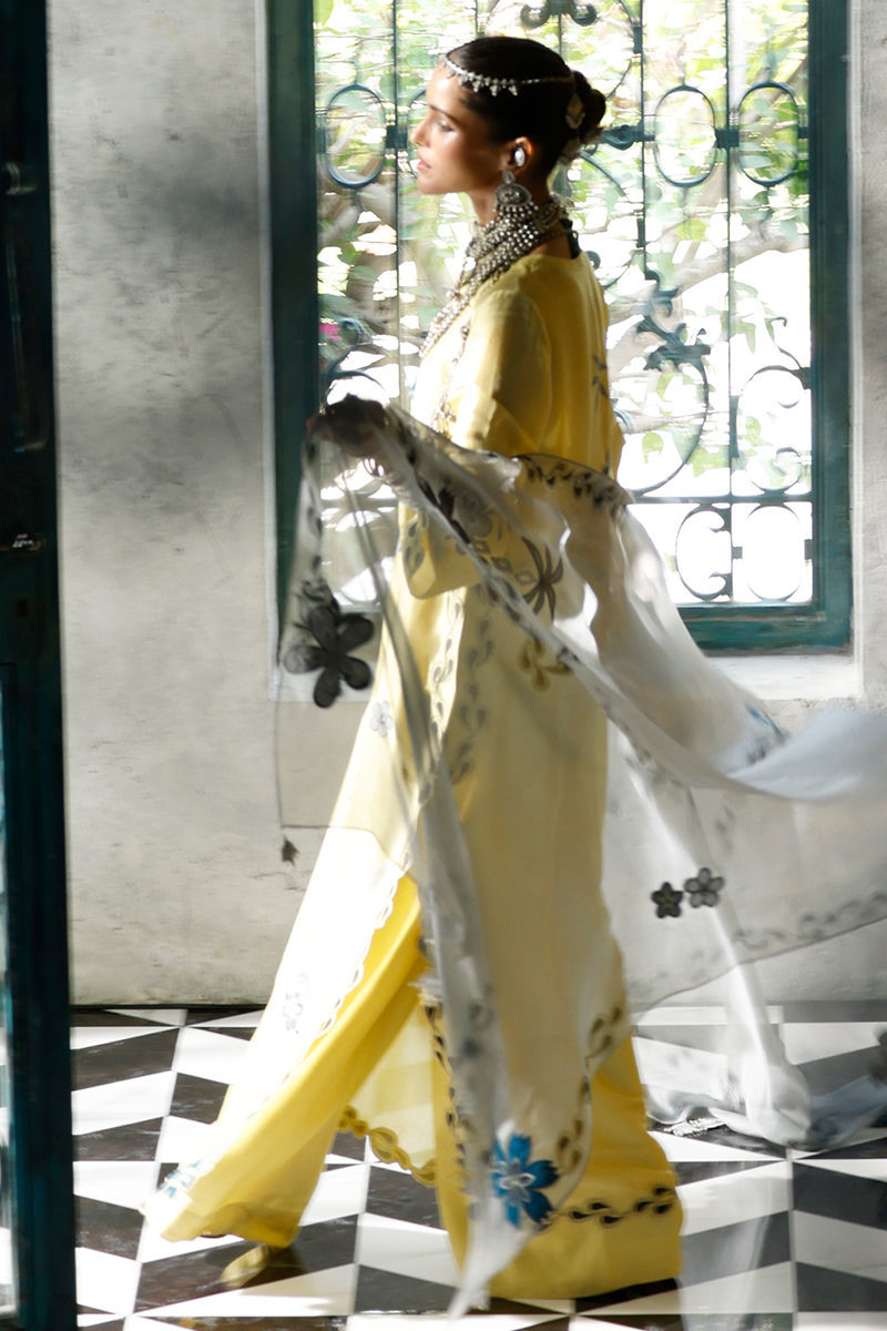 The lime light long shirt, crafted from butter silk, features a vibrant screen print with coloured appliqué work and intricate resham embroidery across the front, back, and sleeves, finished with pockets. It is paired with pure cotton silk culottes for a fluid silhouette. The look is completed with a grey shisha net dupatta, adorned with matching screen print, coloured appliqué work, resham embroidery, and handmade tassels for an artisanal finish.