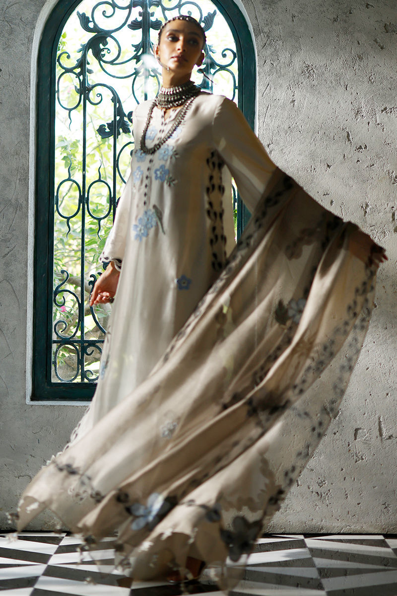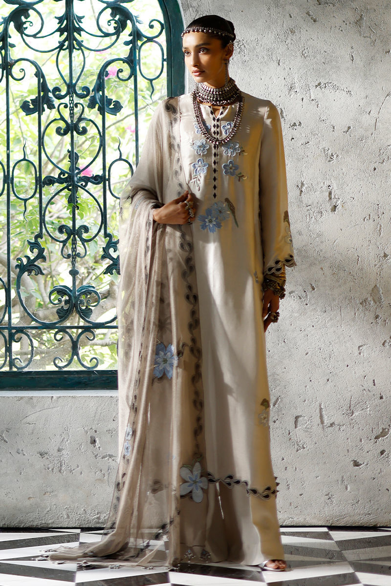 The Cloud Dancer long shirt, crafted from butter silk, features a vibrant screen print with coloured appliqué work and intricate resham embroidery across the front, back, and sleeves, finished with pockets. It is paired with pure cotton silk culottes for a fluid, elegant silhouette. The look is completed with a Moon Rock shisha net dupatta, adorned with coordinated screen print, coloured appliqué work, resham embroidery, and handmade tassels for a refined, artisanal finish.